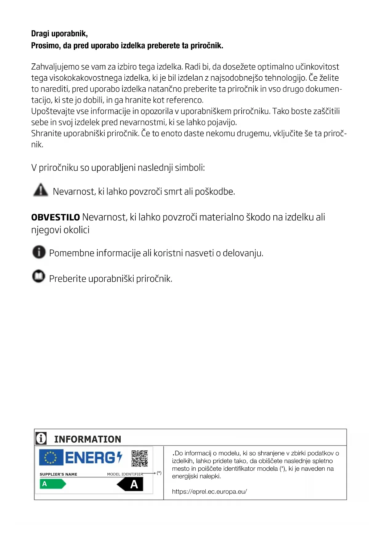 UPOZORENJE: Ako problem i dalje postoji nakon što ste slijedeli upute u ovom poglavlju, obratite se prodavcu ili ovlaštenom servisu. Nemojte pokušavati popraviti proizvod.Dragi uporabnik, Prosimo, da pred uporabo izdelka preberete ta priročnik. Zahvaljujemo se vam za izbiro tega izdelka. Radi bi, da dosežete optimalno učinkovitost tega visokokakovostnega izdelka, ki je bil izdelan z najsodobnejšo tehnologijo. Če želite to narediti, pred uporabo izdelka natančno preberite ta priročnik in vso drugo dokumen- tacijo, ki ste jo dobili, in ga hranite kot referenco. Upoštevajte vse informacije in opozorila v uporabniškem priročniku. Tako boste zaščitili sebe in svoj izdelek pred nevarnostmi, ki se lahko pojavijo. Shranite uporabniški priročnik. Če to enoto daste nekomu drugemu, vključite še ta priroč- nik. V priročniku so uporabljeni naslednji simboli: Nevarnost, ki lahko povzroči smrt ali poškodbe. OBVESTILO Nevarnost, ki lahko povzroči materialno škodo na izdelku ali njegovi okolici Pomembne informacije ali koristni nasveti o delovanju. Preberite uporabniški priročnik. .Do informacij o modelu, ki so shranjene v zbirki podatkov o izdelkih, lahko pridete tako, da obiščete naslednje spletno mesto in poiščete identifikator modela (*), ki je naveden na energijski nalepki.https://eprel.ec.europa.eu/