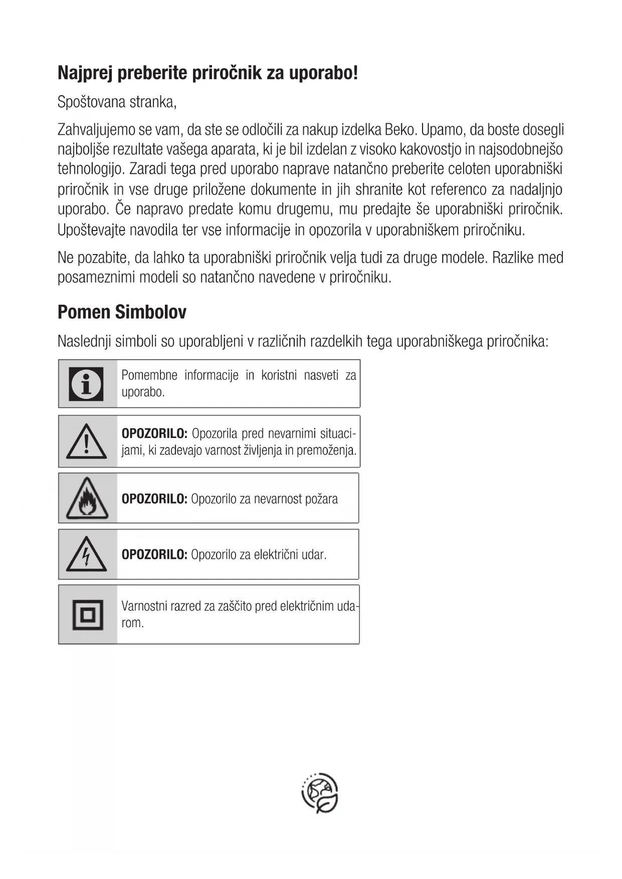Xử lý sự cốNajprej preberite priročnik za uporabo! Spoštovana stranka, Zahvaljujemo se vam, da ste se odločili za nakup izdelka Beko. Upamo, da boste dosegli najboljše rezultate vašega aparata, ki je bil izdelan z visoko kakovostjo in najsodobnejšo tehnologijo. Zaradi tega pred uporabo naprave natančno preberite celoten uporabniški priročnik in vse druge priložene dokumente in jih shranite kot referenco za nadaljnjo uporabo. Če napravo predate komu drugemu, mu predajte še uporabniški priročnik. Upoštevajte navodila ter vse informacije in opozorila v uporabniškem priročniku. Ne pozabite, da lahko ta uporabniški priročnik velja tudi za druge modele. Razlike med posameznimi modeli so natančno navedene v priročniku. Pomen Simbolov Naslednji simboli so uporabljeni v različnih razdelkih tega uporabniškega priročnika: