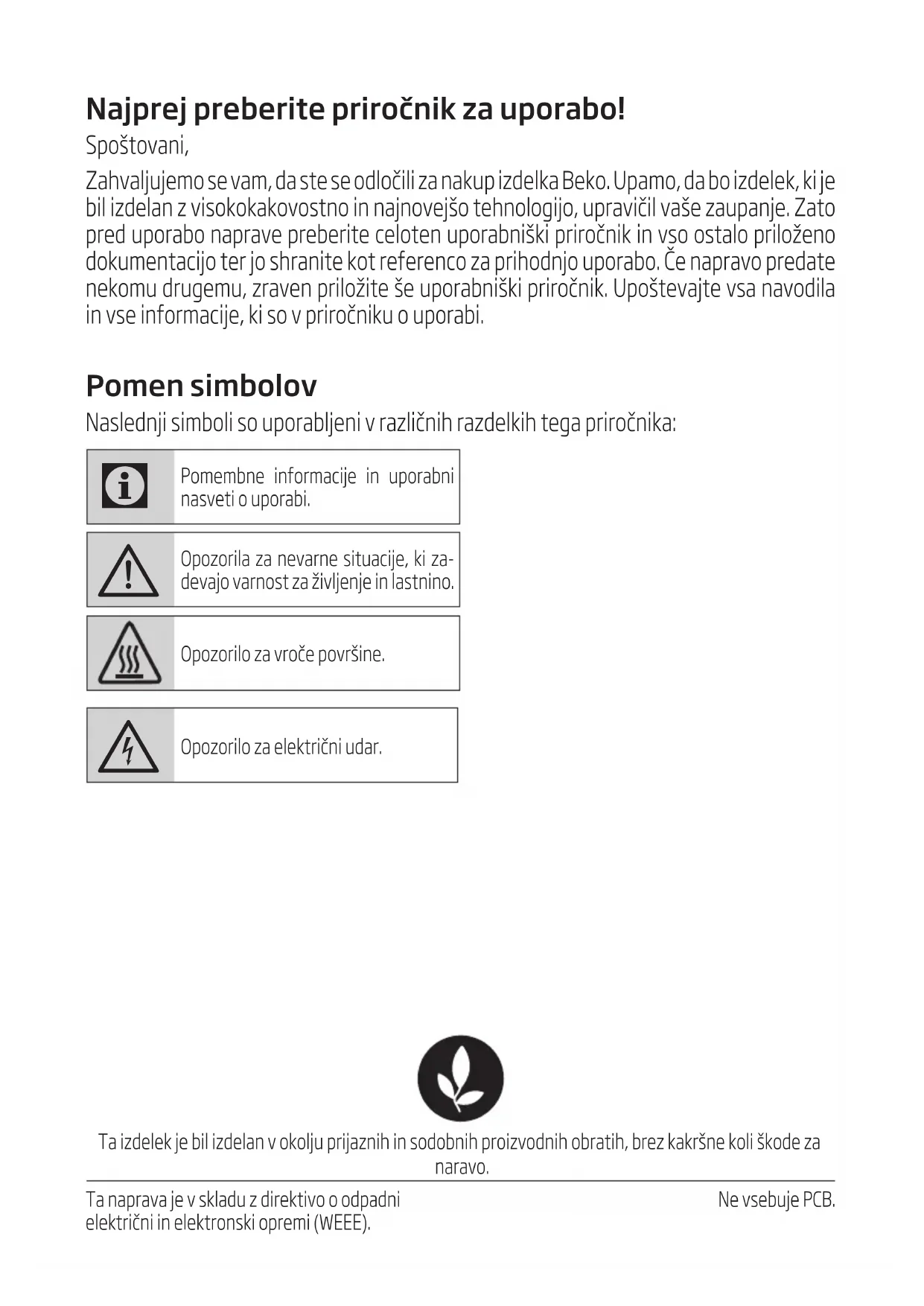 10 секунди.Najprej preberite priročnik za uporabo! Spoštovan, Zahvaljujemo se vam, da ste se odločl za nakup zdelka Beko. Upamo, da bo zdelek, k je bl zdelan z vsokokakovostno n najnovejšo tehnologjo, upravčl vaše zaupanje. Zato pred uporabo naprave preberte celoten uporabnšk prročnk n vso ostalo prloženo dokumentacjo ter jo shrante kot referenco za prhodnjo uporabo. Če napravo predate nekomu drugemu, zraven prložte še uporabnšk prročnk. Upoštevajte vsa navodla n vse nformacje, k so v prročnku o uporab. Pomen simbolov Naslednj smbol so uporabljen v razlčnh razdelkh tega prročnka: