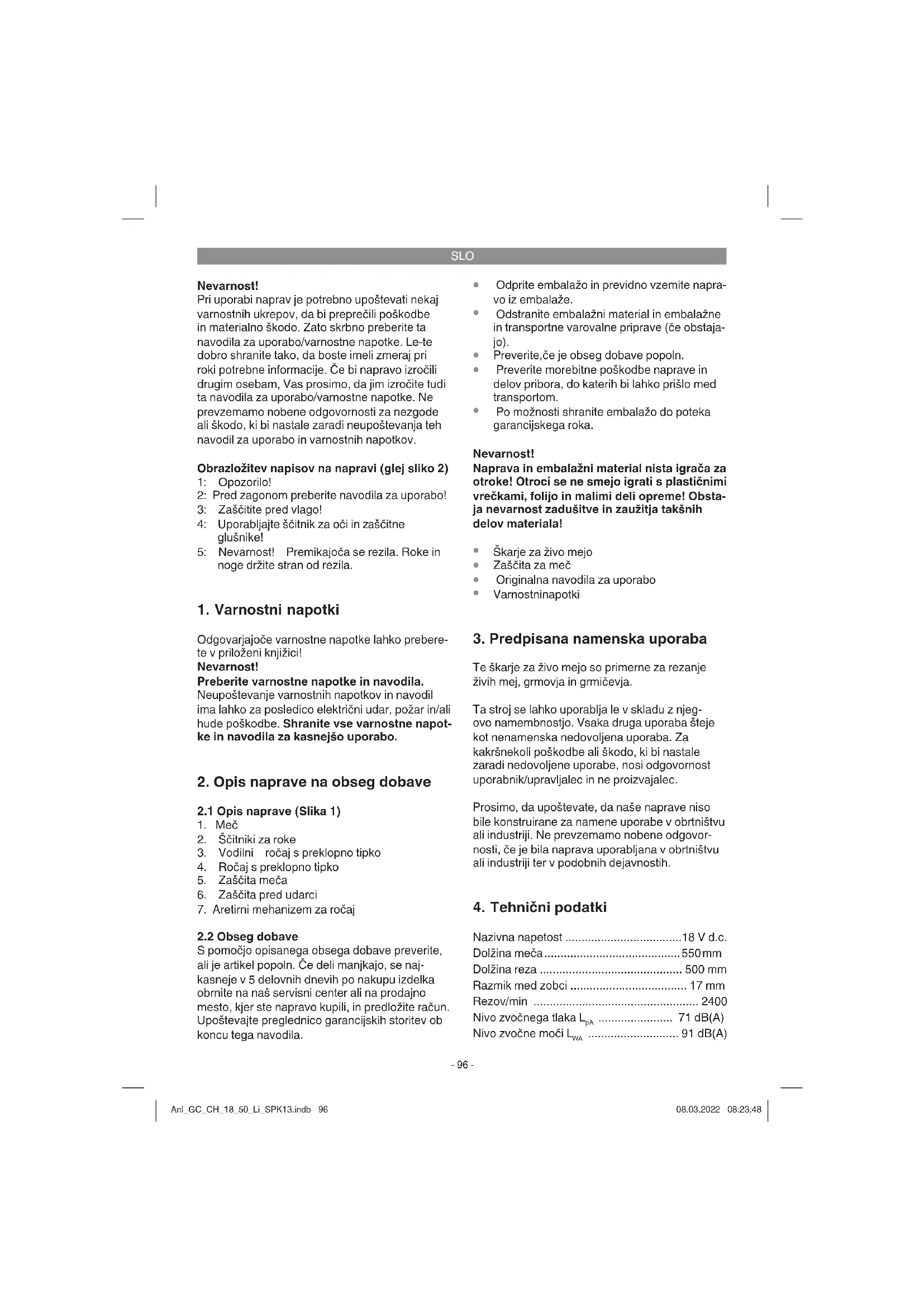 Samo za dežele EU Električnega orodja ne mečite med gospodinjske odpadke! V skladu z evropsko smernico 2012/19/EG o starih električnih in elektronskih napravah in v skladu z iz- vajanjem nacionalne zakonodaje morate ločeno zbirati izrabljena električna orodja in jih predati v okoljs- ko varno ponovno predelavo. Reciklažna alternativa za poziv za vračanje: Lastnik električne naprave je alternativno zavezan, da namesto vračanja sodeluje pri pri strokovno ustreznem recikliranju v primeru predaje lastnine. Staro napravo se lahko v ta namen tudi prepusti na odvzemnem mestu, ki izvaja odstranjevanje v smislu nacionalne zakonodaje o odstranjevanju takšnih odpadkov. To se ne nanaša na starim napravam priložene dele pribora in opreme brez električnih kom- ponent. Pred odstranjevanjem, iz naprave odstranite akumulator in svetilo (npr. žarnico). Ponatis ali kakršnokoli razmnoževanje dokumentacije in spremljajočih papirjev o proizvodu, tudi po izvlečkih, je dovoljeno samo z izrecnim soglasjem Einhell Germany AG. Pridržana pravica do tehničnih sprememb Anl_GC_CH_18_50_Li_SPK13.indb 101Anl_GC_CH_18_50_Li_SPK13.indb 101 08.03.2022 08:23:4908.03.2022 08:23:49SLO