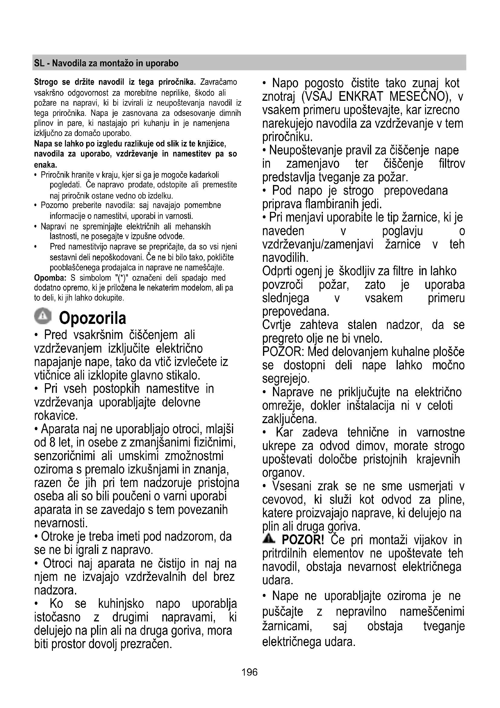 - Neupoštevanje pravil za čiščenje nape in zamenjavo ter čiščenje filtrov predstavlja tveganje za požar.