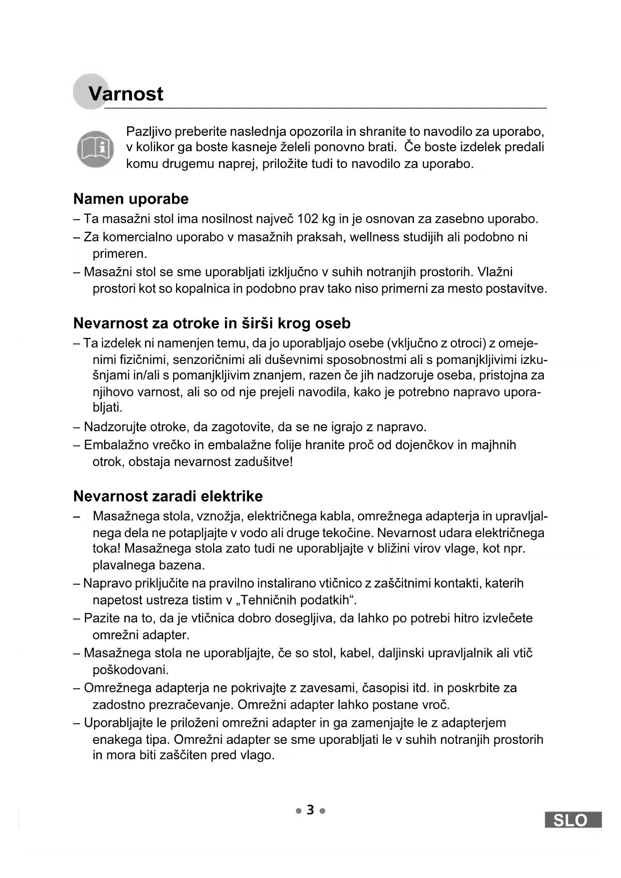 Motnje in pomoč Tehnični podatki Omrežni adapter: UE12L-120100SPAV Oskrba z električnim tokom: Vhod: 100 - 240 V ~ 50/60 Hz Izhod: 12 V / 1000mA / 12 W Moč: 12 W Teža: približno 26 kg Razred zaščite: II Motnja Možni vzroki in ukrepi Ne deluje. - Omrežni adapter v vtičnici? - Kabelski spoji trdno vtaknjeni eden v dru- gega? Šum masažnih motorjev se spremi- nja. - Glasnost je odvisna od vsakokratne masa- žne funkcije. To ni napaka. SLO Massagesessel.book Seite 18 Dienstag, 3. November 2009 3:47 15 19 SLO Izjava o skladnosti Zagotovljena je skladnost proizvoda z zakonsko predpisanimi standardi. Popolno Izjavo o skladnosti najdete na internetni strani www.gt-support.de. Odstranjevanje v odpad Embalažo odvrzite v za to predvidene zbirne posode. Če aparata ni več mogoče uporabljati, povprašajte pristojno podjetje za odstranjevanje odpadkov o potrebnih ukrepih za odstranitev. Aparata se ne sme odvreči med gospodinjske odpadke. SLO Massagesessel.book Seite 19 Dienstag, 3. November 2009 3:47 15 20 Garancijski list Garancijska doba traja 3 leta in začne teči z dnem nakupa oziroma na dan prevzema blaga. Pri uveljavljanju garancije predložite račun in izpolnjen garancijski list. Zato vas prosimo, da shranite račun in garancijski list. Proizvajalec jamči, da bo brezplačno odpravil vse napake, ki so posledica napak na materialu in napak, nastalih pri proizvodnji, pri tem pa se proizvajalec lahko odloči za popravilo, menjavo ali vračilo denarja. Garancija ne velja za škodo, nastalo zaradi nesreč, nepredvidenih dogodkov (na primer strele, vode, ognja), nepravilne uporabe ali nepravilnega prevoza, neupo- števanja varnostnih in vzdrževalnih predpisov ali zaradi nestrokovnega posega v izdelek. Garancijska doba za obrabne in potrošne dele pri normalni uporabi v skladu z navodili znaša 6 mesecev. Sledi vsakodnevne rabe izdelka (praske, odrgnine itd.) niso predmet garancije. Garancijska doba se lahko podaljša, če to predvidevajo zakonski predpisi. Ob prevzemu izdelka, katerega je potrebno popraviti, servisno podjetje in prodajalec ne prevzemata odgovornosti za shranjene podatke oz. nasta- vitve. Po poteku garancijske dobe lahko prav tako pošljete na servis v popravilo okvarjene naprave. Popravila, ki se opravijo po izteku garancijske dobe, je potrebno plačati. V takšnem primeru boste vsekakor predhodno obveščeni. Proizvajalec jamči za kakovost oziroma brezhibno delovanje v garancijskem roku, ki začne teči v trenutku, ko potrošnik/končni porabnik prevzame blago. Če popravila ni mogoče izvesti v roku 45 dni, se prodajalec lahko odloči, ali bo izdelek zamenjal ali pa povrnil nakupno ceno. Garancijska doba se podaljša za čas popravila. Proizvajalec je po poteku garancijske dobe dolžan zagotavljati servisiranje in nadomestne dele za obdobje, ki je vsaj trikrat daljše od garan- cijske dobe. Če za izdelek v Sloveniji ni zagotovljenega servisa, se za servisno mesto štejejo prodajalne, kjer se izdelek prodaja. V tem primeru vas prosimo, da se oglasite v eni od prodajaln. SLO Massagesessel.book Seite 20 Dienstag, 3. November 2009 3:47 15 21 SLO E42336 Naslov(i) servisa: ESECO Electronic Service Cooperation GmbH Pomoè po telefonu: 02300/ 65 89 Oznaka proizvajalca/uvoznika: Globaltronics GmbH & Co KG E-pošta: info@zeitlos-vertrieb.de Oznaka izdelka: Masažni stol Številka izdelka/proizvajalca: GT-MS-01 Številka izdelka: 15910 Obdobje akcije: 04/2010 Podjetje in sedež prodajalca: HOFER KG, Hofer-Straße 2, 4642 Sattledt Opis napake: Ime kupca: Poštna številka in kraj: Ulica: Tel./e-pošta: Podpis: SLO Massagesessel.book Seite 21 Dienstag, 3. November 2009 3:47 15SLO Massagesessel.book Seite 22 Dienstag, 3. November 2009 3:47 15Massagestuhl Montage, Bedienung und Garantie GT-MS-01