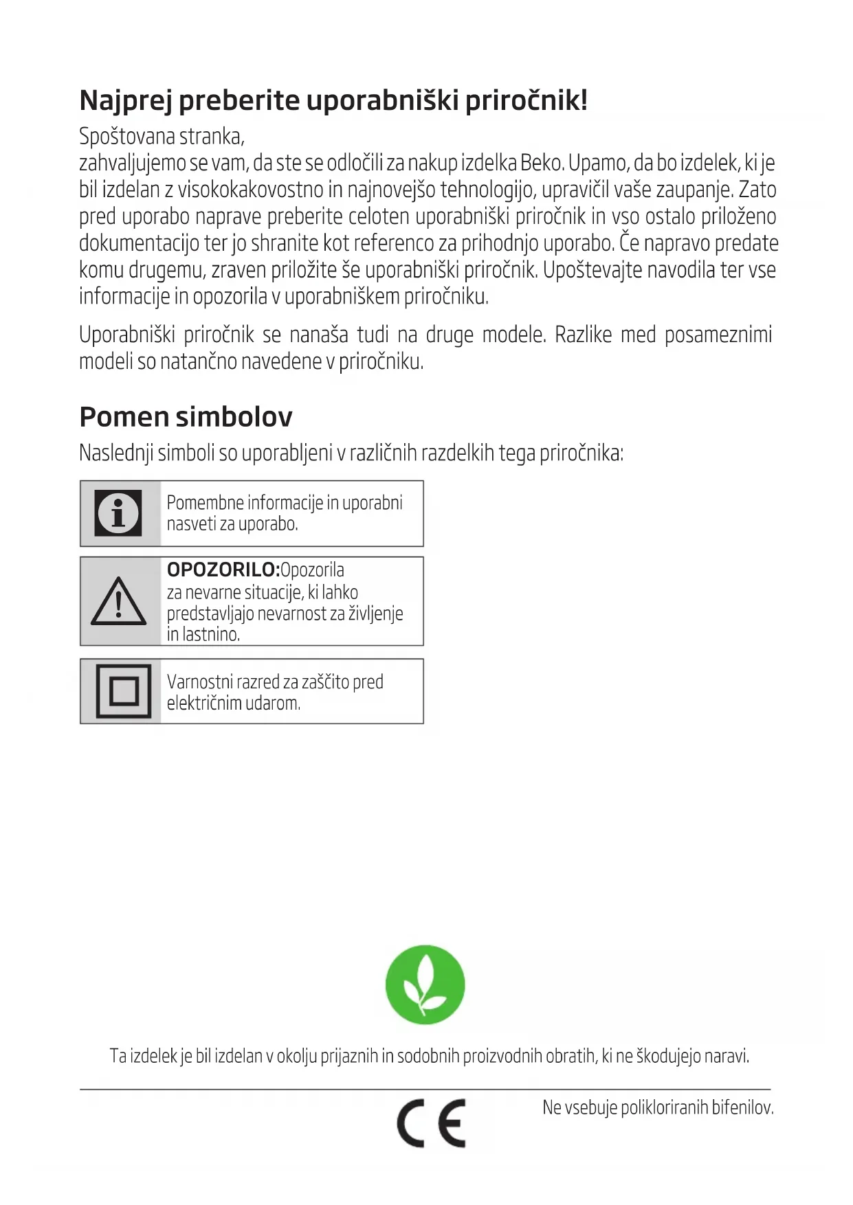 OPOZORILO: Opozorila za nevarne situacije, ki lahko predstavljajo nevarnost za življenje in lastnino. Varnostni razred za zaščito pred električnim udarom. Ta izdelek je bil izdelan v okolju prijaznih in sodobnih proizvodnih obratih, ki ne škodujejo naravi. Ne vsebuje polikloriranih bifenilov.Sesalnik/uporabniški priročnik 81 / SL V tem poglavju so navedena varnostna navodila za zaščito pred telesnimi poškodbami in stvarno škodo. Neupoštevanje teh navodil razveljavi garancijo.