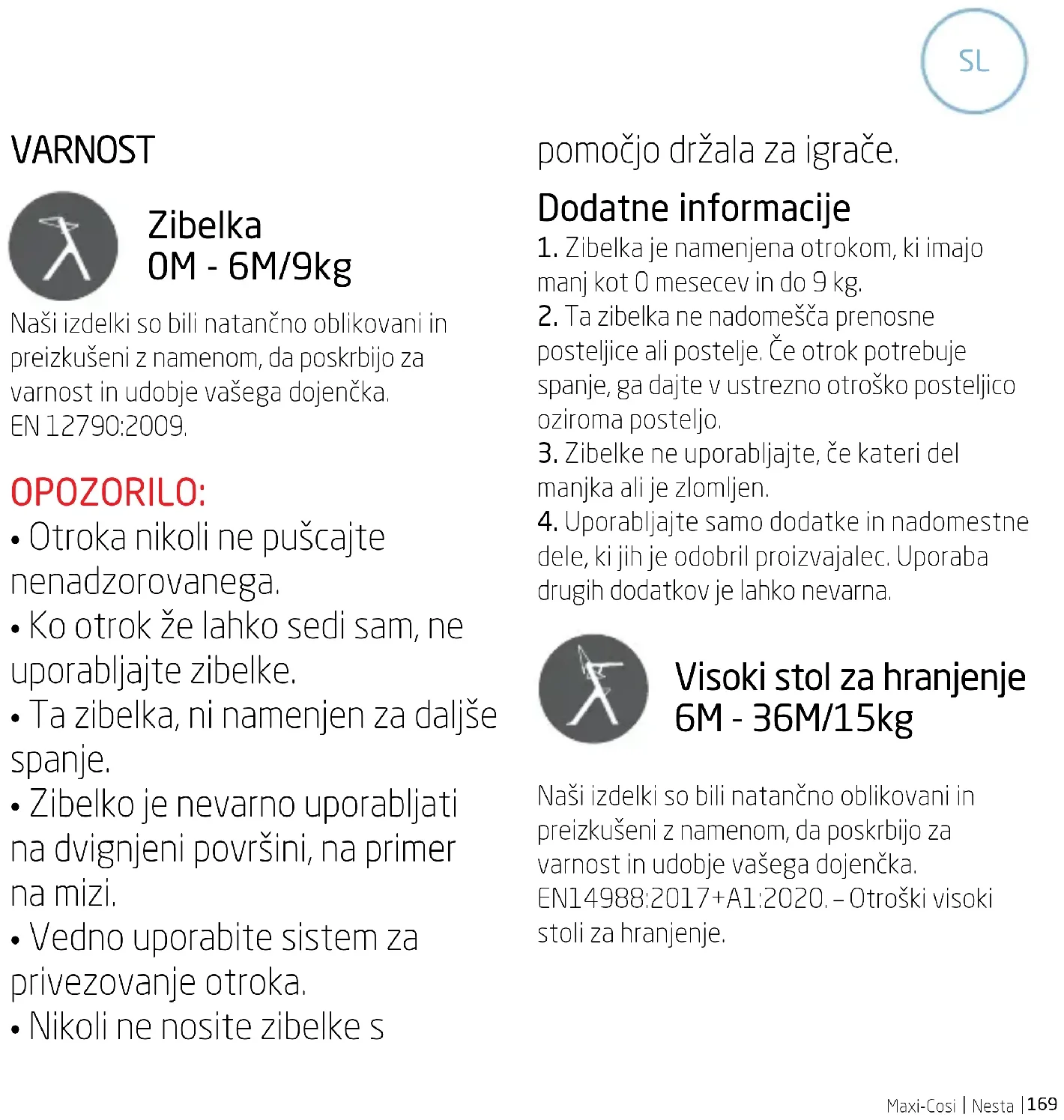 Maxi-Cosi Vprašanja Obrnite se na vašega lokalnega prodajalca ali obiščite našo spletno stran. Pri tem imejte pri roki naslednje podatke: – Serijsko številko – Starost (višino) in težo otroka. Garancija Naša 24-mesečna garancija odraža naše zaupanje v visoko kakovost oblikovanja, inženiringa, proizvodnje in učinkovitost naših izdelkov. Zagotavljamo vam, da je izdelek v skladu s trenutno veljavnimi evropskimi varnostnimi zahtevami in standardi kakovosti, ki se uporabljajo za ta izdelek in da je izdelek v času nakupa brez napak na materialih ali pri izdelavi. Pod omenjenimi pogoji se lahko potrošniki sklicujejo na to garancijo v državah, kjer je bil izdelek prodan pri hčerinski družbi skupine Dorel ali pri pooblaščenem distributerju ali prodajalcu. Naša 24-mesečna garancija pokriva vse proizvodne napake na materialih in pri izdelavi, če izdelek uporabljate v normalnih pogojih in v skladu z našimi navodili za uporabo in sicer za obdobje 24 mesecev od datuma nakupa s strani prvega končnega uporabnika. V primeru zahtevka za popravila ali nadomestne dele za napake na materialih ali pri izdelavi v času garancijskega roka, morate predložiti dokazilo o nakupu, ki je bil opravljen 24 mesecev pred uveljavljanjem garancije. Naša 24-mesečna garancija ne pokriva škode, ki nastane zaradi običajne obrabe, škode, ki nastane zaradi nesreč, nepravilne uporabe, malomarnosti, požara, stika s tekočino ali drugega zunanjega vzroka, škode, ki je posledica neupoštevanja navodil za uporabo, škode, ki nastane zaradi uporabe z drugim izdelkom, škode zaradi servisa, ki ga opravi nepooblaščena oseba, v primeru, če je bil izdelek ukraden ali če je bila z izdelka odstranjena ali spremenjena katerakoli nalepka ali identifikacijska številka. Primeri običajne obrabe vključujejo kolesa in obrabo tekstilne prevleke zaradi redne uporabe kot tudi naravno obledelost barv in materialov zaradi običajnega staranja izdelka. SLMaxi-Cosi
