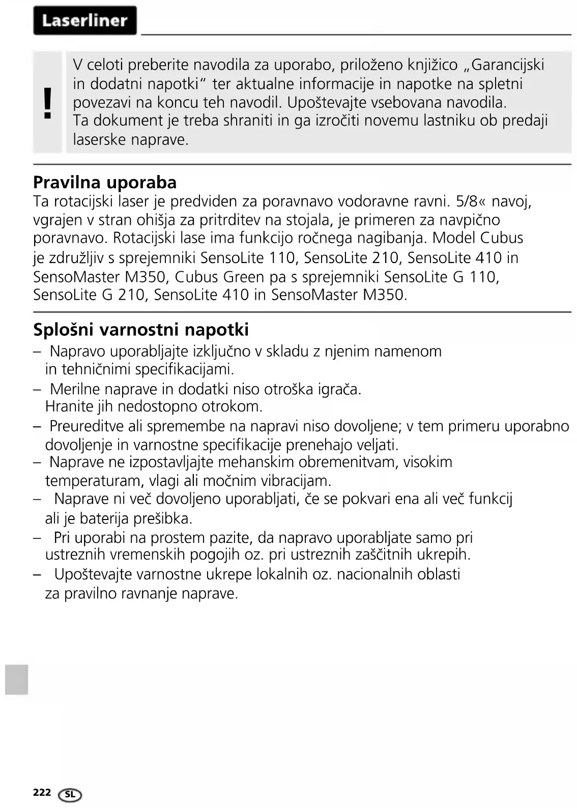 Splošni varnostni napotki – Napravo uporabljajte izključno v skladu z njenim namenom in tehničnimi specikacijami. – Merilne naprave in dodatki niso otroška igrača. Hranite jih nedostopno otrokom. – Preureditve ali spremembe na napravi niso dovoljene; v tem primeru uporabno dovoljenje in varnostne specikacije prenehajo veljati. – Naprave ne izpostavljajte mehanskim obremenitvam, visokim temperaturam, vlagi ali močnim vibracijam. – Naprave ni več dovoljeno uporabljati, če se pokvari ena ali več funkcij ali je baterija prešibka. – Pri uporabi na prostem pazite, da napravo uporabljate samo pri ustreznih vremenskih pogojih oz. pri ustreznih zaščitnih ukrepih. – Upoštevajte varnostne ukrepe lokalnih oz. nacionalnih oblasti za pravilno ravnanje naprave. Pravilna uporaba Ta rotacijski laser je predviden za poravnavo vodoravne ravni. 5/8« navoj, vgrajen v stran ohišja za pritrditev na stojala, je primeren za navpično poravnavo. Rotacijski lase ima funkcijo ročnega nagibanja. Model Cubus je združljiv s sprejemniki SensoLite 110, SensoLite 210, SensoLite 410 in SensoMaster M350, Cubus Green pa s sprejemniki SensoLite G 110, SensoLite G 210, SensoLite 410 in SensoMaster M350. V celoti preberite navodila za uporabo, priloženo knjižico „Garancijski in dodatni napotki“ ter aktualne informacije in napotke na spletni povezavi na koncu teh navodil. Upoštevajte vsebovana navodila. Ta dokument je treba shraniti in ga izročiti novemu lastniku ob predaji laserske naprave. !Cubus / Cubus Green