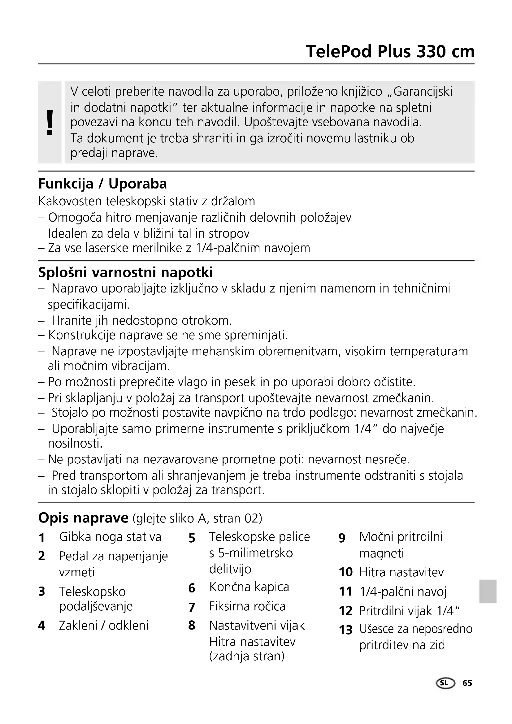 Funkcija / Uporaba Kakovosten teleskopski stativ z držalom – Omogoča hitro menjavanje različnih delovnih položajev – Idealen za dela v bližini tal in stropov – Za vse laserske merilnike z 1/4-palčnim navojem V celoti preberite navodila za uporabo, priloženo knjižico „Garancijski in dodatni napotki“ ter aktualne informacije in napotke na spletni povezavi na koncu teh navodil. Upoštevajte vsebovana navodila. Ta dokument je treba shraniti in ga izročiti novemu lastniku ob predaji naprave.