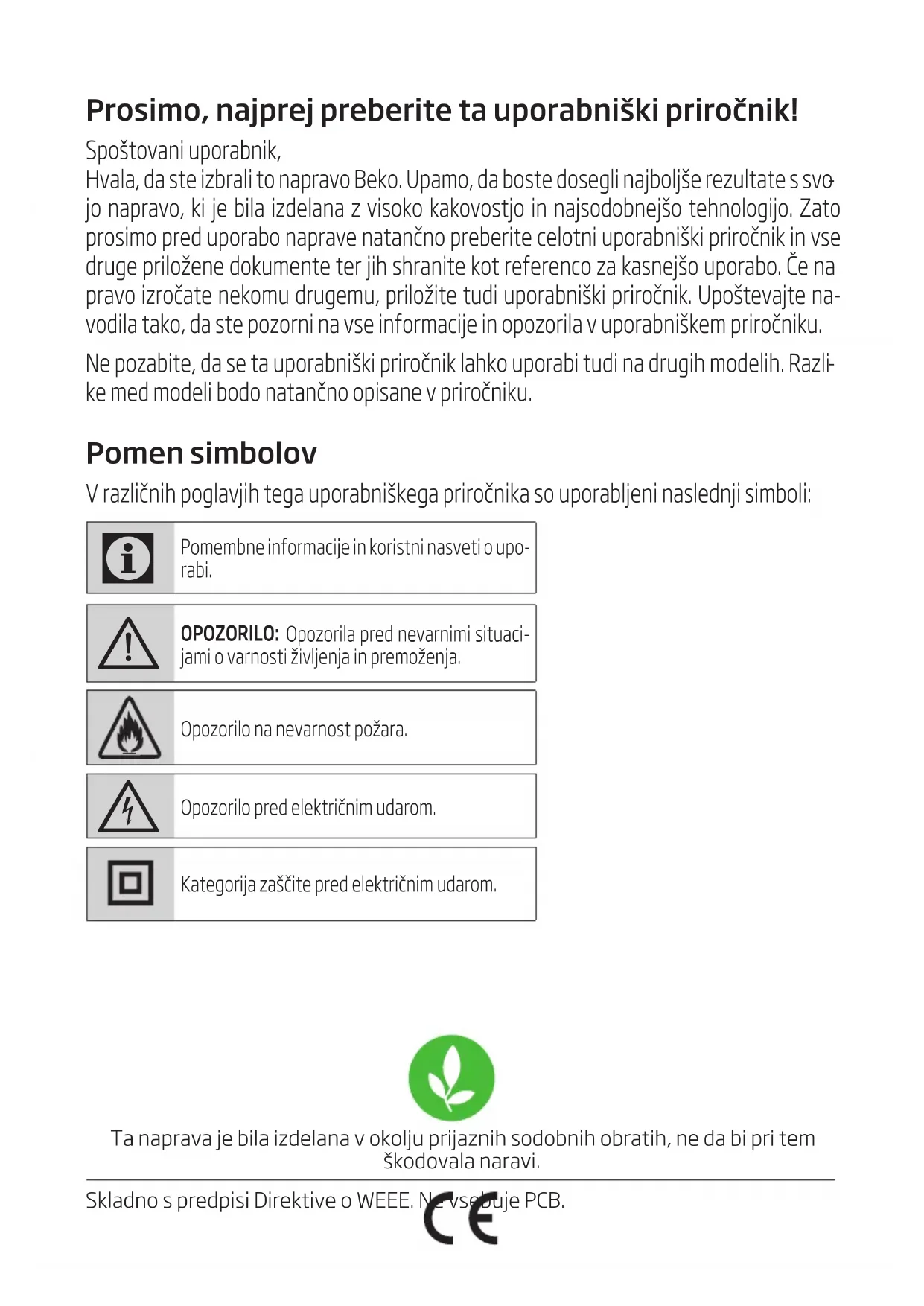 Pomembna varnostna navodila natančno preberite in jih shranite za kasnejšo uporabo To poglavje vsebuje varnostna navodila, ki vam bodo pomagala pri zaščiti pred požarom, elek