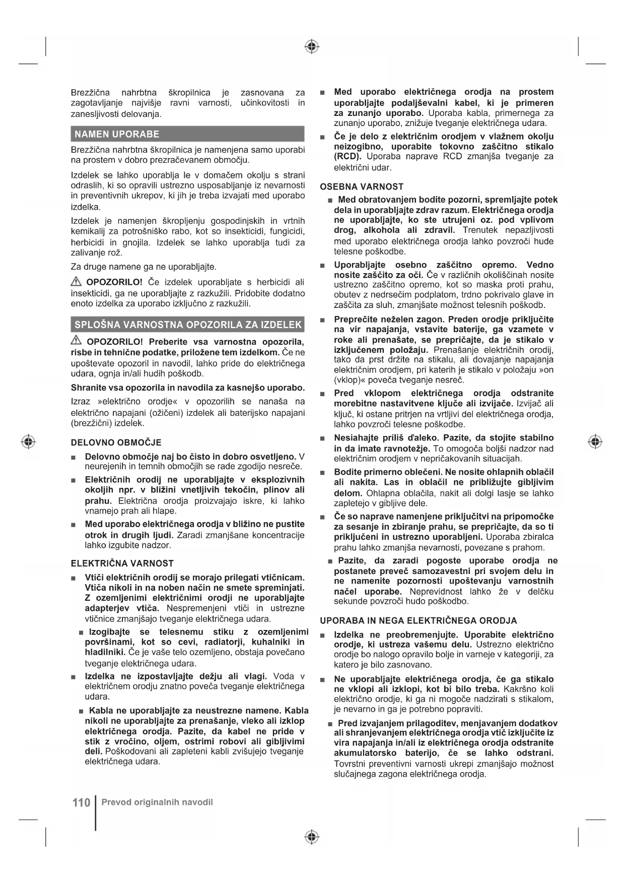NAHRBTNO ŠKROPILNICO ■ Pazljivo preberite navodila. Seznanite se z vsemi krmilnimi elementi in pravilno uporabo izdelka. ■ Nikoli ne dovolite otrokom, osebam z zmanjšanimi fizičnimi, senzoričnimi ali mentalnimi zmožnostmi ali osebam s pomanjkanjem izkušenj ali znanja ter osebam, ki niso seznanjene s temi navodili, da uporabljajo izdelek. ■ Izdelek se lahko uporablja samo z izdelki za zaščito rastlin, ki so jih odobrili lokalni/nacionalni regulativni organi za izdelke za zaščito rastlin za uporabo z nahrbtnimi škropilnicami. ■ Upoštevajte navodila proizvajalca kemikalije glede zaščitne opreme. ■ Za zmanjšanje tveganja nesreč in poškodb izdelka nikoli ne uporabljajte z naslednjim: ● vnetljivimi tekočinami ● viskoznimi ali lepljivimi tekočinami ● lužnimi ali korozivnimi kemikalijami ● tekočinami s temperaturo nad 50 °C ■ Ne pršite v prisotnosti iskre, plamena ali drugega vira vžiga. ■ Naprave nikoli ne uporabljajte, če ima poškodovana vodila ali zaščite ali brez nameščenih varnostnih naprav. Nikoli ne uporabljajte nepopolnega ali spremenjenega izdelka. Uporaba pokvarjenega, nepopolnega ali spremenjenega izdelka lahko povzroči nevarno situacijo. ■ Ne pršite v smeri ljudi ali živali. Izogibajte se škropljenju v vetrovnih dneh. Pršilne snovi lahko po naključju zanese na rastline ali predmete, ki jih naj ne bi škropili. Zmeraj škropite v smeri vetra. ■ V primeru nesreče ali okvare izdelek takoj izklopite in odstranite baterijski vložek. Izdelek prenehajte uporabljati, dokler ga temeljito ne pregledajo na pooblaščenem servisu. ■ Če ni škropljenja iz šobe ali je škropljenje oslabljeno, je sistem cevke in palice morda zamašen. Sperite in očistite vse dele sistema cevke in palice (škropilno pištolo, filter v rezervoarju, škropilno palico, cevko) s čisto vodo. Z usti nikoli ne pihajte zraka v šobe ali druge sestavne dele. ■ Izogibajte se stika s kemikalijami za nadzor rastlin. Oblačila, onesnažena s kemikalijami za obvladovanje rastlin, takoj slecite. Pršilnih snovi a ne imejte v bližini oči. Če pršilne snovi pridejo v stik z očmi, jih nemudoma izperite s čisto vodo. Če draženje še vztraja, takoj poiščite zdravniško pomoč. ■ Pršilne snovi so lahko škodljive, če jih vdihnete, zaužijete, ali če pridejo v stik z očmi. Nosite ustrezna zaščitna oblačila in opremo, ko: ● polnite rezervoar škropilnice s škropivi ● škropite ● izvajate prilagoditve ● praznite in čistite rezervoar škropilnice ● menjate škropiva ● servisirate izdelek112 Prevod originalnih navodil ■ Pred uporabo izdelka vedno preverite, ali se pojavlja puščanje, ter ga odpravite. ■ Pred vsako uporabo temeljito preglejte notranjost in zunanjost izdelka ter sestavne dele. Preverite, če so gumijaste cevi razpokane in preperele, če kje pušča, če so šobe zamašene, in če so kakšni deli poškodovani ali manjkajo. Če je poškodovan, dajte izdelek pred uporabo v popravilo. Slabo vzdrževani izdelki povzročijo mnogo nesreč. ■ Zavedajte se morebitnih nevarnosti, ki jih povzročajo raztopine kemikalij. Vedno upoštevajte navodila proizvajalca kemikalij glede uporabe, ravnanja in shranjevanja. ■ Izdelka ne uporabljajte z nobenim materialom, v zvezi s katerim tveganje ni znano. ■ Pred uporabo izdelka se prepričajte, da je škropilna palica trdno pritrjena na ročaj za palico. Če je treba, za pritrditev škropilne palice na ročaj uporabite klešče. ■ Škropilni rezervoar po natakanju tekočine nanj ustrezno namestite in dobro zaprite. ■ Po dolgotrajnem shranjevanju ali po prezimovanju poškropite izdelek s čisto vodo. Preverite, ali se pojavlja puščanje oziroma obstajajo razpoke. ■ Za uporabo, čiščenje in shranjevanje zmeraj upoštevajte navodila proizvajalca kemikalij, ki so natisnjena na oznaki izdelka. Kemikalije shranjujte izven dosega otrok. ■ Za zmanjšanje nevarnosti požara ali eksplozije tega izdelka ne uporabljajte z vnetljivimi kemikalijami, kot so bencin ali druge kemikalije, katerih temperatura plamenišča je nižja od 55 °C. ■ Izdelek uporabljajte samo pri temperaturah med 0 °C in 40 °C. ■ Izdelek shranjujte v prostoru, v katerem je temperatura okolja med 0 °C in 40°C. ■ Daljša uporaba orodja lahko privede do poškodb ali pa so poškodbe lahko hujše. Če katerikoli izdelek uporabljate daljši čas, poskrbite za redne premore.