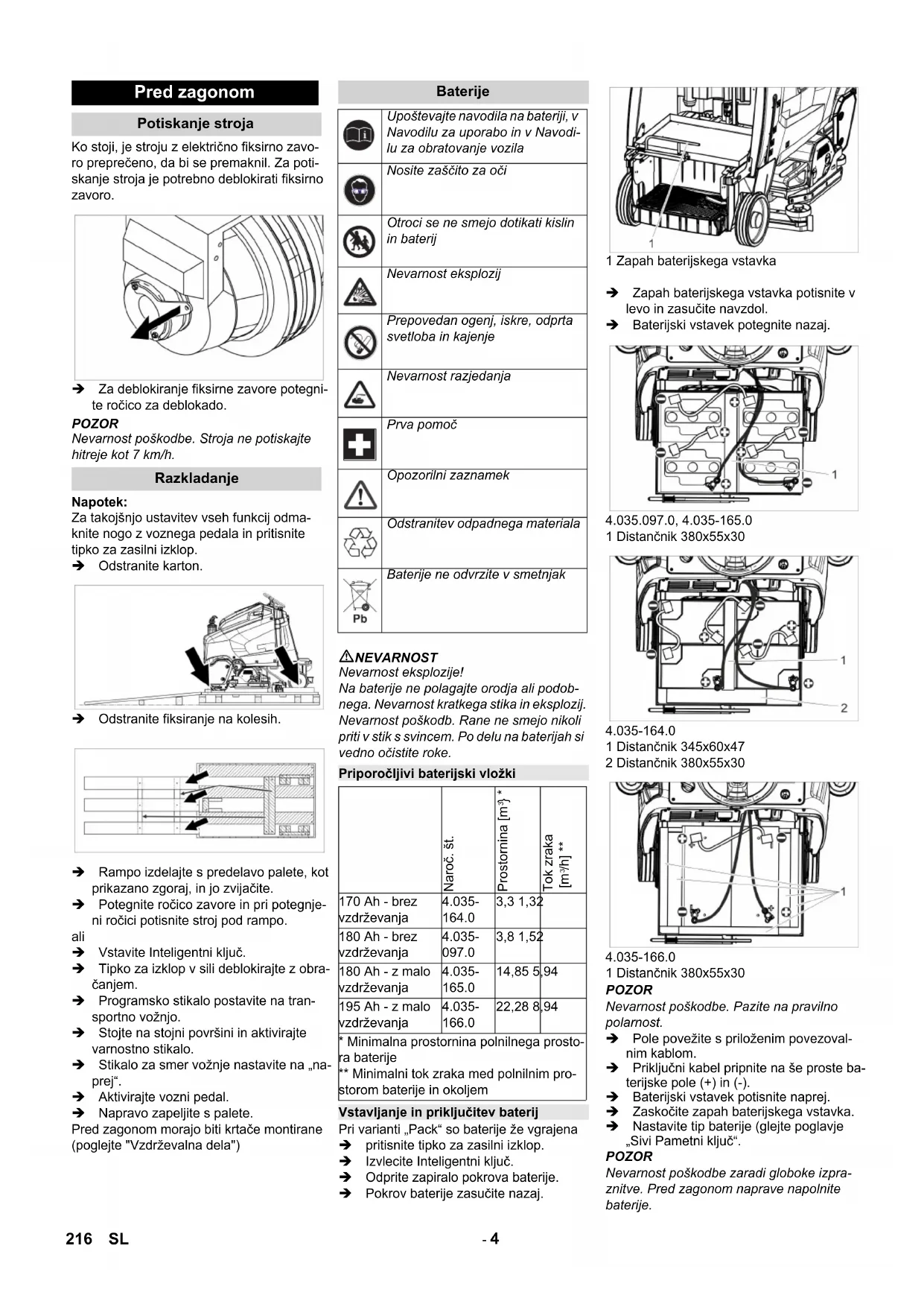 1 Distančnik 380x55x30 4.035-164.0 1 Distančnik 345x60x47 2 Distančnik 380x55x30 4.035-166.0 1 Distančnik 380x55x30 POZOR Nevarnost poškodbe. Pazite na pravilno polarnost. Pole povežite s priloženim povezoval- nim kablom. Priključni kabel pripnite na še proste ba- terijske pole (+) in (-). Baterijski vstavek potisnite naprej. Zaskočite zapah baterijskega vstavka. Nastavite tip baterije (glejte poglavje „Sivi Pametni ključ“. POZOR Nevarnost poškodbe zaradi globoke izpra- znitve. Pred zagonom naprave napolnite baterije. Pred zagonom Potiskanje stroja Razkladanje Baterije Upoštevajte navodila na bateriji, v Navodilu za uporabo in v Navodi- lu za obratovanje vozila Nosite zaščito za oči Otroci se ne smejo dotikati kislin in baterij Nevarnost eksplozij Prepovedan ogenj, iskre, odprta svetloba in kajenje Nevarnost razjedanja Prva pomoč Opozorilni zaznamek Odstranitev odpadnega materiala Baterije ne odvrzite v smetnjak Priporočljivi baterijski vložki Naroč. št. Prostornina [m