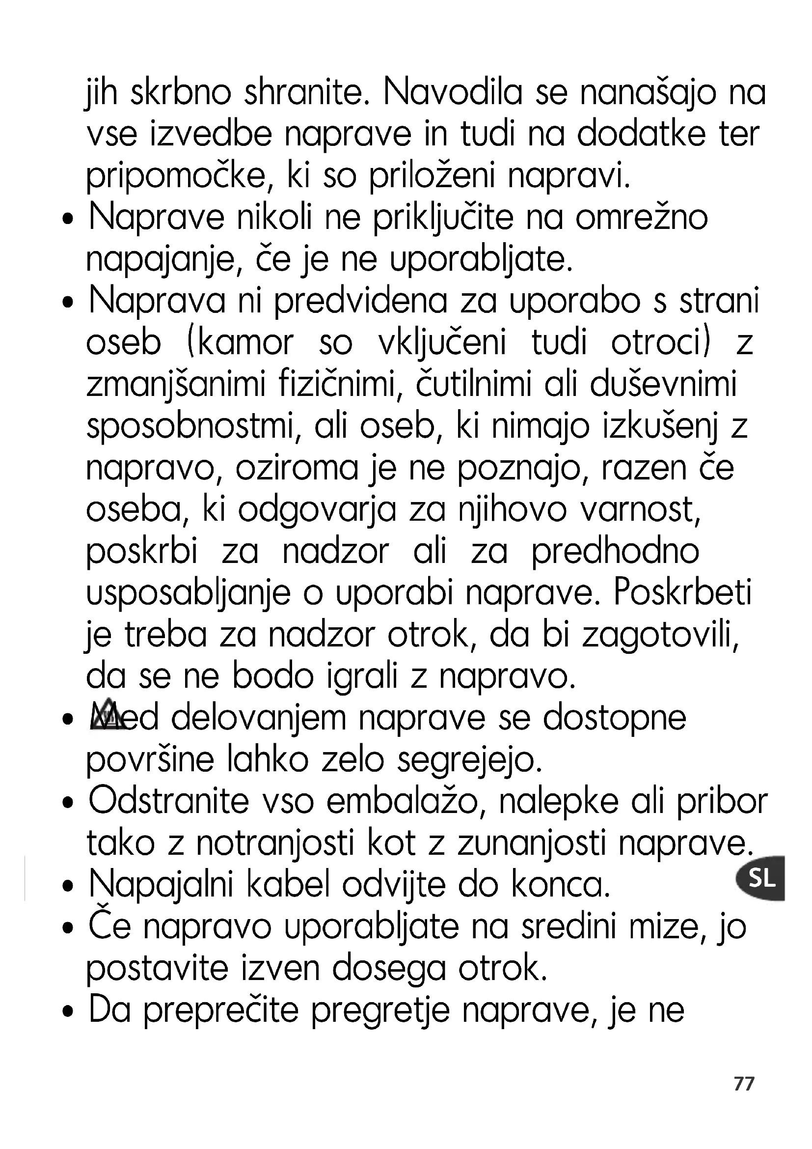 - To napravo lahko uporabljajo otroci starejši od 8 let in osebe z zmanjšanimi fizičnimi, senzoričnimi in mentalnimi sposobnostmi ali osebe brez znanja in izkušenj le, če so pod nadzorom ali če predhodno pridobijo navodila o varni uporabi naprave in če razumejo tveganja, ki so vključena v uporabo naprave. Otroci se ne smejo igrati z napravo. Čiščenja in vzdrževanje naprave n e s m e j o o p r a v l j a t i o t r o c i r a z e n č e s o starejši od 8 let ali pod nadzorom.