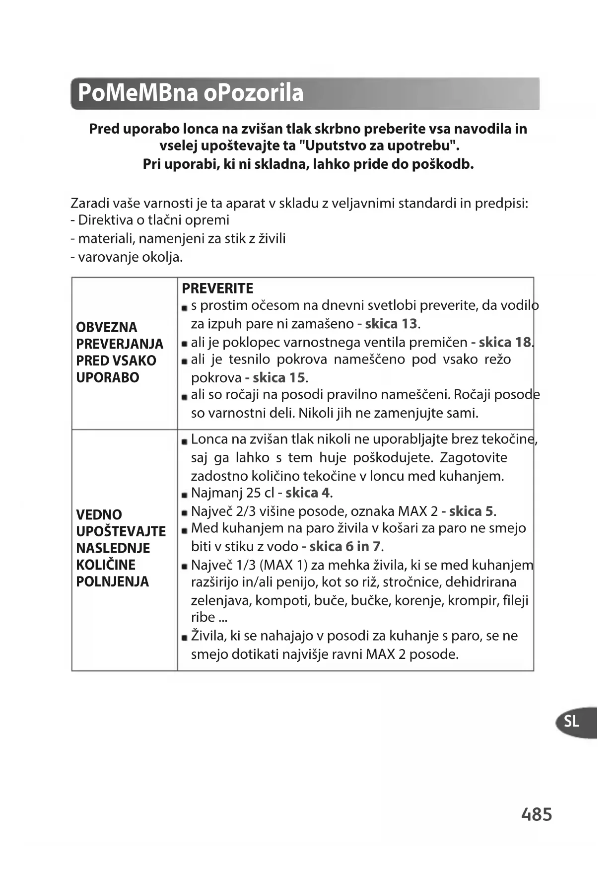 Pred uporabo lonca na zvišan tlak skrbno preberite vsa navodila in vselej upoštevajte ta "Uputstvo za upotrebu". Pri uporabi, ki ni skladna, lahko pride do poškodb. Zaradi vaše varnosti je ta aparat v skladu z veljavnimi standardi in predpisi: - Direktiva o tlačni opremi - materiali, namenjeni za stik z živili - varovanje okolja. Pomembna oPozorila OBVEZNA PREVERJANJA PRED VSAKO UPORABO PREVERITE s prostim očesom na dnevni svetlobi preverite, da vodilo za izpuh pare ni zamašeno - skica 13. ali je poklopec varnostnega ventila premičen - skica 18. ali je tesnilo pokrova nameščeno pod vsako režo pokrova - skica 15. ali so ročaji na posodi pravilno nameščeni. Ročaji posode so varnostni deli. Nikoli jih ne zamenjujte sami. VEDNO UPOŠTEVAJTE NASLEDNJE KOLIČINE POLNJENJA Lonca na zvišan tlak nikoli ne uporabljajte brez tekočine, saj ga lahko s tem huje poškodujete. Zagotovite zadostno količino tekočine v loncu med kuhanjem. Najmanj 25 cl - skica 4. Največ 2/3 višine posode, oznaka MAX 2 - skica 5. Med kuhanjem na paro živila v košari za paro ne smejo biti v stiku z vodo - skica 6 in 7. Največ 1/3 (MAX 1) za mehka živila, ki se med kuhanjem razširijo in/ali penijo, kot so riž, stročnice, dehidrirana zelenjava, kompoti, buče, bučke, korenje, krompir, fileji ribe ... Živila, ki se nahajajo v posodi za kuhanje s paro, se ne smejo dotikati najvišje ravni MAX 2 posode.486