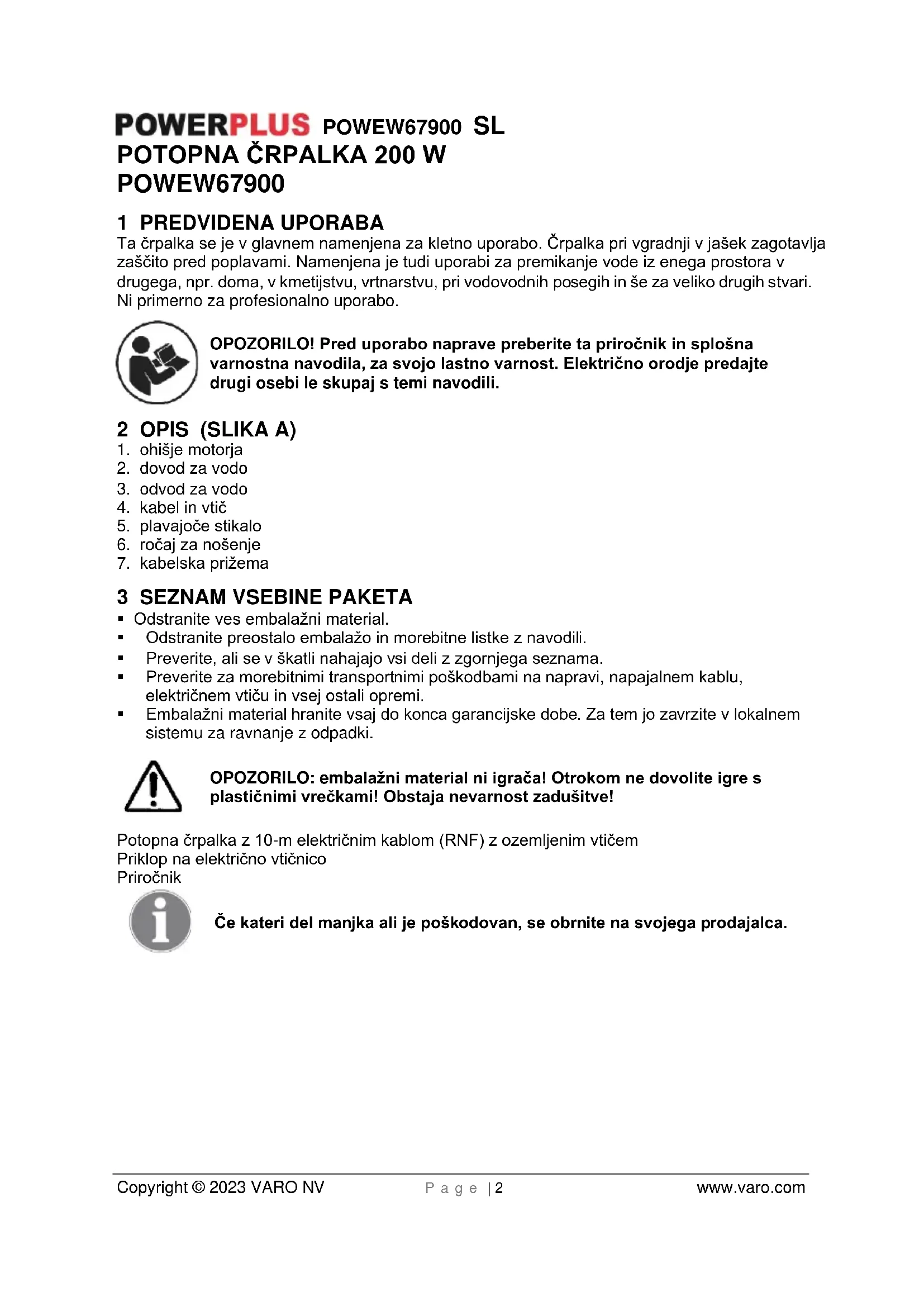 - Embalažni material hranite vsaj do konca garancijske dobe. Za tem jo zavrzite v lokalnem sistemu za ravnanje z odpadki. OPOZORILO: embalažni material ni igrača! Otrokom ne dovolite igre s plastičnimi vrečkami! Obstaja nevarnost zadušitve! Potopna črpalka z 10-m električnim kablom (RNF) z ozemljenim vtičem Priklop na električno vtičnico Priročnik Če kateri del manjka ali je poškodovan, se obrnite na svojega prodajalca.POWEW67900 SL Copyright © 2023 VARO NV P a g e | 3 www.varo.com 4 SIMBOLI V tem priročniku in/ali na stroju so uporabljeni naslednji simboli: