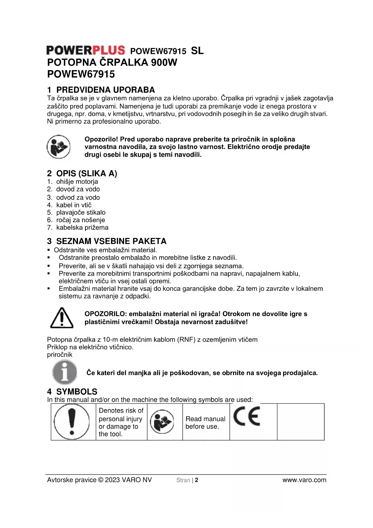 Read manual before use.POWEW67915 SL Avtorske pravice © 2023 VARO NV Stran | 3 www.varo.com 5 SPLOŠNA VARNOSTNA OPOZORILA ZA ELEKTRIČNO ORODJE Preberite si vsa varnostna opozorila in navodila. Zaradi neupoštevanja opozoril in navodil lahko pride do električnega udara, požara in/ali hude telesne poškodbe. Vsa opozorila in navodila shranite za vpogled v prihodnje. Izraz »električno orodje« v opozorilih zajema tako električno orodje, povezano z električnim omrežjem (s kablom), kot tudi električna orodja z baterijskim napajanjem (brez kabla). 6 PRED ZAGONOM PREVERITE NASLEDNJE!