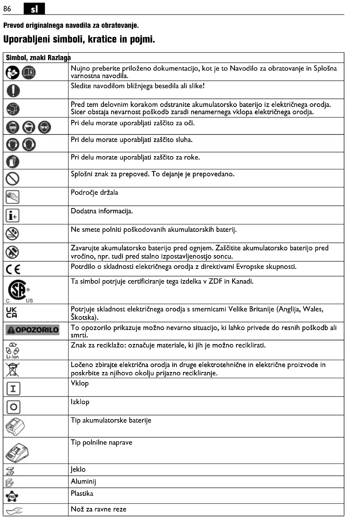 Prevod originalnega navodila za obratovanje. Uporabljeni simboli, kratice in pojmi. Simbol, znaki Razlaga Nujno preberite priloženo dokumentacijo, kot je to Navodilo za obratovanje in Splošna varnostna navodila. Sledite navodilom bližnjega besedila ali slike! Pred tem delovnim korakom odstranite akumulatorsko baterijo iz električnega orodja. Sicer obstaja nevarnost poškodb zaradi nenamernega vklopa električnega orodja. Pri delu morate uporabljati zaščito za oči. Pri delu morate uporabljati zaščito sluha. Pri delu morate uporabljati zaščito za roke. Splošni znak za prepoved. To dejanje je prepovedano. Področje držala Dodatna informacija. Ne smete polniti poškodovanih akumulatorskih baterij. Zavarujte akumulatorsko baterijo pred ognjem. Zaščitite akumulatorsko baterijo pred vročino, npr. tudi pred stalno izpostavljenostjo soncu. Potrdilo o skladnosti električnega orodja z direktivami Evropske skupnosti. Ta simbol potrjuje certificiranje tega izdelka v ZDF in Kanadi. Potrjuje skladnost električnega orodja s smernicami Velike Britanije (Anglija, Wales, Škotska). To opozorilo prikazuje možno nevarno situacijo, ki lahko privede do resnih poškodb ali smrti. Znak za reciklažo: označuje materiale, ki jih je možno reciklirati. Ločeno zbirajte električna orodja in druge elektrotehnične in električne proizvode in poskrbite za njihovo okolju prijazno recikliranje. Vklop Izklop Tip akumulatorske baterije Tip polnilne naprave Jeklo Aluminij Plastika Nož za ravne reze87