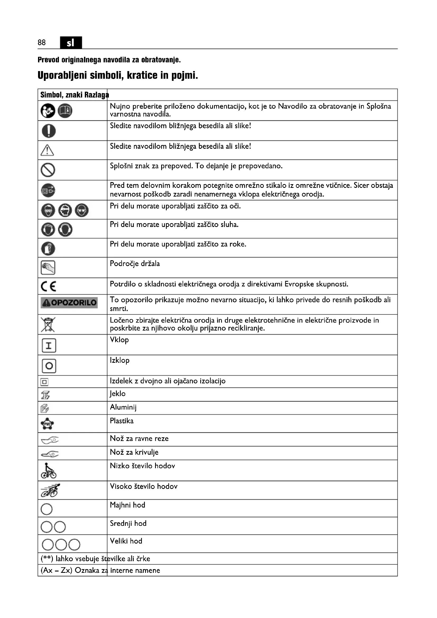 Prevod originalnega navodila za obratovanje. Uporabljeni simboli, kratice in pojmi. Simbol, znaki Razlaga Nujno preberite priloženo dokumentacijo, kot je to Navodilo za obratovanje in Splošna varnostna navodila. Sledite navodilom bližnjega besedila ali slike! Sledite navodilom bližnjega besedila ali slike! Splošni znak za prepoved. To dejanje je prepovedano. Pred tem delovnim korakom potegnite omrežno stikalo iz omrežne vtičnice. Sicer obstaja nevarnost poškodb zaradi nenamernega vklopa električnega orodja. Pri delu morate uporabljati zaščito za oči. Pri delu morate uporabljati zaščito sluha. Pri delu morate uporabljati zaščito za roke. Področje držala Potrdilo o skladnosti električnega orodja z direktivami Evropske skupnosti. To opozorilo prikazuje možno nevarno situacijo, ki lahko privede do resnih poškodb ali smrti. Ločeno zbirajte električna orodja in druge elektrotehnične in električne proizvode in poskrbite za njihovo okolju prijazno recikliranje. Vklop Izklop Izdelek z dvojno ali ojačano izolacijo Jeklo Aluminij Plastika Nož za ravne reze Nož za krivulje Nizko število hodov Visoko število hodov Majhni hod Srednji hod Veliki hod (**) lahko vsebuje številke ali črke (Ax – Zx) Oznaka za interne namene89