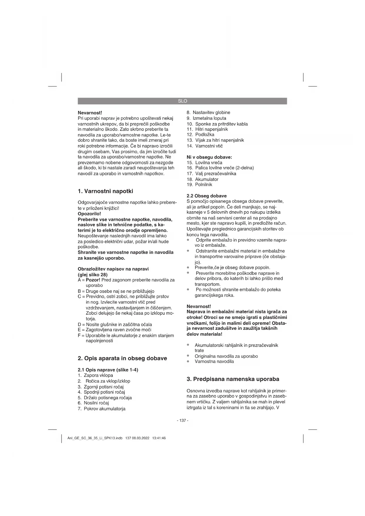 Previdno! Rahljalnik je opremljen z varnostnim vklopom, ki preprečuje uporabo nepooblaščenim. Tik pred zagonom rahljalnika vstavite varnostni vtič (sl. 21/ poz. 14) in ga vedno odstranite pri vsaki prekinitvi ali končanju dela. Da preprečite neželeni vklop rahljalnika, morate stikalni ročaj (sl. 22/poz. 3) opremiti z blokado vklopa (sl. 22/poz. 1), ki jo morate pritisniti, pre- den lahko pritisnete na stikalno ročico (sl. 22/poz. Anl_GE_SC_36_35_Li_SPK13.indb 140 08.03.2022 13:41:47SLO
