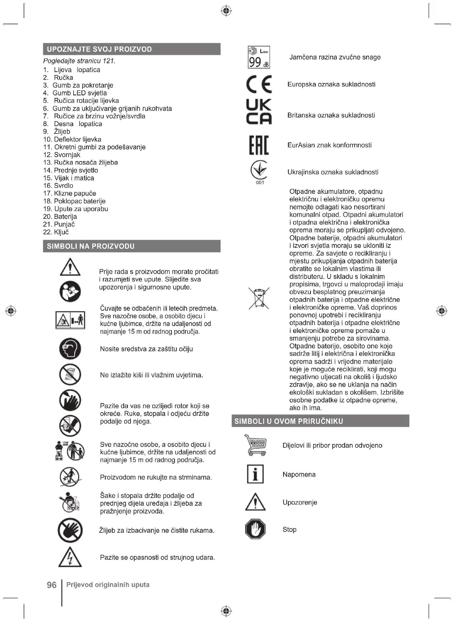 se nošenju ohlapnih oblačil ali oblačil z odstopajočimi dodatki, saj se lahko ujamejo med premične dele. ■ Dolge lase si spnite nad rameni in tako preprečite, da bi se ujeli v premikajoče se dele. ■ Med delovanjem izdelka ali prilagajanjem in popravljanjem izdelka vedno nosite varnostna očala ali ščitnik za oči, da zaščitite oči pred tujki, ki bi lahko prileteli iz izdelka. ■ Pred vsako uporabo zagotovite, da vse kontrole in varnostne naprave delujejo pravilno. Ne uporabljajte izdelka, če stikalo za izklop ne ugasne motorja. ■ Pred vsako uporabo preverite, ali je ohišje nepoškodovano in ali so ščitniki ter ročice na svojem mestu in varno pritrjene. DELOVANJE ■ Izdelka ne uporabljajte v primeru pojava nevihte. ■ Roke in stopala držite stran od vrtečih se delov. Ne približujte se odprtini za praznjenje. V odprtine ne postavljajte nobenih predmetov. ■ Med uporabo ali pomikanjem prek makadamskih cest ali pešpoti bodite izjemno previdni. Bodite pozorni na skrite nevarnosti ali med uporabo v bližini javnih cest. ■ Za zmanjšanje nevarnosti poškodbe zaradi stika s premikajočimi se deli izdelek vedno izklopite in odstranite baterijski vložek. Prepričajte se, da so se vsi premikajoči se deli popolnoma zaustavili: ● ko zadenete tujek, preverite, ali je izdelek poškodovan ● pred čiščenjem ali odstranjevanjem blokade ● preden zapustite napravo ● pred preverjanjem in vzdrževanjem izdelka ali delom na njem ● če izdelek začne nenormalno vibrirati (preverite nemudoma) Vibracije so ponavadi znanilec težav. ■ Na pobočjih se premikajte prečno, nikoli gor in dol. Pri menjavanju smeri na pobočjih bodite še posebej previdni. Ne poskušajte očistiti strmih pobočij. ■ Naprave nikoli ne upravljajte brez primernih ščitnikov, obleke in drugih varnostnih naprav na določenih mestih. ■ Izmeta nikoli ne usmerjajte v osebe ali območja, kjer lahko pride do poškodb lastnine. Vsi opazovalci morajo stati proč od delovnega območja, še posebej otroci in domače živali. ■ To lahko povzroči resne poškodbe.Naprave ne preobremenjujte s prehitrim čiščenjem snega. ■ Kadar izdelek uporabljate na drsljivi podlagi, ta ne sme nikoli obratovati pri visoki hitrosti. Med uporabo izdelka v vzvratni smeri glejte nazaj in izdelek previdno uporabljajte. ■ Med prevozom izdelka ali ko izdelka ne uporabljate, izklopite napajanje zbiralnika/pogonskega kolesa. ■ Uporabljajte le originalne rezervne dele in dodatke, ki jih priporoča proizvajalec. ■ Izdelka nikoli ne uporabljajte v slabi vidljivosti ali nezadostni svetlobi. Poskrbite, da vedno stabilno stojite in močno držite za ročaja. Vedno hodite, nikoli ne tecite. ■ Ko je naprava v teku, je nikoli ne postavite na katero koli površino, razen na trdo in čisto površino. Zračni dovod lahko pobere gramoz, pesek ali druge delce in jih vrže v operaterja naprave ali mimoidoče. ■ Nikoli ne uporabljajte naprave v bližini steklenih ograj, avtomobilov, oken ali vhodov brez primerne nastavitve kota izmeta. ■ Če izdelek pade, utrpi močan udarec ali začne nenormalno vibrirati, ga takoj izklopite in preverite, ali je poškodovan oziroma ugotovite vzrok vibracij. Vsakršno poškodbo mora ustrezno popraviti ali zamenjati pooblaščeni servisni center. ■ Izdelek uporabljajte samo pri temperaturah med 0°C in 40°C. ■ Izdelek shranjujte v prostoru, v katerem je temperatura okolja med 0°C in 40°C.