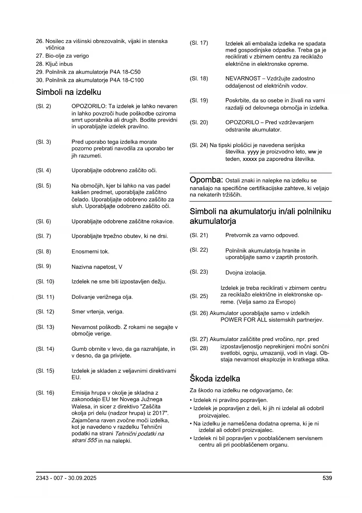 Simboli na izdelku (Sl. 2) OPOZORILO: Ta izdelek je lahko nevaren in lahko povzroči hude poškodbe oziroma smrt uporabnika ali drugih. Bodite previdni in uporabljajte izdelek pravilno. (Sl. 3) Pred uporabo tega izdelka morate pozorno prebrati navodila za uporabo ter jih razumeti. (Sl. 4) Uporabljajte odobreno zaščito oči. (Sl. 5) Na območjih, kjer bi lahko na vas padel kakšen predmet, uporabljajte zaščitno čelado. Uporabljajte odobreno zaščito za sluh. Uporabljajte odobreno zaščito oči. (Sl. 6) Uporabljajte odobrene zaščitne rokavice. (Sl. 7) Uporabljajte trpežno obutev, ki ne drsi. (Sl. 8) Enosmerni tok. (Sl. 9) Nazivna napetost, V (Sl. 10) Izdelek ne sme biti izpostavljen dežju. (Sl. 11) Dolivanje verižnega olja. (Sl. 12) Smer vrtenja, veriga. (Sl. 13) Nevarnost poškodb. Z rokami ne segajte v območje verige. (Sl. 14) Gumb obrnite v levo, da ga razrahljate, in v desno, da ga privijete. (Sl. 15) Izdelek je skladen z veljavnimi direktivami EU. (Sl. 16) Emisija hrupa v okolje je skladna z zakonodajo EU ter Novega Južnega Walesa, in sicer z direktivo "Zaščita okolja pri delu (nadzor hrupa) iz 2017". Zajamčena raven zvočne moči izdelka, kot je navedeno v razdelku Tehnični podatki na strani Tehnični podatki na strani 555 in na nalepki. (Sl. 17) Izdelek ali embalaža izdelka ne spadata med gospodinjske odpadke. Treba ga je reciklirati v zbirnem centru za reciklažo električne in elektronske opreme. (Sl. 18) NEVARNOST – Vzdržujte zadostno oddaljenost od električnih vodov. (Sl. 19) Poskrbite, da so osebe in živali na varni razdalji od delovnega območja in izdelka. (Sl. 20) OPOZORILO – Pred vzdrževanjem odstranite akumulator. (Sl. 24) Na tipski ploščici je navedena serijska številka. yyyy je proizvodno leto, ww je teden, xxxxx pa zaporedna številka. Opomba: Ostali znaki in nalepke na izdelku se nanašajo na specifične certifikacijske zahteve, ki veljajo na nekaterih tržiščih. Simboli na akumulatorju in/ali polnilniku akumulatorja (Sl. 21) Pretvornik za varno odpoved. (Sl. 22) Polnilnik akumulatorja hranite in uporabljajte samo v zaprtih prostorih. (Sl. 23) Dvojna izolacija. (Sl. 25) Izdelek je treba reciklirati v zbirnem centru za reciklažo električne in elektronske op- reme. (Velja samo za Evropo) (Sl. 26) Akumulator uporabljajte samo v izdelkih POWER FOR ALL sistemskih partnerjev. (Sl. 27) Akumulator zaščitite pred vročino, npr. pred izpostavljenostjo neprekinjeni močni sončni svetlobi, ognju, umazaniji, vodi in vlagi. Ob- staja nevarnost eksplozije in kratkega stika. (Sl. 28) Škoda izdelka Za škodo na izdelku ne odgovarjamo, če: