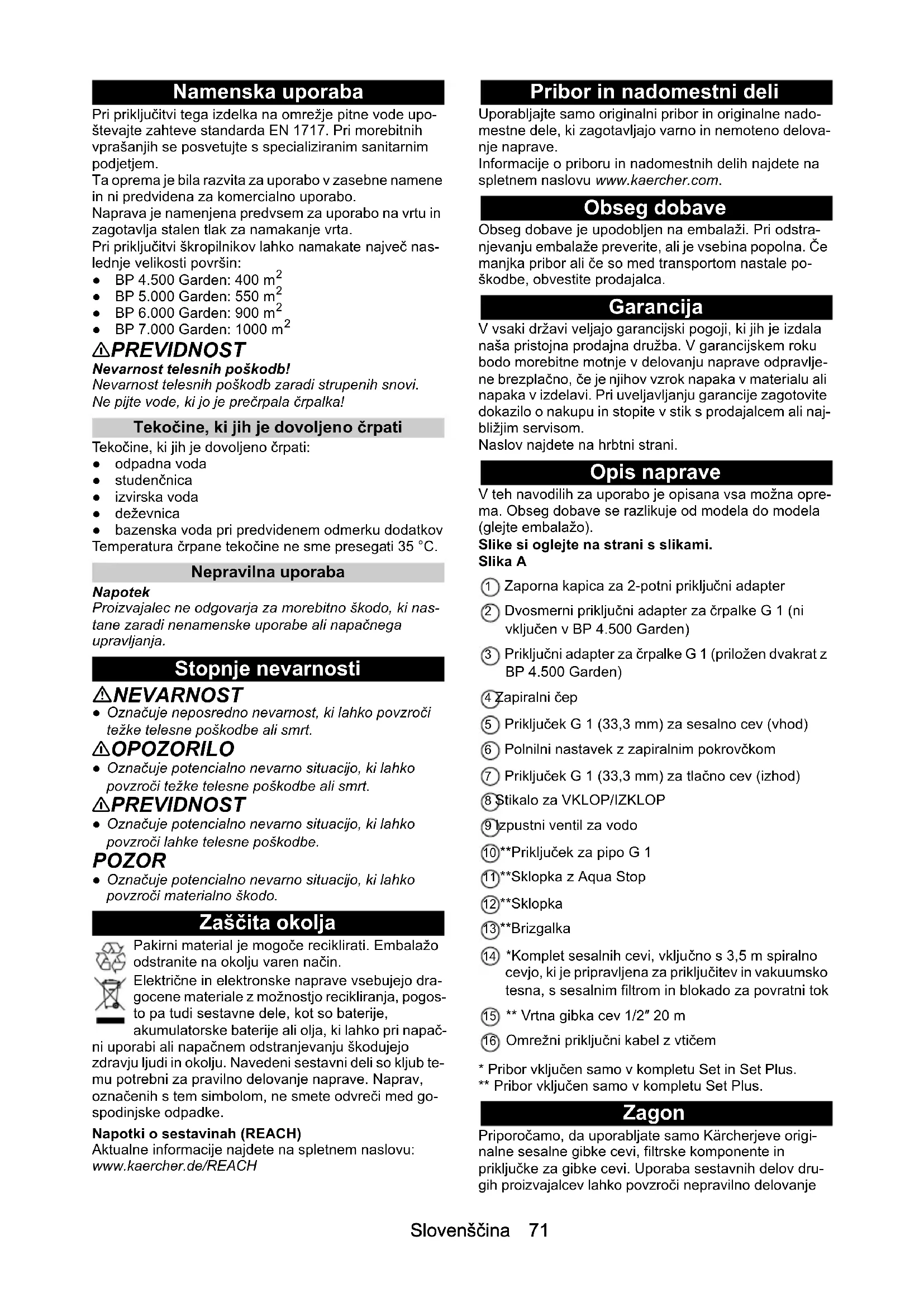 몇 PREVIDNOST Nevarnost telesnih poškodb! Nevarnost telesnih poškodb zaradi strupenih snovi. Ne pijte vode, ki jo je prečrpala črpalka! Tekočine, ki jih je dovoljeno črpati Tekočine, ki jih je dovoljeno črpati: ● odpadna voda ● studenčnica ● izvirska voda ● deževnica ● bazenska voda pri predvidenem odmerku dodatkov Temperatura črpane tekočine ne sme presegati 35 °C. Nepravilna uporaba Napotek Proizvajalec ne odgovarja za morebitno škodo, ki nas- tane zaradi nenamenske uporabe ali napačnega upravljanja. Stopnje nevarnosti NEVARNOST ● Označuje neposredno nevarnost, ki lahko povzroči težke telesne poškodbe ali smrt. 몇 OPOZORILO ● Označuje potencialno nevarno situacijo, ki lahko povzroči težke telesne poškodbe ali smrt. 몇 PREVIDNOST ● Označuje potencialno nevarno situacijo, ki lahko povzroči lahke telesne poškodbe. POZOR ● Označuje potencialno nevarno situacijo, ki lahko povzroči materialno škodo. Zaščita okolja Pakirni material je mogoče reciklirati. Embalažo odstranite na okolju varen način. Električne in elektronske naprave vsebujejo dra- gocene materiale z možnostjo recikliranja, pogos- to pa tudi sestavne dele, kot so baterije, akumulatorske baterije ali olja, ki lahko pri napač- ni uporabi ali napačnem odstranjevanju škodujejo zdravju ljudi in okolju. Navedeni sestavni deli so kljub te- mu potrebni za pravilno delovanje naprave. Naprav, označenih s tem simbolom, ne smete odvreči med go- spodinjske odpadke. Napotki o sestavinah (REACH) Aktualne informacije najdete na spletnem naslovu: www.kaercher.de/REACH Pribor in nadomestni deli Uporabljajte samo originalni pribor in originalne nado- mestne dele, ki zagotavljajo varno in nemoteno delova- nje naprave. Informacije o priboru in nadomestnih delih najdete na spletnem naslovu www.kaercher.com. Obseg dobave Obseg dobave je upodobljen na embalaži. Pri odstra- njevanju embalaže preverite, ali je vsebina popolna. Če manjka pribor ali če so med transportom nastale po- škodbe, obvestite prodajalca. Garancija V vsaki državi veljajo garancijski pogoji, ki jih je izdala naša pristojna prodajna družba. V garancijskem roku bodo morebitne motnje v delovanju naprave odpravlje- ne brezplačno, če je njihov vzrok napaka v materialu ali napaka v izdelavi. Pri uveljavljanju garancije zagotovite dokazilo o nakupu in stopite v stik s prodajalcem ali naj- bližjim servisom. Naslov najdete na hrbtni strani. Opis naprave V teh navodilih za uporabo je opisana vsa možna opre- ma. Obseg dobave se razlikuje od modela do modela (glejte embalažo). Slike si oglejte na strani s slikami. Slika A 1 Zaporna kapica za 2-potni priključni adapter 2 Dvosmerni priključni adapter za črpalke G 1 (ni vključen v BP 4.500 Garden) 3 Priključni adapter za črpalke G 1 (priložen dvakrat z BP 4.500 Garden) 4 Zapiralni čep 5 Priključek G 1 (33,3 mm) za sesalno cev (vhod) 6 Polnilni nastavek z zapiralnim pokrovčkom 7 Priključek G 1 (33,3 mm) za tlačno cev (izhod) 8 Stikalo za VKLOP/IZKLOP 9 Izpustni ventil za vodo 10 **Priključek za pipo G 1 11 **Sklopka z Aqua Stop 12 **Sklopka 13 **Brizgalka 14 *Komplet sesalnih cevi, vključno s 3,5 m spiralno cevjo, ki je pripravljena za priključitev in vakuumsko tesna, s sesalnim filtrom in blokado za povratni tok 15 ** Vrtna gibka cev 1/2″ 20 m 16 Omrežni priključni kabel z vtičem