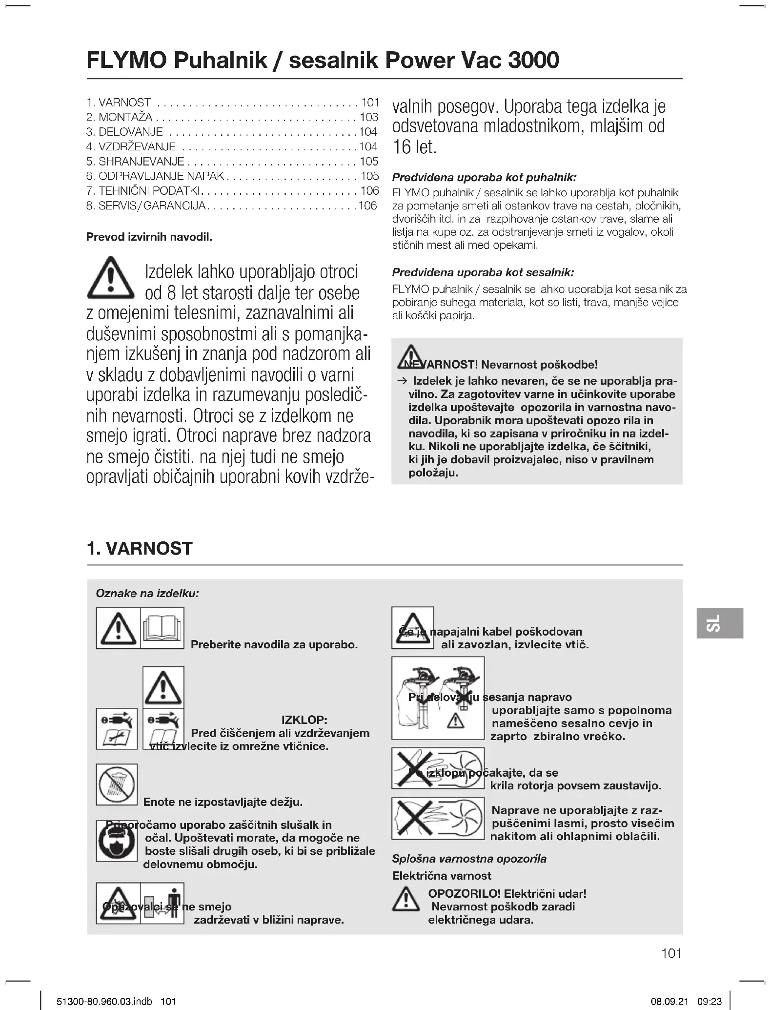 Preberite navodila za uporabo. IZKLOP: Pred čiščenjem ali vzdrževanjem vtič izvlecite iz omrežne vtičnice. Enote ne izpostavljajte dežju. Priporočamo uporabo zaščitnih slušalk in očal. Upoštevati morate, da mogoče ne boste slišali drugih oseb, ki bi se približale delovnemu območju. Opazovalci se ne smejo zadrževati v bližini naprave. Če je napajalni kabel poškodovan ali zavozlan, izvlecite vtič. Pri delovanju sesanja napravo uporabljajte samo s popolnoma nameščeno sesalno cevjo in zaprto zbiralno vrečko. Po izklopu počakajte, da se krila rotorja povsem zaustavijo. Naprave ne uporabljajte z raz- puščenimi lasmi, prosto visečim nakitom ali ohlapnimi oblačili. Splošna varnostna opozorila Električna varnost OPOZORILO! Električni udar! Nevarnost poškodb zaradi električnega udara. Oznake na izdelku:
