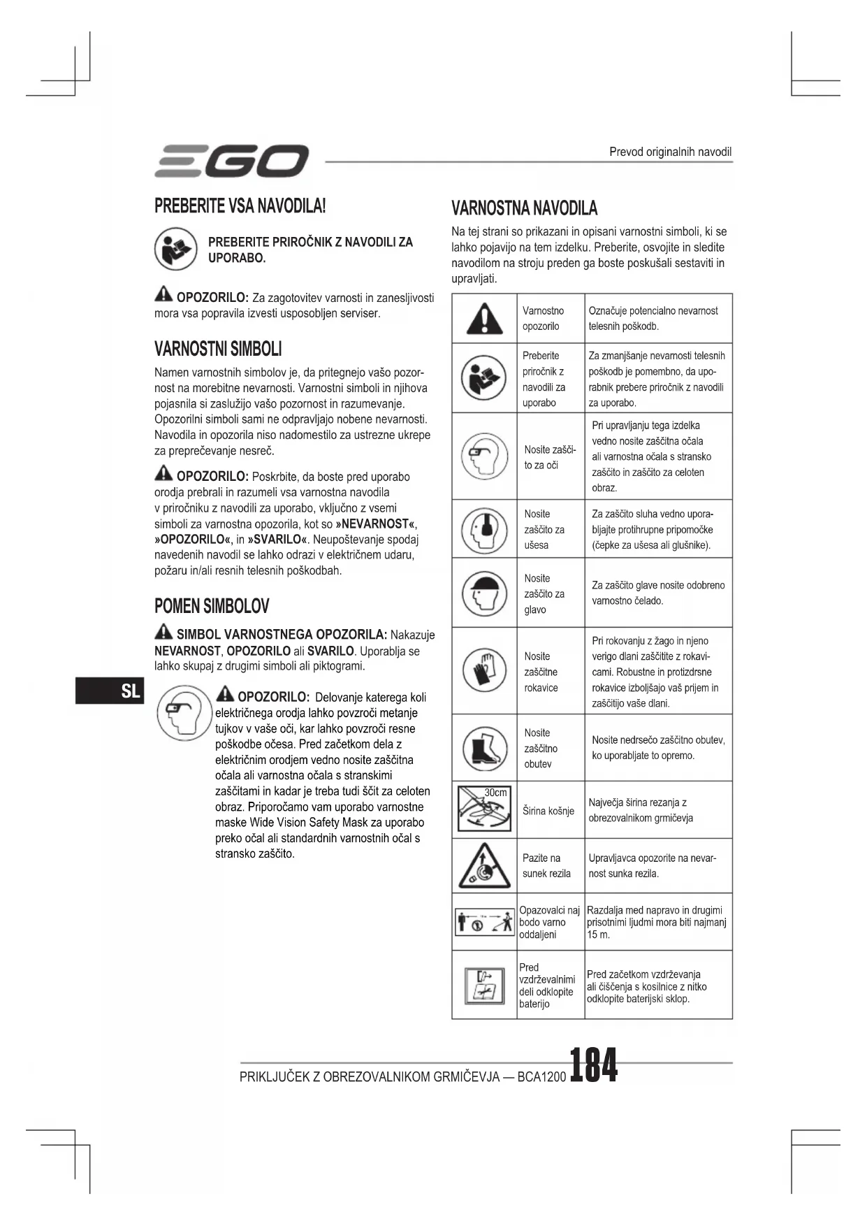 UPORABO. OPOZORILO: Za zagotovitev varnosti in zanesljivosti mora vsa popravila izvesti usposobljen serviser. VARNOSTNI SIMBOLI Namen varnostnih simbolov je, da pritegnejo vašo pozor- nost na morebitne nevarnosti. Varnostni simboli in njihova pojasnila si zaslužijo vašo pozornost in razumevanje. Opozorilni simboli sami ne odpravljajo nobene nevarnosti. Navodila in opozorila niso nadomestilo za ustrezne ukrepe za preprečevanje nesreč. OPOZORILO: Poskrbite, da boste pred uporabo orodja prebrali in razumeli vsa varnostna navodila v priročniku z navodili za uporabo, vključno z vsemi simboli za varnostna opozorila, kot so »NEVARNOST«, »OPOZORILO«, in »SVARILO«. Neupoštevanje spodaj navedenih navodil se lahko odrazi v električnem udaru, požaru in/ali resnih telesnih poškodbah. POMEN SIMBOLOV SIMBOL VARNOSTNEGA OPOZORILA: Nakazuje NEVARNOST, OPOZORILO ali SVARILO. Uporablja se lahko skupaj z drugimi simboli ali piktogrami. OPOZORILO: Delovanje katerega koli električnega orodja lahko povzroči metanje tujkov v vaše oči, kar lahko povzroči resne poškodbe očesa. Pred začetkom dela z električnim orodjem vedno nosite zaščitna očala ali varnostna očala s stranskimi zaščitami in kadar je treba tudi ščit za celoten obraz. Priporočamo vam uporabo varnostne maske Wide Vision Safety Mask za uporabo preko očal ali standardnih varnostnih očal s stransko zaščito. VARNOSTNA NAVODILA Na tej strani so prikazani in opisani varnostni simboli, ki se lahko pojavijo na tem izdelku. Preberite, osvojite in sledite navodilom na stroju preden ga boste poskušali sestaviti in upravljati. Varnostno opozoriloOznačuje potencialno nevarnost telesnih poškodb.Preberite priročnik z navodili za uporaboZa zmanjšanje nevarnosti telesnih poškodb je pomembno, da upo-rabnik prebere priročnik z navodili za uporabo.Nosite zašči-to za očiPri upravljanju tega izdelka vedno nosite zaščitna očala ali varnostna očala s stransko zaščito in zaščito za celoten obraz.Nosite zaščito za ušesaZa zaščito sluha vedno upora-bljajte protihrupne pripomočke (čepke za ušesa ali glušnike).Nosite zaščito za glavoZa zaščito glave nosite odobreno varnostno čelado.Nosite zaščitne rokavicePri rokovanju z žago in njeno verigo dlani zaščitite z rokavi-cami. Robustne in protizdrsne rokavice izboljšajo vaš prijem in zaščitijo vaše dlani.Nosite zaščitno obutevNosite nedrsečo zaščitno obutev, ko uporabljate to opremo. 30cm Širina košnjeNajvečja širina rezanja z obrezovalnikom grmičevjaPazite na sunek rezilaUpravljavca opozorite na nevar-nost sunka rezila. Opazovalci naj bodo varno oddaljeniRazdalja med napravo in drugimi prisotnimi ljudmi mora biti najmanj 15 m.Pred vzdrževalnimi deli odklopite baterijoPred začetkom vzdrževanja ali čiščenja s kosilnice z nitko odklopite baterijski sklop. Prevod originalnih navodilPRIKLJUČEK Z OBREZOVALNIKOM GRMIČEVJA — BCA1200 185