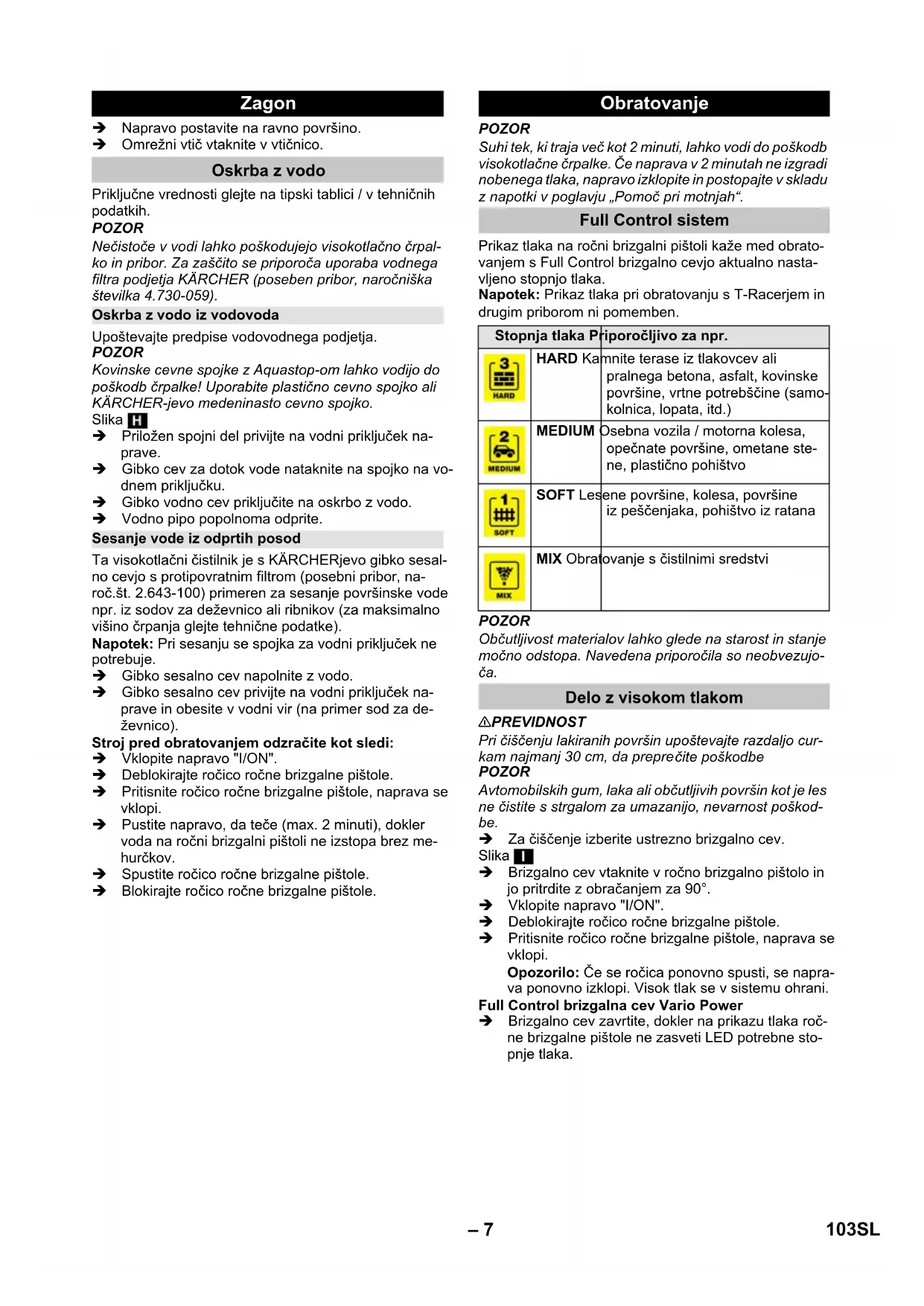 - Opcijsko 28 Rotacijska krtača za pranje Posebej primerna za avtomobilsko čiščenje. 29 Šoba za peno s posodo za čistilo Iz posode se sesa čistilo in nastane učinkovita pena čistila. 30 Plug 'n' Clean steklenice za čistilno sredstvo z za- pornim pokrovom ** Dodatno potrebno 31 S platnom ojačana gibka vodna cev z običajnim pri- ključkom. – Premer najmanj 1/2 cole (13 mm) – Dolžina najmanj 7,5 m Montaža Montiranje koles Montaža podstavka Montaža shranjevala za brizgalne cevi Montiranje transportnega ročaja Namestitev mreže za predal za pribor Odvijanje visokotlačne gibke cevi Vstavljanje visokotlačne gibke cevi skozi cevno vodilo Spojitev visokotlačne gibke cevi z ročno brizgalno pištolo 102 SL– 7 Napravo postavite na ravno površino. Omrežni vtič vtaknite v vtičnico. Priključne vrednosti glejte na tipski tablici / v tehničnih podatkih. POZOR Nečistoče v vodi lahko poškodujejo visokotlačno črpal- ko in pribor. Za zaščito se priporoča uporaba vodnega filtra podjetja KÄRCHER (poseben pribor, naročniška številka 4.730-059). Upoštevajte predpise vodovodnega podjetja. POZOR Kovinske cevne spojke z Aquastop-om lahko vodijo do poškodb črpalke! Uporabite plastično cevno spojko ali KÄRCHER-jevo medeninasto cevno spojko. Slika Priložen spojni del privijte na vodni priključek na- prave. Gibko cev za dotok vode nataknite na spojko na vo- dnem priključku. Gibko vodno cev priključite na oskrbo z vodo. Vodno pipo popolnoma odprite. Ta visokotlačni čistilnik je s KÄRCHERjevo gibko sesal- no cevjo s protipovratnim filtrom (posebni pribor, na- roč.št. 2.643-100) primeren za sesanje površinske vode npr. iz sodov za deževnico ali ribnikov (za maksimalno višino črpanja glejte tehnične podatke). Napotek: Pri sesanju se spojka za vodni priključek ne potrebuje. Gibko sesalno cev napolnite z vodo. Gibko sesalno cev privijte na vodni priključek na- prave in obesite v vodni vir (na primer sod za de- ževnico). Stroj pred obratovanjem odzračite kot sledi: Vklopite napravo "I/ON". Deblokirajte ročico ročne brizgalne pištole. Pritisnite ročico ročne brizgalne pištole, naprava se vklopi. Pustite napravo, da teče (max. 2 minuti), dokler voda na ročni brizgalni pištoli ne izstopa brez me- hurčkov. Spustite ročico ročne brizgalne pištole. Blokirajte ročico ročne brizgalne pištole. POZOR Suhi tek, ki traja več kot 2 minuti, lahko vodi do poškodb visokotlačne črpalke. Če naprava v 2 minutah ne izgradi nobenega tlaka, napravo izklopite in postopajte v skladu z napotki v poglavju „Pomoč pri motnjah“. Prikaz tlaka na ročni brizgalni pištoli kaže med obrato- vanjem s Full Control brizgalno cevjo aktualno nasta- vljeno stopnjo tlaka. Napotek: Prikaz tlaka pri obratovanju s T-Racerjem in drugim priborom ni pomemben. POZOR Občutljivost materialov lahko glede na starost in stanje močno odstopa. Navedena priporočila so neobvezujo- ča. 몇 PREVIDNOST Pri čiščenju lakiranih površin upoštevajte razdaljo cur- kam najmanj 30 cm, da prepre čite poškodbe POZOR Avtomobilskih gum, laka ali občutljivih površin kot je les ne čistite s strgalom za umazanijo, nevarnost poškod- be. Za čiščenje izberite ustrezno brizgalno cev. Slika Brizgalno cev vtaknite v ročno brizgalno pištolo in jo pritrdite z obračanjem za 90°. Vklopite napravo "I/ON". Deblokirajte ročico ročne brizgalne pištole. Pritisnite ročico ročne brizgalne pištole, naprava se vklopi. Opozorilo: Če se ročica ponovno spusti, se napra- va ponovno izklopi. Visok tlak se v sistemu ohrani. Full Control brizgalna cev Vario Power Brizgalno cev zavrtite, dokler na prikazu tlaka roč- ne brizgalne pištole ne zasveti LED potrebne sto- pnje tlaka. Zagon Oskrba z vodo Oskrba z vodo iz vodovoda Sesanje vode iz odprtih posod Obratovanje Full Control sistem Stopnja tlaka Priporočljivo za npr. HARD Kamnite terase iz tlakovcev ali pralnega betona, asfalt, kovinske površine, vrtne potrebščine (samo- kolnica, lopata, itd.) MEDIUM Osebna vozila / motorna kolesa, opečnate površine, ometane ste- ne, plastično pohištvo SOFT Lesene površine, kolesa, površine iz peščenjaka, pohištvo iz ratana MIX Obratovanje s čistilnimi sredstvi Delo z visokom tlakom 103SL– 8 POZOR Nevarnost poškodb laka Pri delih s pralno krtačo mora biti le-ta brez umazanije ali drugih delcev. Pralno krtačo vtaknite v ročno brizgalno pištolo in jo pritrdite z obračanjem za 90°. Opozorilo: Po potrebi se lahko uporabijo tudi pračne kr- tače za delo s čistilnim sredstvom.