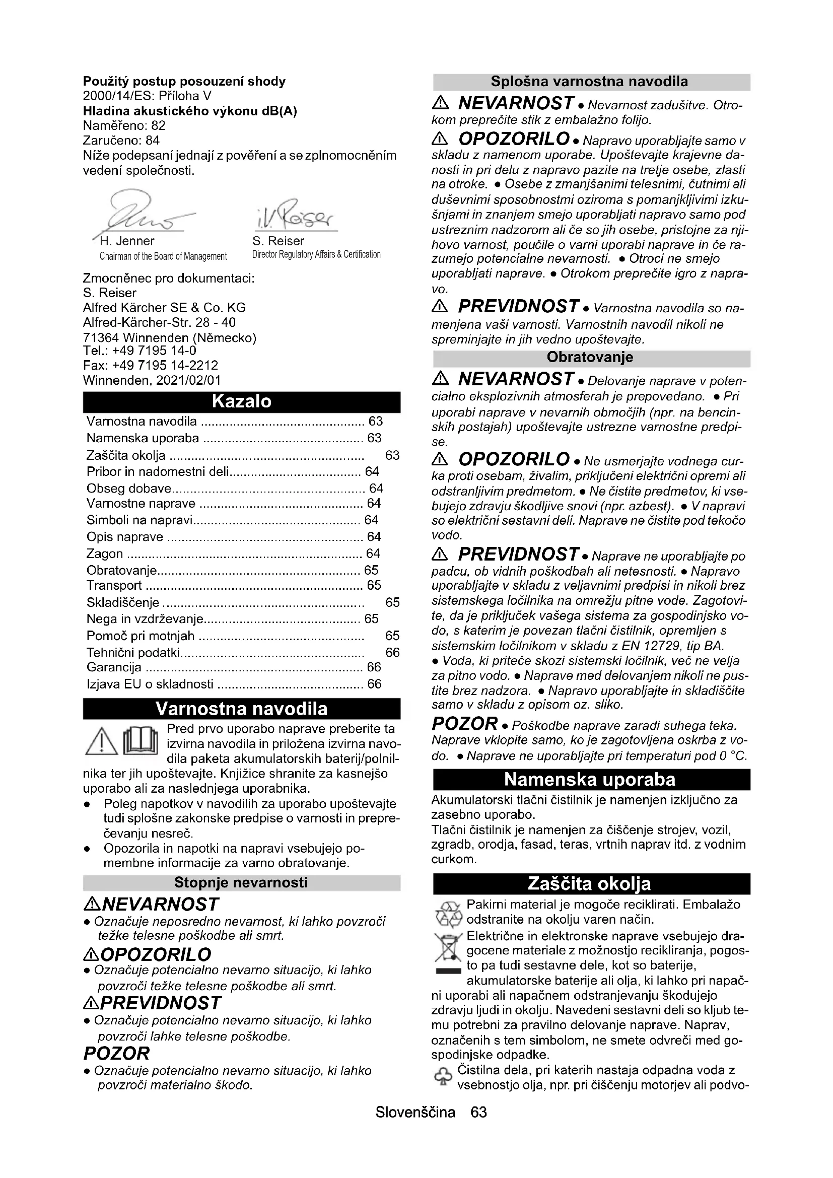 - dB(A) 84Slovenščina 63 Použitý postup posouzení shody 2000/14/ES: Příloha V Hladina akustického výkonu dB(A) Naměřeno: 82 Zaručeno: 84 Níže podepsaní jednají z pověření a se zplnomocněním vedení společnosti. Zmocněnec pro dokumentaci: S. Reiser Alfred Kärcher SE & Co. KG Alfred-Kärcher-Str. 28 - 40 71364 Winnenden (Německo) Tel.: +49 7195 14-0 Fax: +49 7195 14-2212 Winnenden, 2021/02/01 Kazalo Varnostna navodila Pred prvo uporabo naprave preberite ta izvirna navodila in priložena izvirna navo- dila paketa akumulatorskih baterij/polnil- nika ter jih upoštevajte. Knjižice shranite za kasnejšo uporabo ali za naslednjega uporabnika. ● Poleg napotkov v navodilih za uporabo upoštevajte tudi splošne zakonske predpise o varnosti in prepre- čevanju nesreč. ● Opozorila in napotki na napravi vsebujejo po- membne informacije za varno obratovanje. Stopnje nevarnosti NEVARNOST ● Označuje neposredno nevarnost, ki lahko povzroči težke telesne poškodbe ali smrt. 몇 OPOZORILO ● Označuje potencialno nevarno situacijo, ki lahko povzroči težke telesne poškodbe ali smrt. 몇 PREVIDNOST ● Označuje potencialno nevarno situacijo, ki lahko povzroči lahke telesne poškodbe. POZOR ● Označuje potencialno nevarno situacijo, ki lahko povzroči materialno škodo. Splošna varnostna navodila NEVARNOST ● Nevarnost zadušitve. Otro- kom preprečite stik z embalažno folijo. 몇 OPOZORILO ● Napravo uporabljajte samo v skladu z namenom uporabe. Upoštevajte krajevne da- nosti in pri delu z napravo pazite na tretje osebe, zlasti na otroke. ● Osebe z zmanjšanimi telesnimi, čutnimi ali duševnimi sposobnostmi oziroma s pomanjkljivimi izku- šnjami in znanjem smejo uporabljati napravo samo pod ustreznim nadzorom ali če so jih osebe, pristojne za nji- hovo varnost, poučile o varni uporabi naprave in če ra- zumejo potencialne nevarnosti. ● Otroci ne smejo uporabljati naprave. ● Otrokom preprečite igro z napra- vo. 몇 PREVIDNOST ● Varnostna navodila so na- menjena vaši varnosti. Varnostnih navodil nikoli ne spreminjajte in jih vedno upoštevajte. Obratovanje NEVARNOST ● Delovanje naprave v poten- cialno eksplozivnih atmosferah je prepovedano. ● Pri uporabi naprave v nevarnih območjih (npr. na bencin- skih postajah) upoštevajte ustrezne varnostne predpi- se. 몇 OPOZORILO ● Ne usmerjajte vodnega cur- ka proti osebam, živalim, priključeni električni opremi ali odstranljivim predmetom. ● Ne čistite predmetov, ki vse- bujejo zdravju škodljive snovi (npr. azbest). ● V napravi so električni sestavni deli. Naprave ne čistite pod tekočo vodo. 몇 PREVIDNOST ● Naprave ne uporabljajte po padcu, ob vidnih poškodbah ali netesnosti. ● Napravo uporabljajte v skladu z veljavnimi predpisi in nikoli brez sistemskega ločilnika na omrežju pitne vode. Zagotovi- te, da je priključek vašega sistema za gospodinjsko vo- do, s katerim je povezan tlačni čistilnik, opremljen s sistemskim ločilnikom v skladu z EN 12729, tip BA. ● Voda, ki priteče skozi sistemski ločilnik, več ne velja za pitno vodo. ● Naprave med delovanjem nikoli ne pus- tite brez nadzora. ● Napravo uporabljajte in skladiščite samo v skladu z opisom oz. sliko. POZOR ● Poškodbe naprave zaradi suhega teka. Naprave vklopite samo, ko je zagotovljena oskrba z vo- do. ● Naprave ne uporabljajte pri temperaturi pod 0 °C. Namenska uporaba Akumulatorski tlačni čistilnik je namenjen izključno za zasebno uporabo. Tlačni čistilnik je namenjen za čiščenje strojev, vozil, zgradb, orodja, fasad, teras, vrtnih naprav itd. z vodnim curkom. Zaščita okolja Pakirni material je mogoče reciklirati. Embalažo odstranite na okolju varen način. Električne in elektronske naprave vsebujejo dra- gocene materiale z možnostjo recikliranja, pogos- to pa tudi sestavne dele, kot so baterije, akumulatorske baterije ali olja, ki lahko pri napač- ni uporabi ali napačnem odstranjevanju škodujejo zdravju ljudi in okolju. Navedeni sestavni deli so kljub te- mu potrebni za pravilno delovanje naprave. Naprav, označenih s tem simbolom, ne smete odvreči med go- spodinjske odpadke. Čistilna dela, pri katerih nastaja odpadna voda z vsebnostjo olja, npr. pri čiščenju motorjev ali podvo- Varnostna navodila p. 63