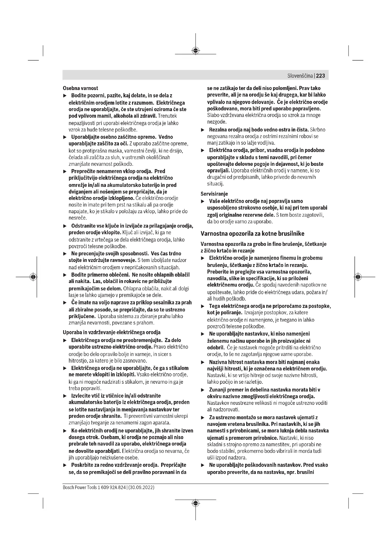Raven tresljajev, podana v teh navodilih, je bila izmerjena v skladu s standardiziranim merilnim postopkom in se lahko uporablja za primerjavo električnih orodij med seboj. Primerna je tudi za začasno oceno obremenjenosti s tresljaji. Navedena raven tresljajev je določena na osnovi glavnega načina uporabe električnega orodja. Če se električno orodje uporablja v druge namene, z drugačnimi nastavki ali pri nezadostnem vzdrževanju, lahko raven tresljajev odstopa. To lahko obremenjenost s tresljaji v obdobju uporabe občutno poveča. Za natančnejšo oceno obremenjenosti s tresljaji morate upoštevati tudi čas, ko je orodje izklopljeno, in čas, ko orodje deluje, vendar dejansko ni v uporabi. To lahko obremenjenost s tresljaji v obdobju uporabe občutno zmanjša. Določite dodatne varnostne ukrepe za zaščito uporabnika pred vplivi tresljajev, npr. vzdrževanje električnega orodja in nastavkov, segrevanje rok, organizacija delovnih postopkov. Montaža Namestitev zaščitne opreme u Pred začetkom kakršnih koli del na električnem orodju izvlecite omrežni vtič iz vtičnice. Opomba: po lomu brusilnega koluta med obratovanjem ali pri poškodovanju prijemal na zaščitnem pokrovu/na električnem orodju, morate električno orodje takoj poslati na servsno službo; naslovi so navedeni v odstavku „Servisna služba in svetovanje uporabnikom“. Zaščitni pokrov za brušenje Zaščitni pokrov (6) namestite na steblo vretena. Položaj zaščitnega pokrova (6) prilagodite svojemu delu in pritrdite zaščitni pokrov (6) z nastavitvenim vijakom (7). u Nastavite zaščitni pokrov (6) tako, da se prepreči izmet isker v smer uporabnika. Zaščitni pokrov za rezanje u Pri rezanju z vezanimi brusilnimi sredstvi vedno uporabljajte zaščitni pokrov za rezanje (14). u Pri rezanju kamna morate poskrbeti za zadostno odsesavanje prahu. Zaščitni pokrov za rezanje (14) se namesti tako kot zaščitni pokrov za brušenje (6). Pokrov za odsesavanje za rezanje z vodili Za montažo odsesovalnega pokrova za rezanje z vodili(23) upoštevajte navodila za uporabo odsesovalnega pokrova. Dodatni ročaj u Svoje električno orodje uporabljajte zgolj z dodatnim ročajem (3). Dodatni ročaj (3) privijte glede na način izvajanja dela desno ali levo od glave gonila. Zaščita za roke u Za izvajanje dela z gumijastim brusilnim krožnikom (18) ali z lončasto ščetko/kolutno ščetko/lamelno brusilno ploščo montirajte vedno tudi zaščito za roke. (16). Zaščito za roke (16) pritrdite skupaj z dodatnim ročajem (3). Namestitev brusilnih pripomočkov u Pred začetkom kakršnih koli del na električnem orodju izvlecite omrežni vtič iz vtičnice. u Brusilnih in rezalnih plošč se ne dotikajte, dokler se ne ohladijo. Plošče se med delom močno segrejejo. Očistite brusilno vreteno (5) in vse dele, ki jih je treba montirati. Za vpenjanje in sprostitev brusilnih nastavkov pritisnite tipko za zaklep vretena (1), da pritrdite brusilno vreteno. u Tipko za zaklep vretena pritiskajte le, ko brusilno vreteno miruje. V nasprotnem primeru se lahko električno orodje poškoduje. Brusilna/rezalna plošča Bodite pozorni na dimenzije brusilnih nastavkov. Premer odprtine mora ustrezati prijemalni prirobnici. Ne uporabljajte adapterjev ali reducirnih obročev. Če uporabljate diamantne rezalne plošče, bodite pozorni, da se puščica smeri vrtenja na diamantni rezalni plošči in smer vrtenja električnega orodja (glejte puščico smeri vrtenja na glavi gonila) ujemata. Korake namestitve najdete na strani s shemami. Za pritrditev brusilne/rezalne plošče najprej namestite zatezno matico(10) in jo nato privijte s ključem za dve luknji (glejte „Hitrozatezna matica “, Stran228). u Po montaži brusilnega orodja pred vklopom preverite, ali je brusilno orodje pravilno montirano in ali se lahko prosto vrti. Poskrbite, da se brusilno orodje ne dotika zaščitnega pokrova ali drugih delov. V prijemalni prirobnici (8) je okrog centrirnega venca nameščen plastični del (tesnilni obroček). Če tesnilnega obročka ni ali pa je ta poškodovan, je treba pred nadaljnjo uporabo obvezno zamenjati prijemalno prirobnico (8). Lamelna brusilna plošča u Za delo z lamelno brusilno ploščo je treba vedno namestiti zaščito za roke (16). Gumijasti brusilni krožnik u Za delo z gumijastim brusilnim krožnikom (18) je treba vedno namestiti zaščito za roke (16). Vrstni red pri montaži je prikazan na strani z grafičnim prikazom. Pred montažo gumijastega brusilnega krožnika (18) namestite 2 distančni podložki (17) na brusilno vreteno (5). Bosch Power Tools 1 609 92A 824 | (30.09.2022)228 | Slovenščina Privijte okroglo matico (20) in jo zategnite s ključem za dve luknji. Lončasta ščetka/kolutna ščetka u Za delo z lončasto ščetko ali kolutno ščetko je treba vedno namestiti zaščito za roke (16). Vrstni red pri montaži je prikazan na strani z grafičnim prikazom. Lončasto ščetko/kolutno ščetko je treba priviti tako globoko na brusilno vreteno, da bo prirobnica brusilnega vretena na koncu navoja brusilnega vretena nameščena tesno ob nastavku. Zategnite lončasto ščetko/kolutno ščetko z viličastim ključem. Hitrozatezna matica Za preprosto menjavo brusilnega nastavka brez uporabe drugih orodij lahko namesto zatezne matice (10) uporabite hitrovpenjalno matico (12). u Hitrozatezna matica(12) se lahko uporablja zgolj z brusilnimi ali rezalnimi ploščami s premerom luknje 22,2mm. Uporabljajte le brezhibno, nepoškodovano hitrovpenjalno matico (12). Pri privijanju pazite na to, da stran z napisom na hitrovpenjalni matici (12) ne bo obrnjena proti brusilni plošči; puščica mora biti obrnjena proti indeksni oznaki (24). (24) Pritisnite tipko za blokado vretena (1) za blokado brusilnega vretena. Če želite hitrovpenjalno matico zategniti, privijte brusilno ploščo močno v desno. Ustrezno pritrjeno in nepoškodovano hitrovpenjalno matico lahko ročno odvijete z vrtenjem narebričenega obroča v levo. Zategnjene h