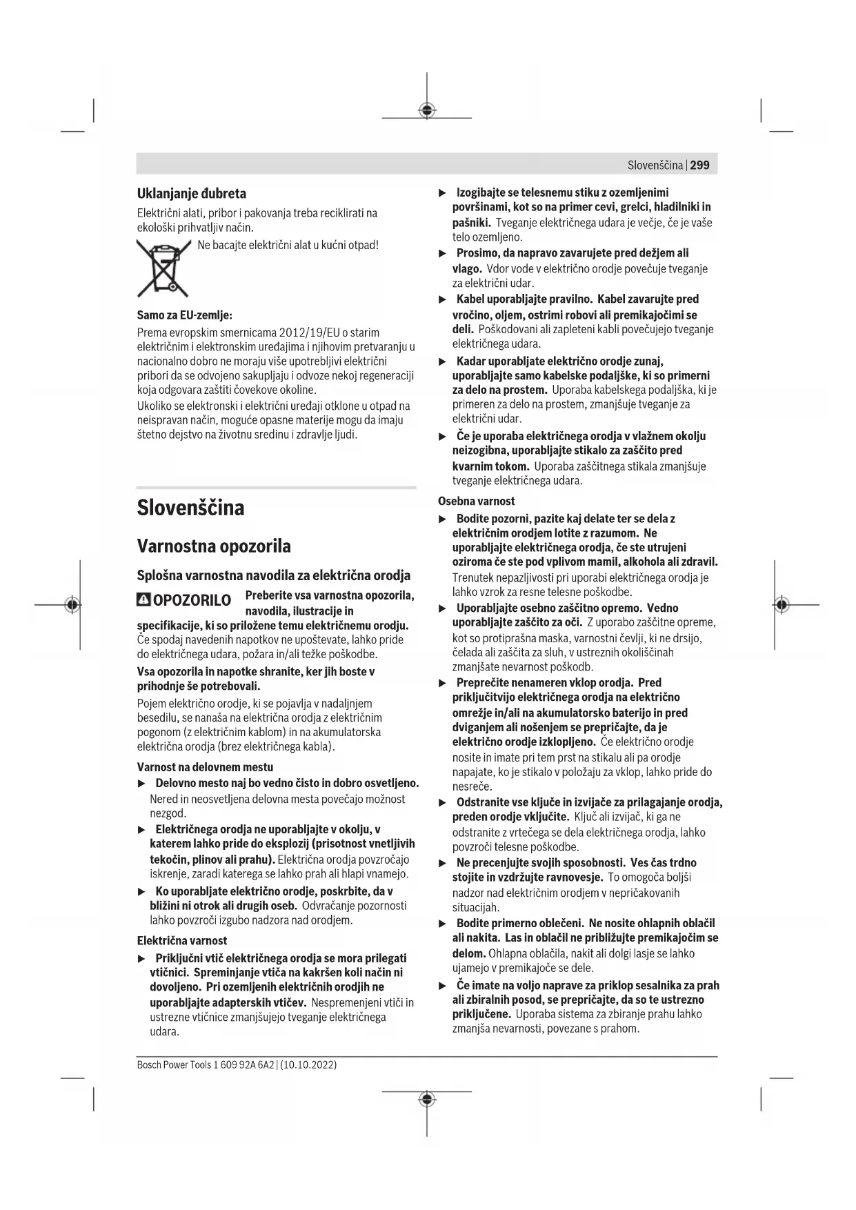 Navedene vrednosti stopenj števila vrtljajev so le informativne vrednosti. Montaža Namestitev zaščitne opreme u Pred začetkom kakršnih koli del na električnem orodju izvlecite omrežni vtič iz vtičnice. Opomba: po lomu brusilnega koluta med obratovanjem ali pri poškodovanju prijemal na zaščitnem pokrovu/na električnem orodju, morate električno orodje takoj poslati na servsno službo; naslovi so navedeni v odstavku „Servisna služba in svetovanje uporabnikom“. Zaščitni pokrov za brušenje Zaščitni pokrov (11) položite na vpetje na električnem orodju, pri čemer se morajo kodirni nastavki zaščitnega pokrova ujemati z vpetjem. V ta namen pritisnite in držite sprostitveno ročico (1). Zaščitni pokrov (11) pritisnite na steblo vretena, da rob zaščitnega pokrova nasede na prirobnico električnega orodja, nato zaščitni pokrov obrnite, da se slišno zaskoči. Položaj zaščitnega pokrova (11) prilagodite zahtevam delovnega postopka. V ta namen potisnite sprostitveno ročico (1) navzgor in zaščitni pokrov (11) obrnite v želeni položaj. u Zaščitni pokrov(11) vedno namestite tako, da se nastavka sprostitvene ročice(1) zaskočita v ustrezne odprtine zaščitnega pokrova(11). u Nastavite zaščitni pokrov (11) tako, da se prepreči izmet isker v smer uporabnika. u Zaščitni pokrov (11) se sme vrteti le, ko pritisnete na sprostitveno ročico (1)! V nasprotnem primeru nadaljnja uporaba električnega orodja ni dovoljena in ga je treba dostaviti na popravilo v servisno delavnico. Opozorilo: kodirni nastavki na zaščitnem pokrovu (11) poskrbijo za to, da je mogoče namestiti samo zaščitni pokrov, ki ustreza električnemu orodju. Zaščitni pokrov za rezanje u Za rezanje vedno uporabite zaščitni pokrov za rezanje(13) ali zaščitni pokrov za brušenje (11) skupaj s pokrovom za rezanje(15). u Pri rezanju kamna morate poskrbeti za zadostno odsesavanje prahu. Zaščitni pokrov za rezanje (13) se namesti tako kot zaščitni pokrov za brušenje (11). Bosch Power Tools 1 609 92A 6A2 | (10.10.2022)306 | Slovenščina Pokrov za rezanje iz kovine Namestite pokrov za rezanje(15) iz kovine na zaščitni pokrov za brušenje(11) (glejte slikoA): prestavite držalo nazaj (➊). Namestite pokrov(15) na zaščitni pokrov za brušenje(11) (➋). Pritisnite držalo trdno na zaščitni pokrov(11) (➌). Za demontažo (glejte slikoB) pritisnite glavo na držalu (➊) in ga prestavite nazaj (➋). Povlecite pokrov(15) z zaščitnega pokrova(11) (➌). Plastičen pokrov za rezanje Plastičen ščitnik za rezanje(15) namestite na zaščitni pokrov za brušenje(11) (glejte slikoC). Ščitnik(15) se slišno in vidno zaskoči na zaščitni pokrov(11). Za odstranitev (glejte slikoD) ščitnik(15) na zaščitnem pokrovu(11) (➊) sprostite na levi ali desni strani in ga odstranite (➋). Pokrov za odsesavanje za rezanje z vodili Pokrov za odsesavanje za rezanje z vodili(27) se namesti tako kot zaščitni pokrov za brušenje. S pritrditvijo pomožnega ročaja(9)/(10) z ročajem na odsesovalnem pokrovu skozi ohišje motorja se električno orodje trdno poveže z odsesovalnim pokrovom. Na odsesovalni pokrov z vodili(27) lahko priključite primeren sesalnik za prah znamke Bosch. Za to namestite gibko sesalno cev z adapterjem za odsesavanje v namenski nastavek odsesovalnega pokrova. Opozorilo: trenje, ki nastane zaradi prahu v gibki sesalni cevi in priboru med sesanjem, povzroči elektrostatično napetost, ki jo lahko uporabnik občuti kot statično razelektritev (odvisno od okoliških dejavnikov in njegovega fiziološkega stanja). Bosch na splošno priporoča uporabo antistatične gibke sesalne cevi (pribor) za sesanje finega prahu in suhih materialov. Zaščita za roke u Za dela z gumijastimi brusilnimi krožniki(20) ali lončasto ščetko/stožčasto ščetko/diamantno vrtalno krono uporabite vedno zaščito za roko (19). Zaščito za roke (19) pritrdite skupaj z dodatnim ročajem (9). Standardni dodatni ročaj/dodatni ročaj za blaženje udarcev Dodatni ročaj(9)/(10) privijte glede na način izvedbe dela desno ali levo v glavo gonila. u Svoje električno orodje uporabljajte zgolj z dodatnim ročajem(9)/(10). u Ne uporabljajte električnega orodja, če je dodatni ročaj(9)/(10) poškodovan. Ne spreminjajte dodatnega ročaja(9)/(10). Dodatni ročaj za blaženje tresljajev(10) omogoča prijetnejše in varnejše delo z manj tresljaji. Namestitev in demontaža brusilnih nastavkov Upoštevajte posebna navodila za namestitev nastavkov X-LOCK. u Pred začetkom kakršnih koli del na električnem orodju izvlecite omrežni vtič iz vtičnice. u Brusilnih in rezalnih plošč se ne dotikajte, dokler se ne ohladijo. Plošče se med delom močno segrejejo. u Uporabite samo originalne nastavke X-LOCK, na katerih je logotip X-LOCK. Samo z uporabo originalnih nastavkov X- LOCK boste zagotovili, da bo debelina vpetja največ 1,6mm. Prevelika debelina vpetja lahko vodi do nepravilne namestitve, zaradi česar se lahko nastavek sprosti. u Za nastavke X-LOCK ne potrebujete dodatnih vpenjalnih in podpornih prirobnic. u Poskrbite za to, da na nastavku in vpetju ni deformacij, umazanije in tujkov. Upoštevajte dimenzije brusilnih nastavkov. Prepričajte se, da sta oba nastavka X-LOCK odprta (glejte naslednjo sliko), preden namestite nastavke X-LOCK. Po potrebi predel med obema nastavkoma X-LOCK očistite. Montaža orodja za brušenje ➊ Brusilno/rezalno ploščo/lamelno brusilno ploščo namestite sredinsko in vzporedno z naležno površino ter s pravilno stranjo obrnjeno navzgor na vpetje X- LOCK. ➋ Potisnite ploščo v smeri vpetja. ➌ Plošča se slišno zaskoči. Pri tem ne pritiskajte na ročico (3). (3) u Po montaži preverite, da rob orodja za brušenje (