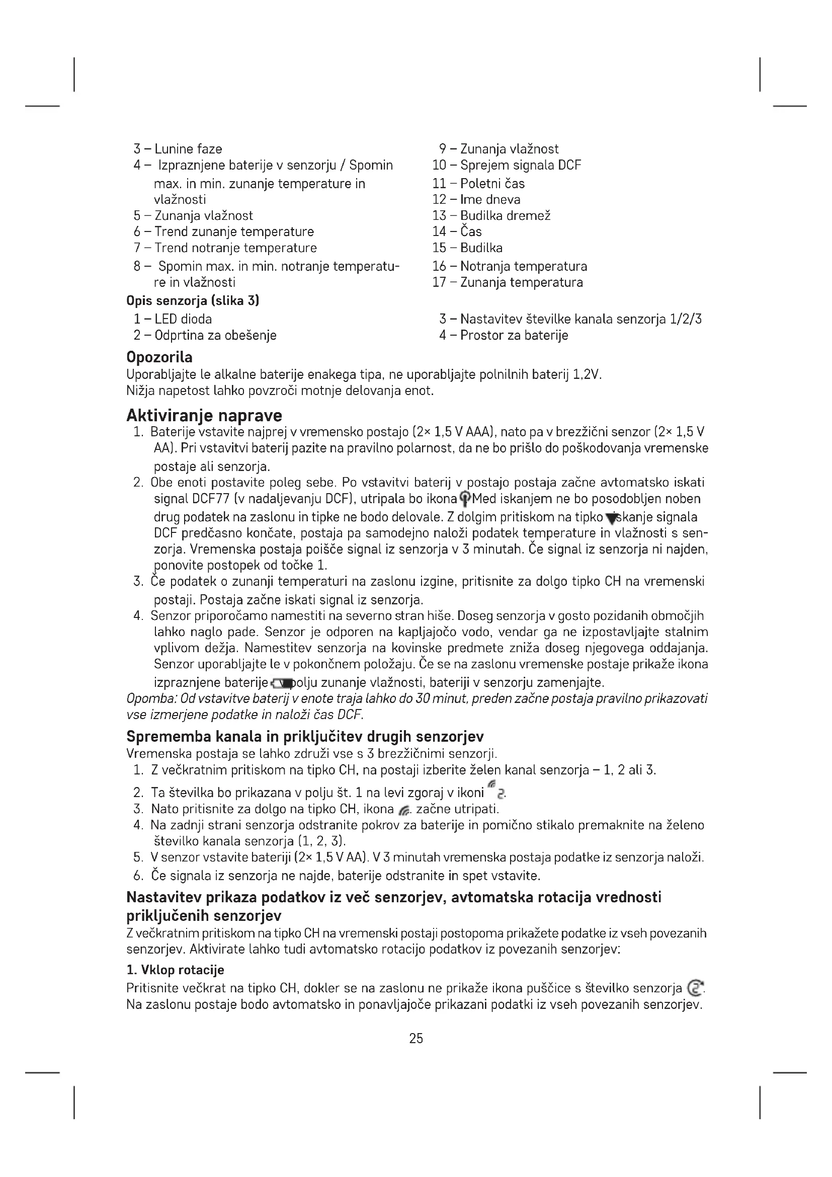 lahko naglo pade. Senzor je odporen na kapljajočo vodo, vendar ga ne izpostavljajte stalnim vplivom dežja. Namestitev senzorja na kovinske predmete zniža doseg njegovega oddajanja. Senzor uporabljajte le v pokončnem položaju. Če se na zaslonu vremenske postaje prikaže ikona izpraznjene baterije v polju zunanje vlažnosti, bateriji v senzorju zamenjajte. Opomba: Od vstavitve baterij v enote traja lahko do 30 minut, preden začne postaja pravilno prikazovati vse izmerjene podatke in naloži čas DCF. Sprememba kanala in priključitev drugih senzorjev Vremenska postaja se lahko združi vse s 3 brezžičnimi senzorji.