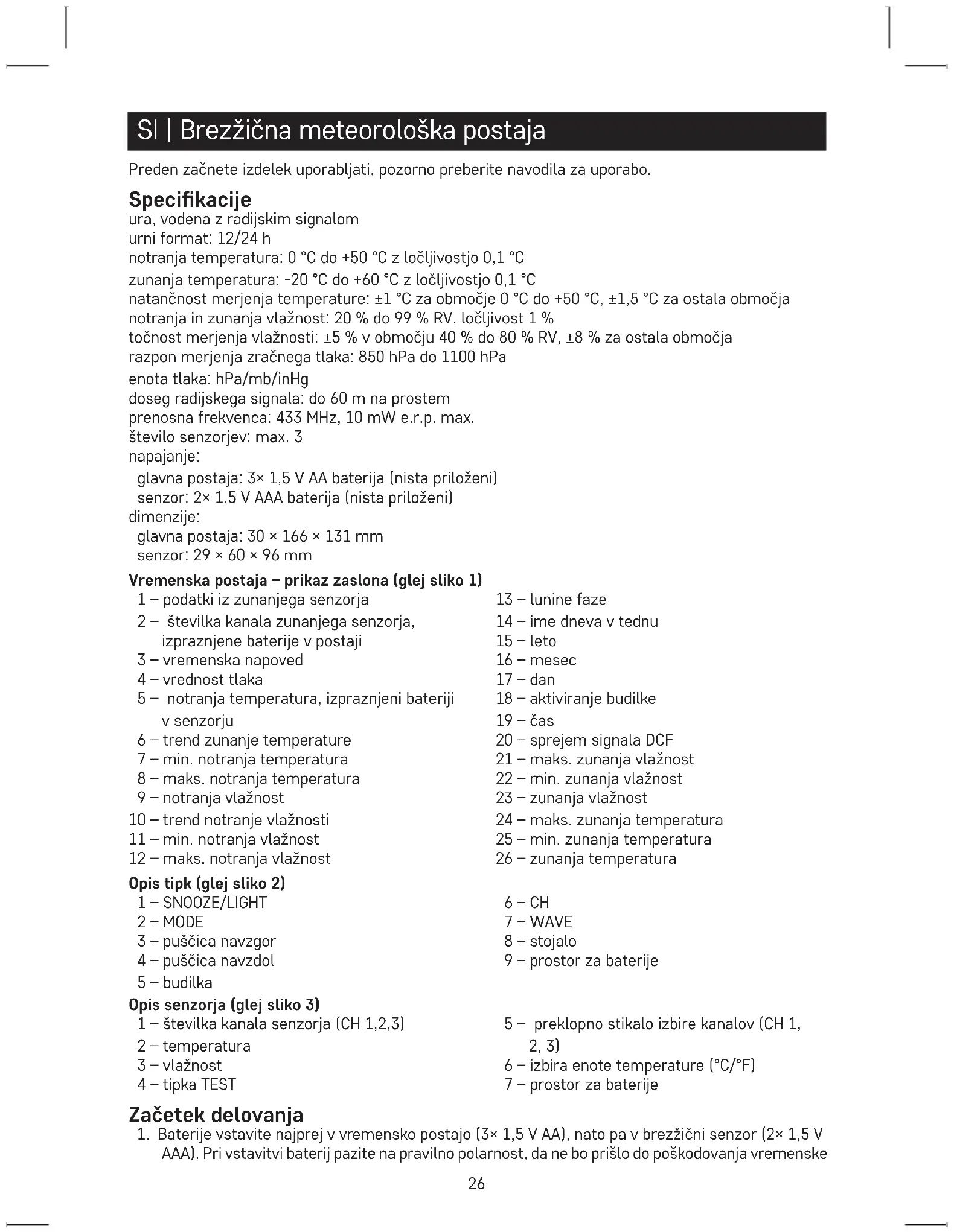 AAA). Pri vstavitvi baterij pazite na pravilno polarnost, da ne bo prišlo do poškodovanja vremenske27 postaje ali senzorja Uporabljajte le alkalne baterije 1,5V, ne uporabljajte polnilnih baterij 1,2V. Nižja napetost lahko povzroči motnje delovanja enot.
