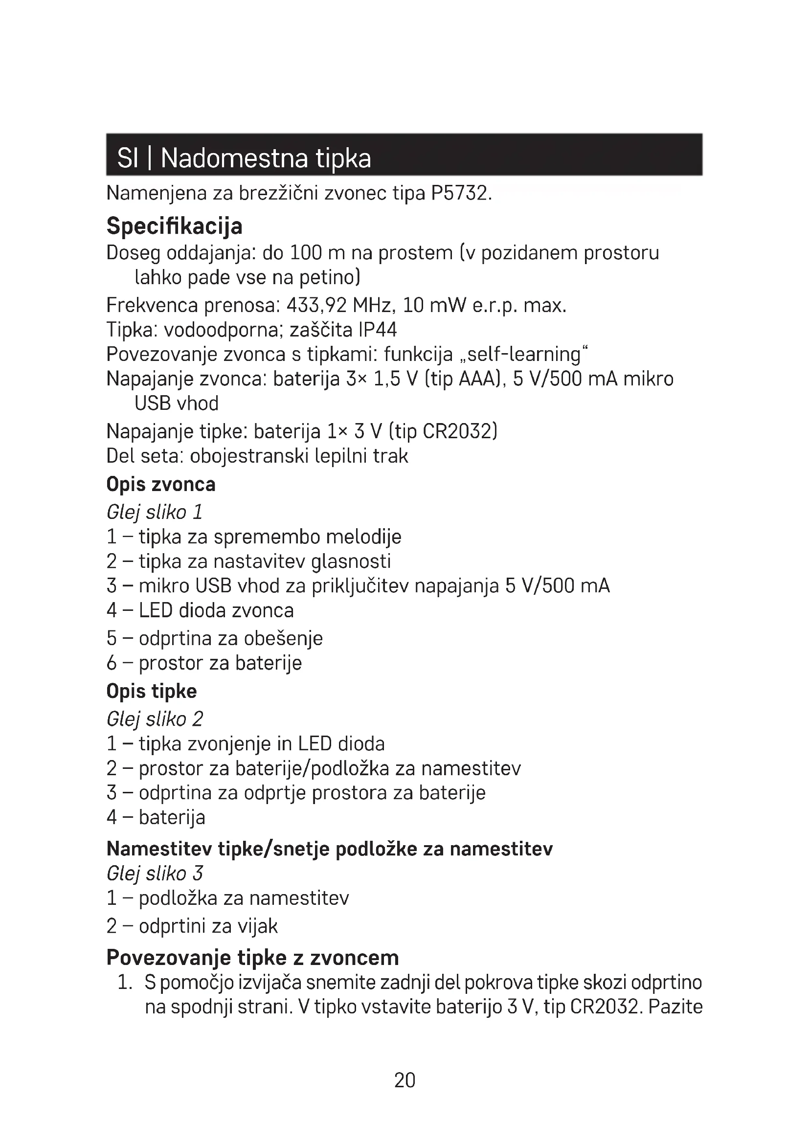 - Zvonec (sprejemnik) je namenjen le za notranjo uporabo v suhih prostorih.
