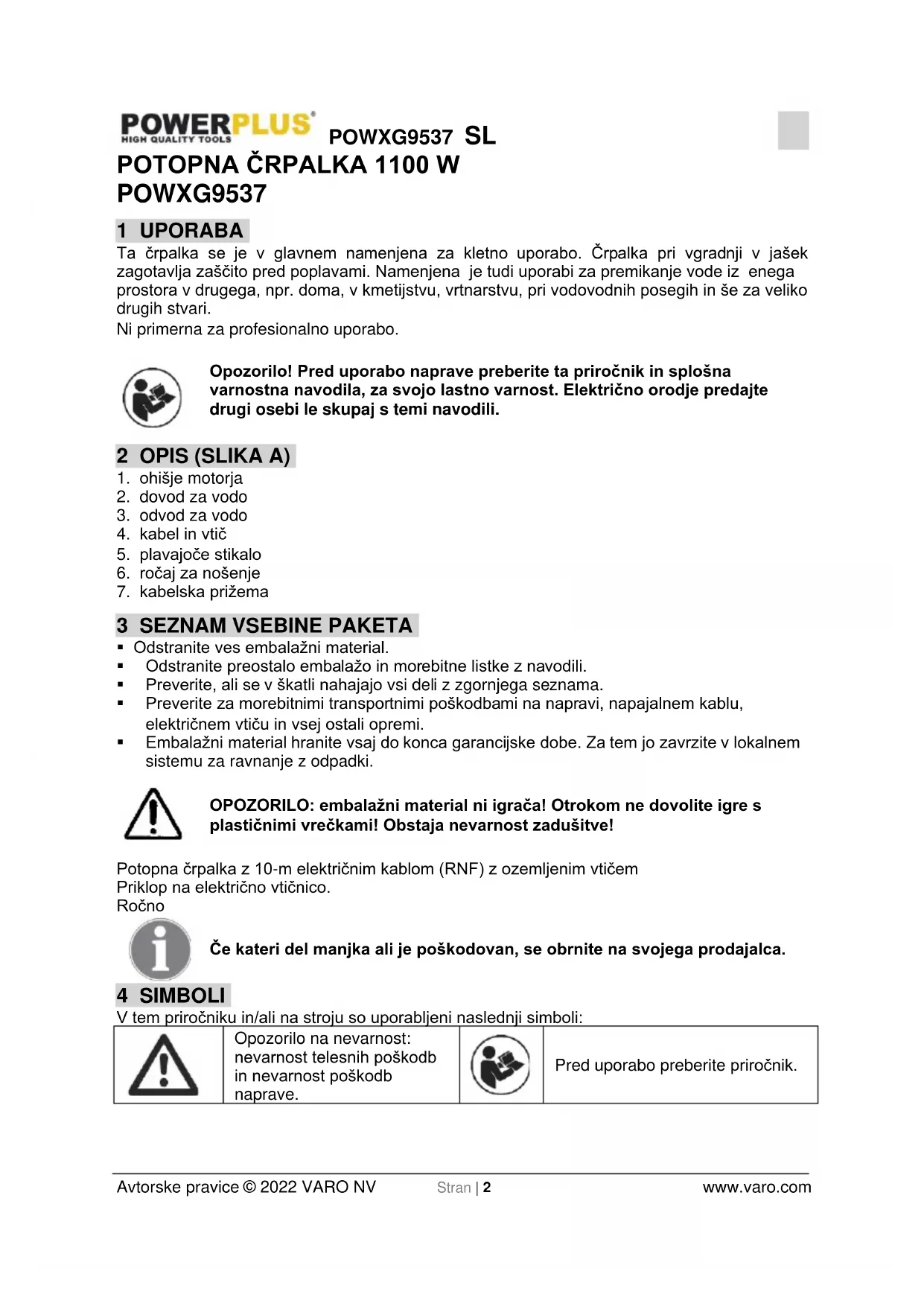 Pred uporabo preberite priročnik.POWXG9537 SL Avtorske pravice © 2022 VARO NV Stran | 3 www.varo.com 5 SPLOŠNA VARNOSTNA OPOZORILA ZA ELEKTRIČNO ORODJE Preberite si vsa varnostna opozorila in navodila. Zaradi neupoštevanja opozoril in navodil lahko pride do električnega udara, požara in/ali hude telesne poškodbe. Vsa opozorila in navodila shranite za vpogled v prihodnje. Izraz »električno orodje« v opozorilih zajema tako električno orodje, povezano z električnim omrežjem (s kablom), kot tudi električna orodja z baterijskim napajanjem (brez kabla). 6 PRED ZAGONOM PREVERITE NASLEDNJE!