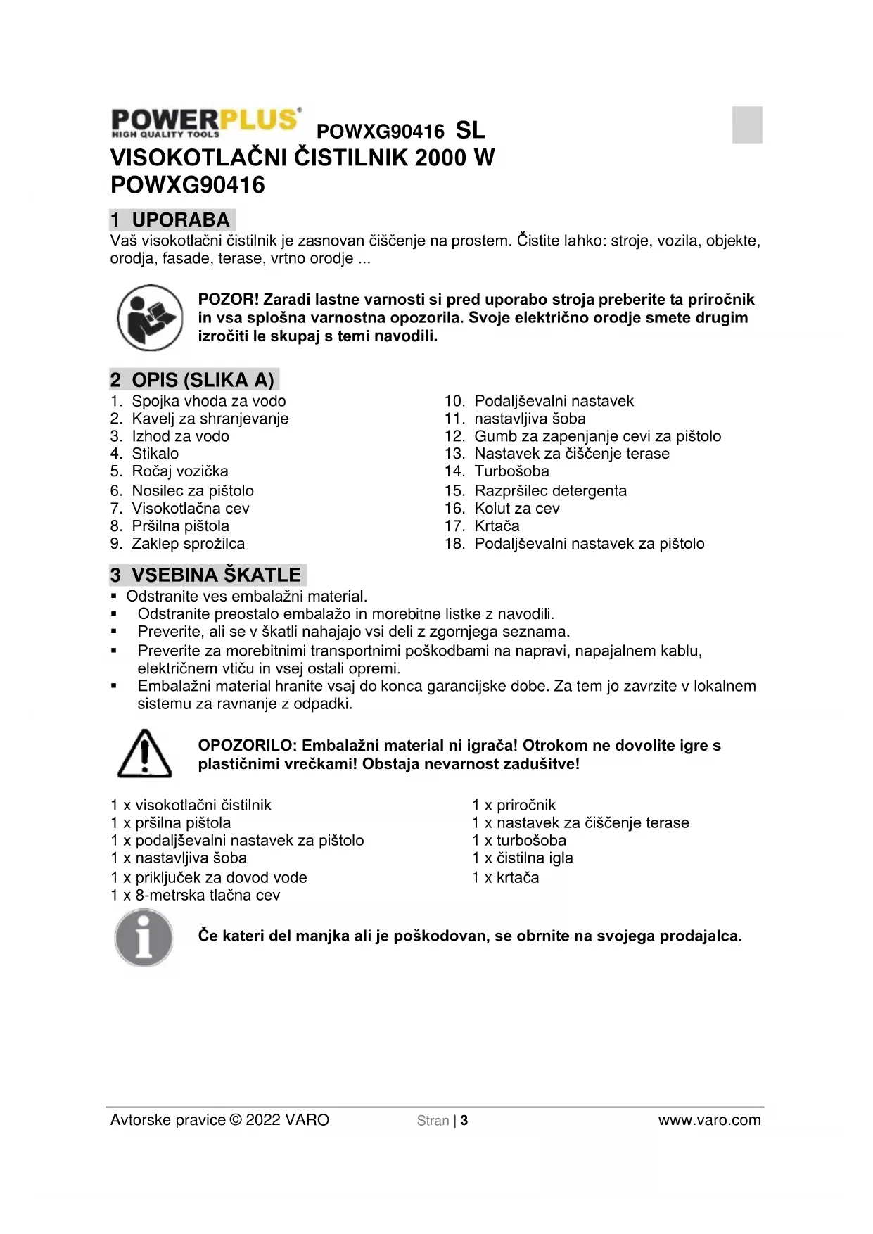 - Visokotlačnega čistilnika ni dovoljeno uporabljati pri temperaturah, nižjih od 0 °C. OPOZORILO: Visokotlačne cevi, fitinge in spojke so pomembne za varnost naprave. Uporabljajte le cevi, fitinge in spojke, ki jih priporoča proizvajalec. OPOZORILO: Neustrezni podaljševalni kabli so lahko nevarni. Kable na kolutih je pred delom zmeraj treba povsem odviti, da preprečimo njihovo pregrevanje.POWXG90416 SL Avtorske pravice © 2022 VARO Stran | 7 www.varo.com
