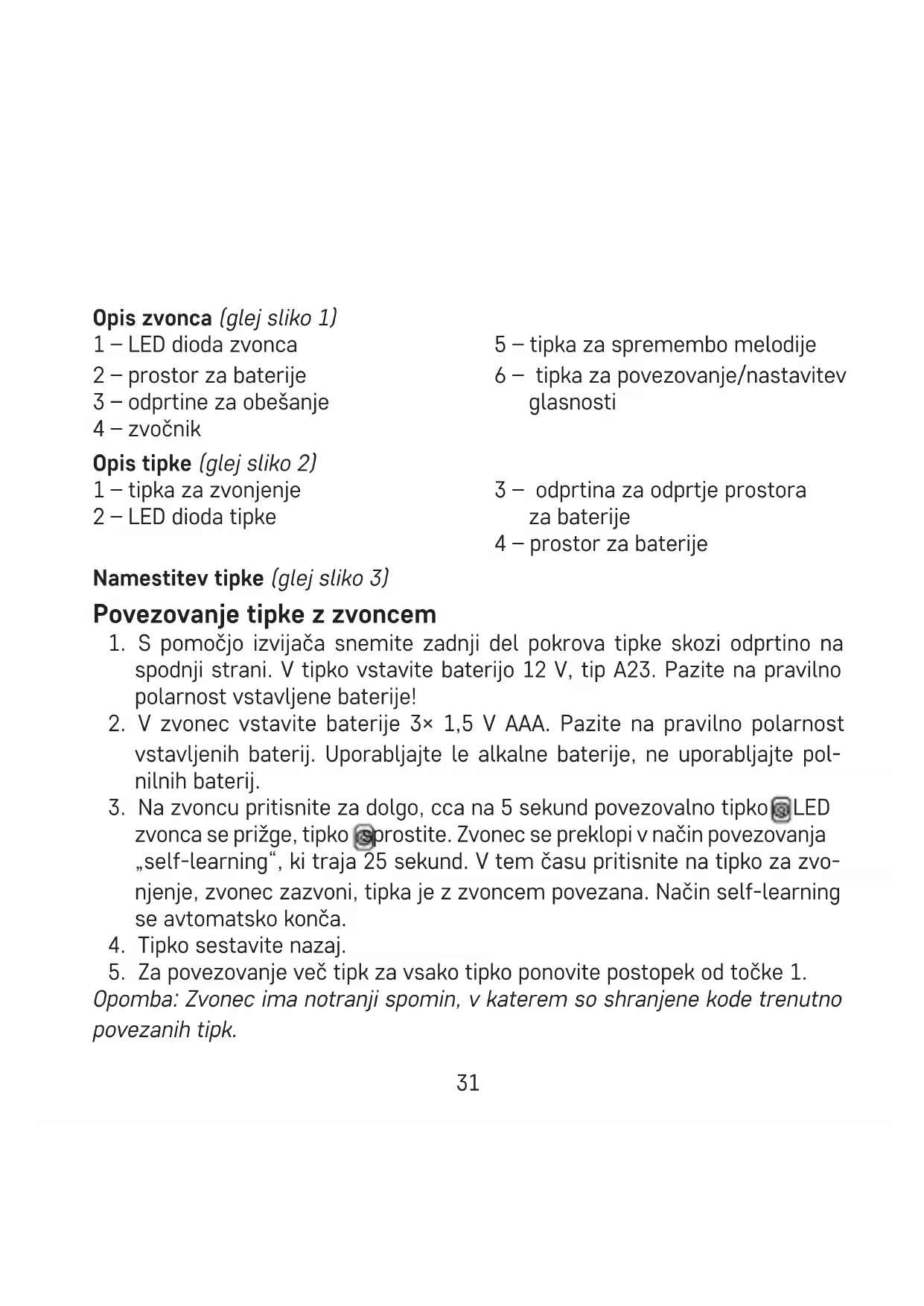 - Če zvonca dalj časa ne uporabljate, baterijo iz tipke zvonca odstranite.