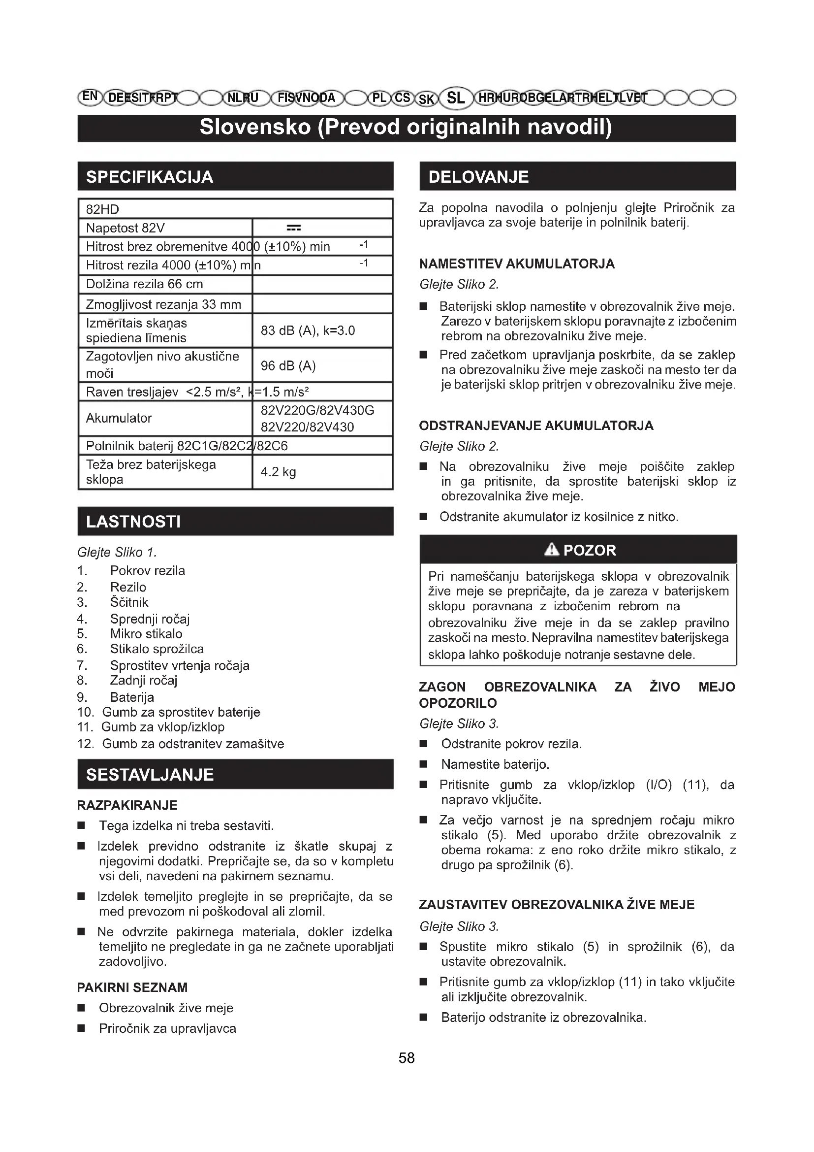 SESTAVLJANJE RAZPAKIRANJE Tega izdelka ni treba sestaviti. Izdelek previdno odstranite iz škatle skupaj z njegovimi dodatki. Prepričajte se, da so v kompletu vsi deli, navedeni na pakirnem seznamu. Izdelek temeljito preglejte in se prepričajte, da se med prevozom ni poškodoval ali zlomil. Ne odvrzite pakirnega materiala, dokler izdelka temeljito ne pregledate in ga ne začnete uporabljati zadovoljivo. PAKIRNI SEZNAM Obrezovalnik žive meje Priročnik za upravljavca DELOVANJE Za popolna navodila o polnjenju glejte Priročnik za upravljavca za svoje baterije in polnilnik baterij. NAMESTITEV AKUMULATORJA Glejte Sliko 2. Baterijski sklop namestite v obrezovalnik žive meje. Zarezo v baterijskem sklopu poravnajte z izbočenim rebrom na obrezovalniku žive meje. Pred začetkom upravljanja poskrbite, da se zaklep na obrezovalniku žive meje zaskoči na mesto ter da je baterijski sklop pritrjen v obrezovalniku žive meje. ODSTRANJEVANJE AKUMULATORJA Glejte Sliko 2. Na obrezovalniku žive meje poiščite zaklep in ga pritisnite, da sprostite baterijski sklop iz obrezovalnika žive meje. Odstranite akumulator iz kosilnice z nitko. POZOR Pri nameščanju baterijskega sklopa v obrezovalnik žive meje se prepričajte, da je zareza v baterijskem sklopu poravnana z izbočenim rebrom na obrezovalniku žive meje in da se zaklep pravilno zaskoči na mesto. Nepravilna namestitev baterijskega sklopa lahko poškoduje notranje sestavne dele.