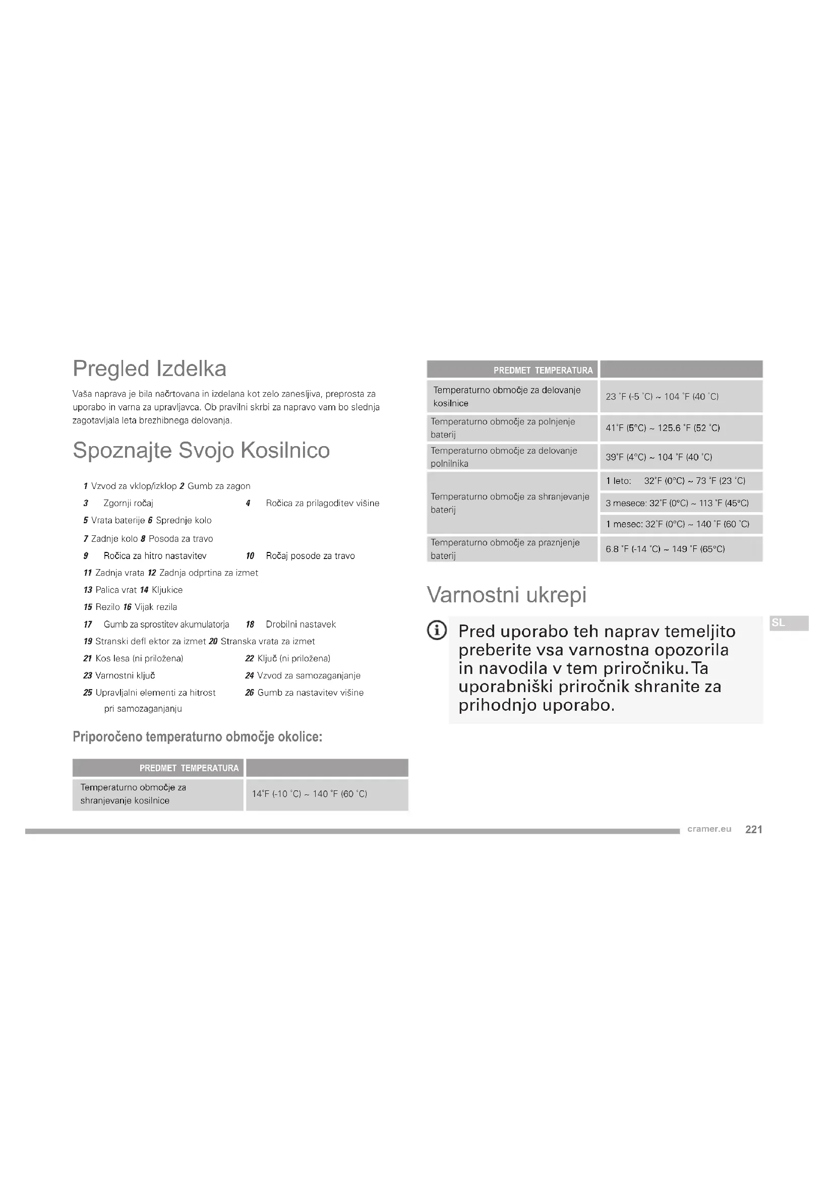 Pregled Izdelka Vaša naprava je bila načrtovana in izdelana kot zelo zanesljiva, preprosta za uporabo in varna za upravljavca. Ob pravilni skrbi za napravo vam bo slednja zagotavljala leta brezhibnega delovanja. Spoznajte Svojo Kosilnico 1 Vzvod za vklop/izklop 2 Gumb za zagon 3 Zgornji ročaj 4 Ročica za prilagoditev višine 5 Vrata baterije 6 Sprednje kolo7 Zadnje kolo 8 Posoda za travo 9 Ročica za hitro nastavitev 10 Ročaj posode za travo 11 Zadnja vrata 12 Zadnja odprtina za izmet13 Palica vrat 14 Kljukice15 Rezilo 16 Vijak rezila 17 Gumb za sprostitev akumulatorja 18 Drobilni nastavek 19 Stranski defl ektor za izmet 20 Stranska vrata za izmet21 Kos lesa (ni priložena)22 Ključ (ni priložena)23 Varnostni ključ24 Vzvod za samozaganjanje25 Upravljalni elementi za hitrost pri samozaganjanju26 Gumb za nastavitev višine Priporočeno temperaturno območje okolice: PREDMET TEMPERATURA Temperaturno območje za shranjevanje kosilnice14˚F (-10 ˚C) ~ 140 ˚F (60 ˚C)PREDMET TEMPERATURA Temperaturno območje za delovanje kosilnice23 ˚F (-5 ˚C) ~ 104 ˚F (40 ˚C)Temperaturno območje za polnjenje baterij 41˚F (5°C) ~ 125.6 ˚F (52 ˚C)Temperaturno območje za delovanje polnilnika 39˚F (4°C) ~ 104 ˚F (40 ˚C)Temperaturno območje za shranjevanje baterij 1 leto: 32˚F (0°C) ~ 73 ˚F (23 ˚C)3 mesece: 32˚F (0°C) ~ 113 ˚F (45°C)1 mesec: 32˚F (0°C) ~ 140 ˚F (60 ˚C)Temperaturno območje za praznjenje baterij 6.8 ˚F (-14 ˚C) ~ 149 ˚F (65°C) Varnostni ukrepi Pred uporabo teh naprav temeljito preberite vsa varnostna opozorila in navodila v tem priročniku. Ta uporabniški priročnik shranite za prihodnjo uporabo.222 cramer.eu