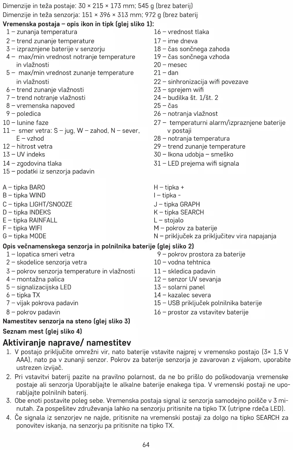 postaje ali senzorja Uporabljajte le alkalne baterije enakega tipa. V vremenski postaji ne upo- rabljajte polnilnih baterij.