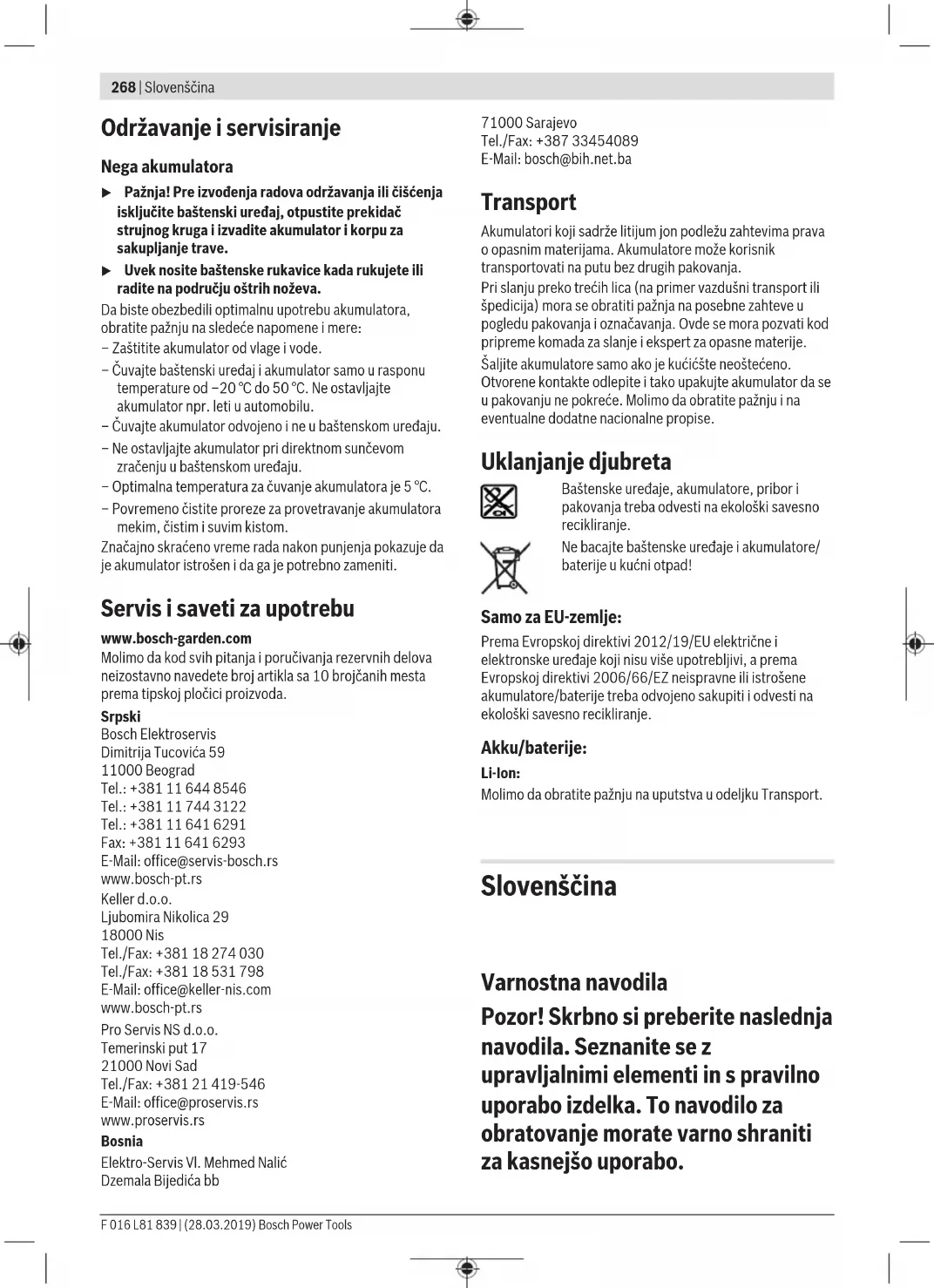 Prikazan ali opisan pribor ni del standardnega obsega dobave. Celoten pribor je del našega programa pribora. Zagon Za vašo varnost u Pozor! Pred začetkom opravil vzdrževanja ali čiščenja izklopite vrtno orodje, izključite odklopnik tokokroga in odstranite akumulatorsko baterijo. Enako velja v primeru, ko je kabel stikala poškodovan, narezan ali zamotan. u Po izključitvi vrtnega orodja se vrtijo noži še nekaj sekund naprej. u Pozor: Ne dotikajte se vrtečega rezalnega noža. Polnjenje akumulatorske baterije u Upoštevajte omrežno napetost! Napetost vira električne energije se mora ujemati s podatki na tipski tablici naprave. Polnilnike, označene z 230 V, lahko priključite tudi na napetost 220 V. Akumulatorska baterija je opremljena z nadzorom temperature, ki dovoljuje polnjenje le v temperaturnem območju med 0 °C in 45 °C. Tako je zagotovljena dolga življenjska doba akumulatorske baterije. Opozorilo: Akumulatorska baterija je pri dobavi delno napolnjena. Da bi lahko akumulatorska baterija razvila svojo polno zmogljivost, jo morate pred prvo uporabo v celoti napolniti v polnilni napravi. Litij-ionsko akumulatorsko baterijo lahko kadarkoli napolnite, ne da bi pri tem skrajšali življenjsko dobo. Prekinitev postopka polnjenja akumulatorske baterije ne poškoduje. Bosch Power Tools F 016 L81 839 | (28.03.2019)276 | Slovenščina Litij-ionska akumulatorska baterija je zaščitena pred prekomerno izpraznitvijo s sistemom elektronske zaščite celic "Electronic Cell Protection (ECP)". Pri izpraznjeni akumulatorski bateriji zaščitno stikalo izklopi napravo: Vrtno orodje preneha delovati. Vklopno/izklopnega stikala po samodejnem izklopu naprave ne smete več pritiskati. S tem lahko poškodujete akumulatorsko baterijo. Upoštevajte navodila za odstranjevanje akumulatorskih baterij. Namestitev/odstranitev akumulatorske baterije Opozorilo: Če uporabljate akumulatorske baterije, ki niso primerne, lahko to povzroči poškodbo naprave. Vstavite napolnjeno akumulatorsko baterijo. Zagotovite, da bo akumulatorska baterija v celoti vstavljena. Za odstranitev akumulatorske baterije iz naprave, pritisnite deblokirno tipko akumulatorske baterije in potegnite akumulatorsko baterijo ven. Postopek polnjenja Polnilni postopek se prične takoj, ko vtaknete omrežni vtič polnilne naprave v vtičnico in vstavite akumulatorsko baterijo v polnilno napravo . Inteligentni postopek polnjenja omogoča takojšnje zaznavanje napolnjenosti akumulatorske baterije in odvisno od temperature in napetosti akumulatorske baterije se bo izbral optimalni polnilni tok. Ta način zagotavlja ohranitev akumulatorske baterije, ki bo pri namestitvi v polnilni napravi vedno do konca napolnjen. Pomen prikazovalnih elementov na polnilni napravi (AL 3620 CV/AL 3640 CV/AL 36V-20) Postopek hitrega polnjenja Postopek hitrega polnjenja se prikaže z utripanjem zelenega prikaza polnjenja akumulatorske baterije. Prikazovalni element na akumulatorski bateriji: Med postopkom napolnitve zasvetijo LED druga za drugo in za kratek čas izginejo. Akumulatorska baterija je v celoti napolnjena, kadar LED trajno svetijo. Pribl. 5minut po polni popolni napolnitvi akumulatorske baterije tri zelene LED ponovno ugasnejo. Opozorilo: Postopek hitrega polnjenja je možen samo, ko se temperatura akumulatorske baterije nahaja v dovoljenem območju temperature, glejte poglavje "Tehnični podatki". Akumulatorska baterija je napolnjena Trajno svetleč zelen prikaz LED signalizira, da je akumulatorska baterija v celoti napolnjena. Dodatno zaslišite za obdobje pribl. 2 sekundi zvočni signal, ki tudi akustično signalizira popolno napolnjenost akumulatorske baterije. Sedaj lahko vzamete akumulatorsko baterijo ven in jo uporabite. Brez vstavljene akumulatorske baterije signalizira trajno svetleč prikaz LED, da je omrežni vtič vstavljen v vtičnico in da je polnilna naprava pripravljena za uporabo. Temperatura akumulatorske baterije pod 0° ali nad 45°C Trajno svetleč rdeč prikaz LED prikazuje, da je temperatura akumulatorske baterije izven dovoljenega temperaturnega območja za polnjenje, glejte odstavek "Tehnični podatki". Pri dosegu dovoljenega območja temperature se polnilna naprava avtomatsko preklopi na postopek za hitro polnjenje. Če se temperatura akumulatorske baterije nahaja zunaj dovoljenega območja temperature za polnjenje, se pri vstavljanju v polnilno napravo zasveti rdeča LED akumulatorske baterije. Polnjenje ni možno Če se pri postopku polnjenja pojavi druga motnja, se to prikaže z utripanjem rdečega prikaza LED. Postopek polnjenja se ne more zagnati in polnjenje akumulatorske baterije ni možno (glejte odsek "Iskanje napak"). Opozorila glede polnjenja Pri neprekinjenih oziroma zaporednih ciklusih polnjenja brez vmesne prekinitve se lahko polnilnik segreje. Vendar to ni problematično in ne pomeni, da ima polnilnik kakšno tehnično okvaro. Močno skrajšan čas delovanja po napolnitvi nakazuje, da je akumulatorska baterija izrabljena in se mora nadomestiti. Upoštevajte navodila za odstranjevanje odsluženih naprav. Hlajenje akumulatorske baterije (Active Air Cooling) Upravljalnik ventilatorja, ki je vgrajen v polnilnik, nadzira temperaturo vstavljene akumulatorske baterije. Če je temperatura akumulatorske baterije nad 30 °C, se akumulatorska baterija ohlajuje s pomočjo ventilatorja na optimalno temperaturo za polnjenje. Ko je ventilator vklopljen, se sliši zvok prezračevalne enote. Če ventilator ne deluje, je temperatura akumulatorske baterije v optimalnem temperaturnem območju za polnjenje ali pa je ventilator v okvari. V tem primeru se podaljša čas polnjenja akumulatorske baterije. Delovna navodila Prikaz napolnjenosti akumulatorske baterije Akumulatorska baterija je obremljena s prikazovalnikom napolnjenosti, ki prikazuje stanje napolnjenosti akumulatorske baterije. Prikazovalnik napolnjenosti sestoji iz 3 zelenih LED. Pritisnite tipko za prikazovalnik stanja napolnjenosti in ga s tem aktivirajte. 5sek. se