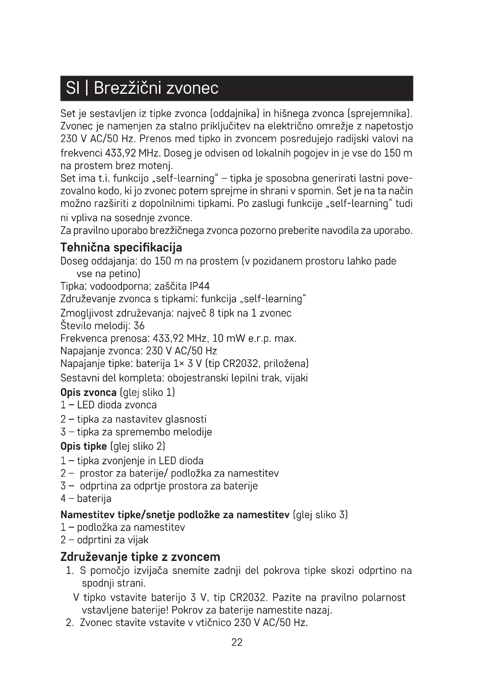 - Zvonec (sprejemnik) je namenjen le za notranjo uporabo v suhih prostorih.
