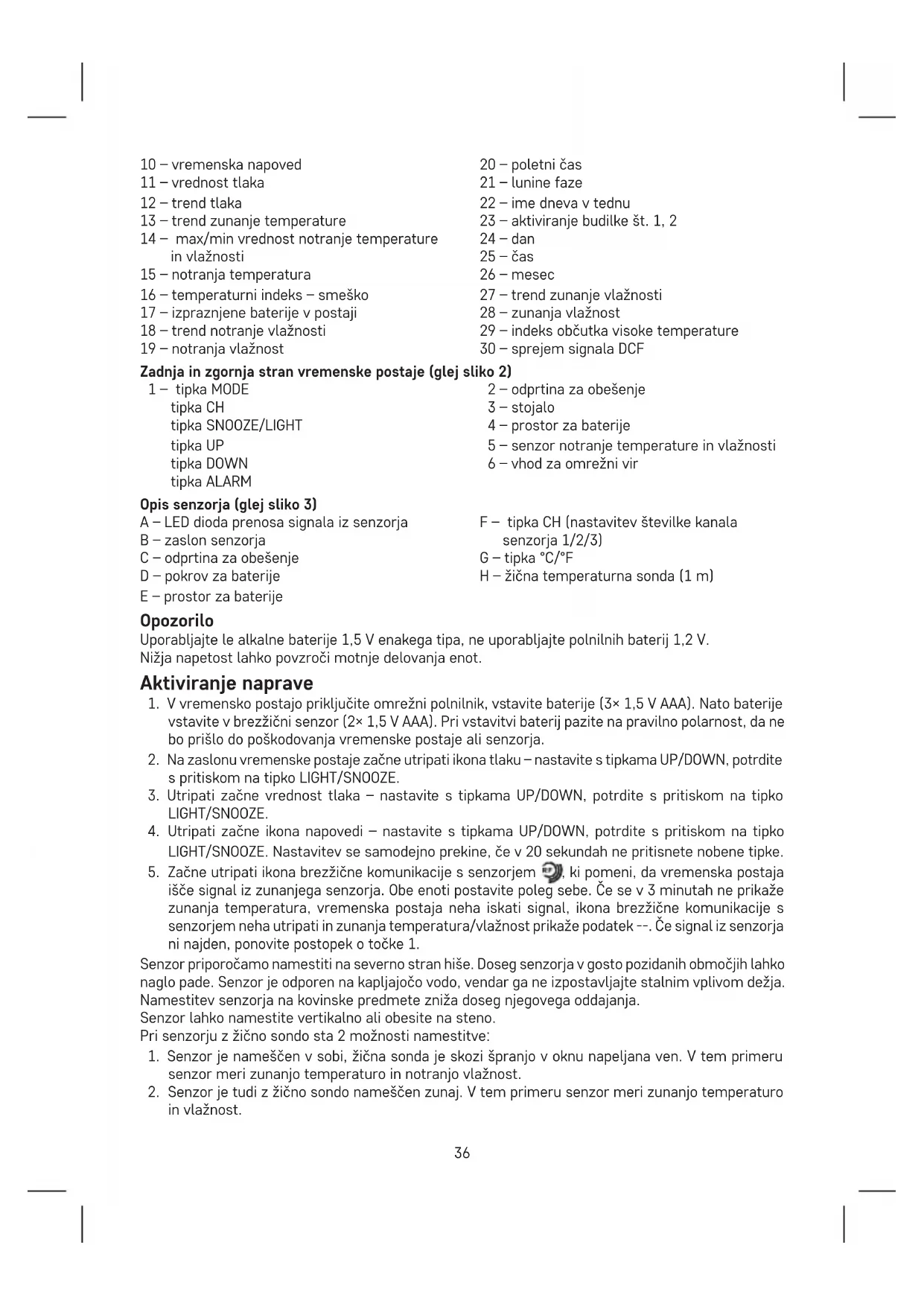 1 – sončno 2 – delno oblačno 3 – oblačno 4 – dež/sneg pri zunanji temperaturi, nižji kot -1°C41 5 – močan dež/sneg pri zunanji temperaturi, nižji kot -1°C 6 – nevihta/sneg pri zunanji temperaturi, nižji kot -1°C Varnostna navodila in opozorila Pred uporabo naprave preučite navodila za uporabo. Upoštevajte varnostne napotke, navedene v teh navodilih. Izdelek je zasnovan tako, da ob primerni uporabi zanesljivo deluje vrsto let.