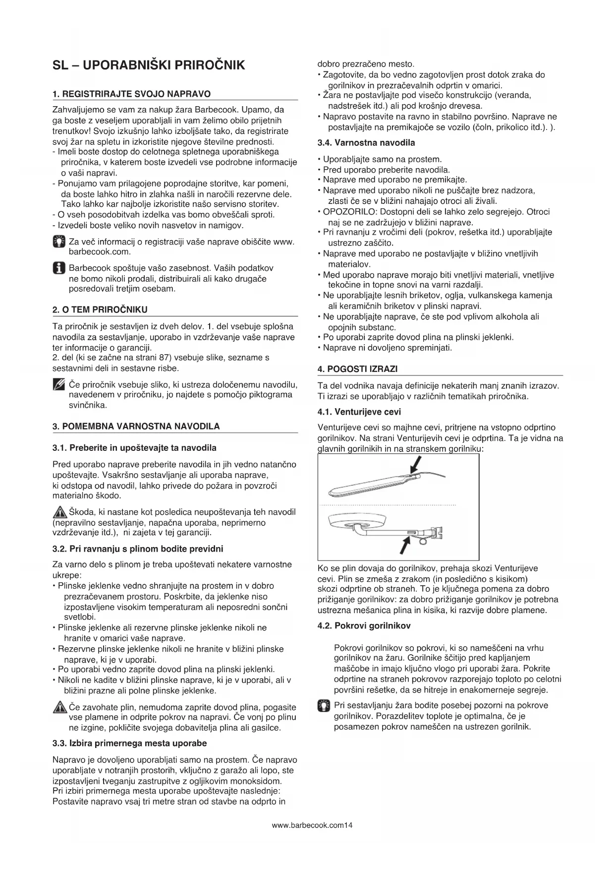 Zahvaljujemo se vam za nakup žara Barbecook. Upamo, da ga boste z veseljem uporabljali in vam želimo obilo prijetnih trenutkov! Svojo izkušnjo lahko izboljšate tako, da registrirate svoj žar na spletu in izkoristite njegove številne prednosti. - Imeli boste dostop do celotnega spletnega uporabniškega priročnika, v katerem boste izvedeli vse podrobne informacije o vaši napravi. - Ponujamo vam prilagojene poprodajne storitve, kar pomeni, da boste lahko hitro in zlahka našli in naročili rezervne dele. Tako lahko kar najbolje izkoristite našo servisno storitev. - O vseh posodobitvah izdelka vas bomo obveščali sproti. - Izvedeli boste veliko novih nasvetov in namigov. Za več informacij o registraciji vaše naprave obiščite www. barbecook.com. Barbecook spoštuje vašo zasebnost. Vaših podatkov ne bomo nikoli prodali, distribuirali ali kako drugače posredovali tretjim osebam.