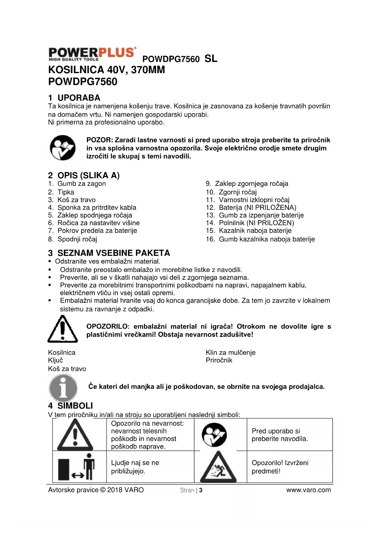 - Nikoli ne kosite, ko se v bližini nahajajo ljudje, še posebej otroci, ali živali.POWDPG7560 SL Avtorske pravice © 2018 VARO Stran | 7 www.varo.com