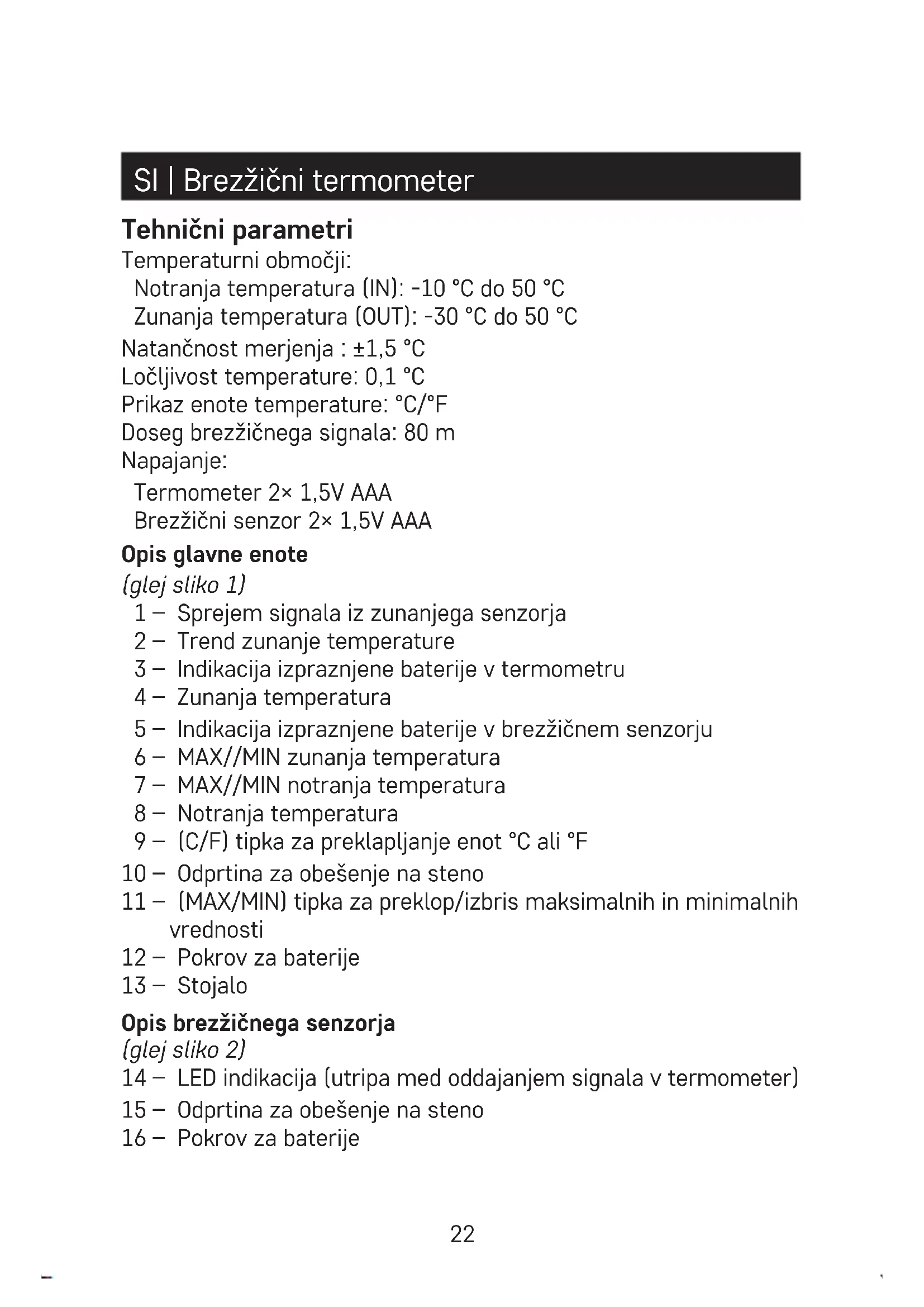 pa bo zunanja temperatura. Opomba: Uporabljajte le alkalne baterije 1,5 V, ne uporabljajte polnil- nih baterij 1,2 V. Nižja napetost lahko povzroči motnje delovanja enot. Pri vstavljanju baterij upoštevajte pravilno polarnost po risbi na prostora za baterije. V primeru, da termometer podatkov iz zunanjega senzorja ne prikazuje, preverite: