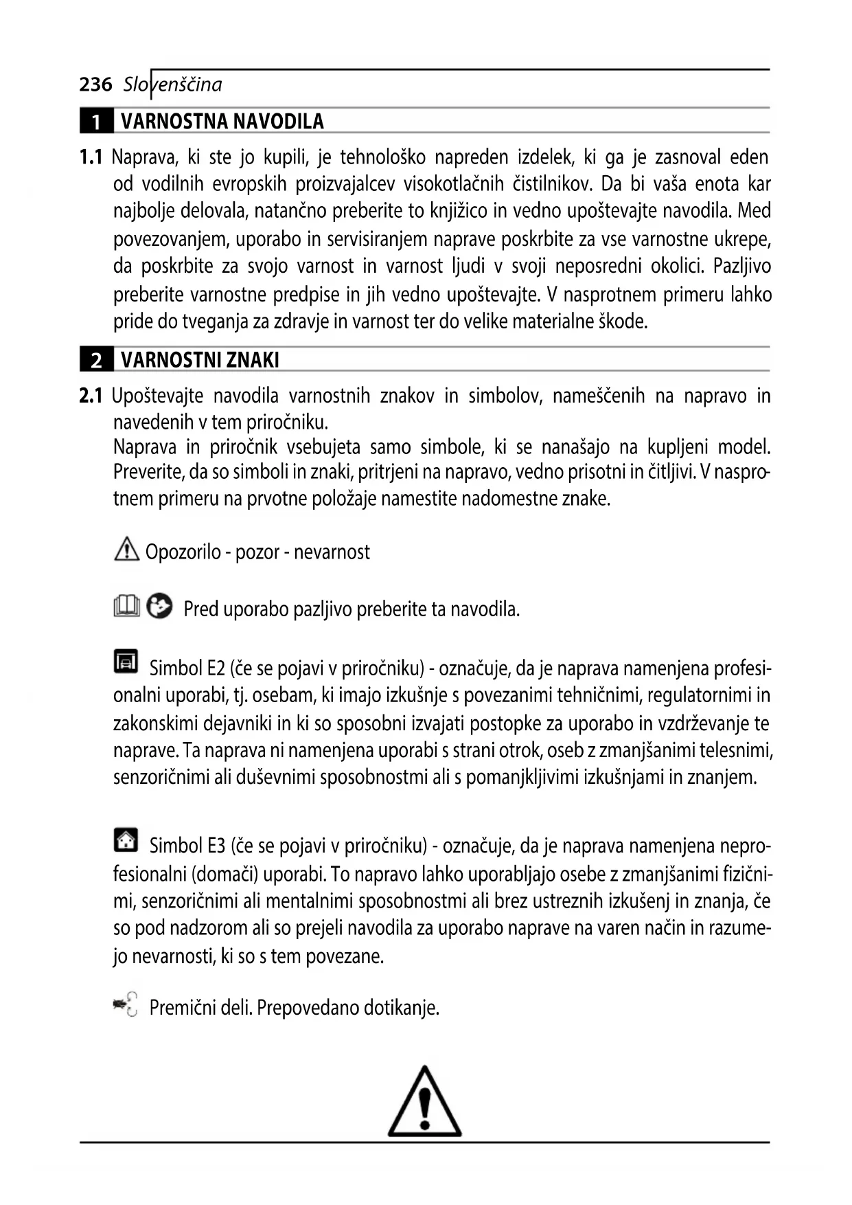 tnem primeru na prvotne položaje namestite nadomestne znake. Opozorilo - pozor - nevarnost Pred uporabo pazljivo preberite ta navodila. Simbol E2 (če se pojavi v priročniku) - označuje, da je naprava namenjena profesi- onalni uporabi, tj. osebam, ki imajo izkušnje s povezanimi tehničnimi, regulatornimi in zakonskimi dejavniki in ki so sposobni izvajati postopke za uporabo in vzdrževanje te naprave. Ta naprava ni namenjena uporabi s strani otrok, oseb z zmanjšanimi telesnimi, senzoričnimi ali duševnimi sposobnostmi ali s pomanjkljivimi izkušnjami in znanjem. Simbol E3 (če se pojavi v priročniku) - označuje, da je naprava namenjena nepro- fesionalni (domači) uporabi. To napravo lahko uporabljajo osebe z zmanjšanimi fizični- mi, senzoričnimi ali mentalnimi sposobnostmi ali brez ustreznih izkušenj in znanja, če so pod nadzorom ali so prejeli navodila za uporabo naprave na varen način in razume- jo nevarnosti, ki so s tem povezane. Premični deli. Prepovedano dotikanje.237Slovenščina 0 Položaj za izklop