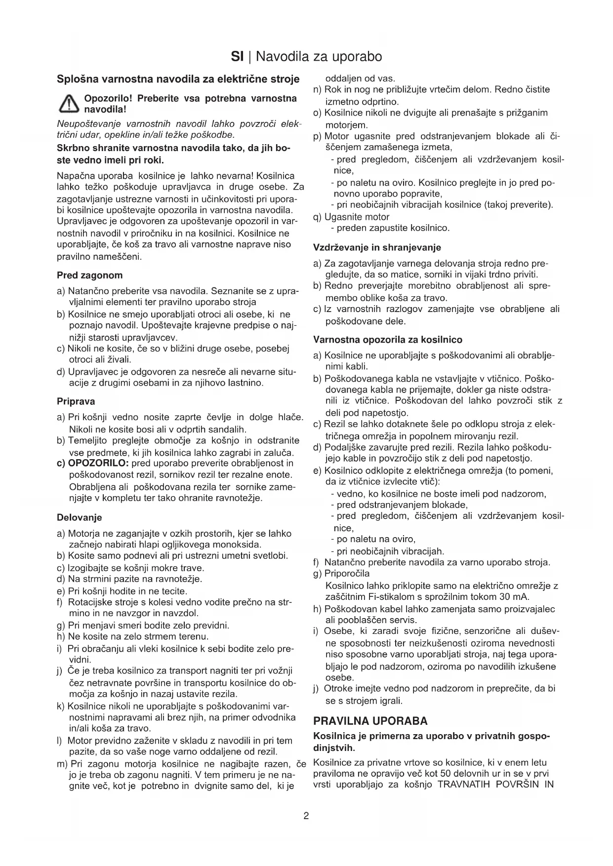 - Montaža koša za travo Nastavitev višine košnje SI-5 Zagon in ustavitev SI-5 Košnja SI-5 Vzdrževanje SI-5 Shranjevanje SI-6 Odpravljanje napak SI-7 Izjava o skladnosti SI-8 Prevod originalnega navodila za uporabo2 SI | Navodila za uporabo Splošna varnostna navodila za električne stroje Opozorilo! Preberite vsa potrebna varnostna navodila! Neupoštevanje varnostnih navodil lahko povzroči elek- trični udar, opekline in/ali težke poškodbe. Skrbno shranite varnostna navodila tako, da jih bo- ste vedno imeli pri roki. Napačna uporaba kosilnice je lahko nevarna! Kosilnica lahko težko poškoduje upravljavca in druge osebe. Za zagotavljanje ustrezne varnosti in učinkovitosti pri upora- bi kosilnice upoštevajte opozorila in varnostna navodila. Upravljavec je odgovoren za upoštevanje opozoril in var- nostnih navodil v priročniku in na kosilnici. Kosilnice ne uporabljajte, če koš za travo ali varnostne naprave niso pravilno nameščeni. Pred zagonom a) Natančno preberite vsa navodila. Seznanite se z upra- vljalnimi elementi ter pravilno uporabo stroja b) Kosilnice ne smejo uporabljati otroci ali osebe, ki ne poznajo navodil. Upoštevajte krajevne predpise o naj- nižji starosti upravljavcev. c) Nikoli ne kosite, če so v bližini druge osebe, posebej otroci ali živali. d) Upravljavec je odgovoren za nesreče ali nevarne situ- acije z drugimi osebami in za njihovo lastnino. Priprava a) Pri košnji vedno nosite zaprte čevlje in dolge hlače. Nikoli ne kosite bosi ali v odprtih sandalih. b) Temeljito preglejte območje za košnjo in odstranite vse predmete, ki jih kosilnica lahko zagrabi in zaluča. c) OPOZORILO: pred uporabo preverite obrabljenost in poškodovanost rezil, sornikov rezil ter rezalne enote. Obrabljena ali poškodovana rezila ter sornike zame- njajte v kompletu ter tako ohranite ravnotežje. Delovanje a) Motorja ne zaganjajte v ozkih prostorih, kjer se lahko začnejo nabirati hlapi ogljikovega monoksida. b) Kosite samo podnevi ali pri ustrezni umetni svetlobi. c) Izogibajte se košnji mokre trave. d) Na strmini pazite na ravnotežje. e) Pri košnji hodite in ne tecite. f) Rotacijske stroje s kolesi vedno vodite prečno na str- mino in ne navzgor in navzdol. g) Pri menjavi smeri bodite zelo previdni. h) Ne kosite na zelo strmem terenu.