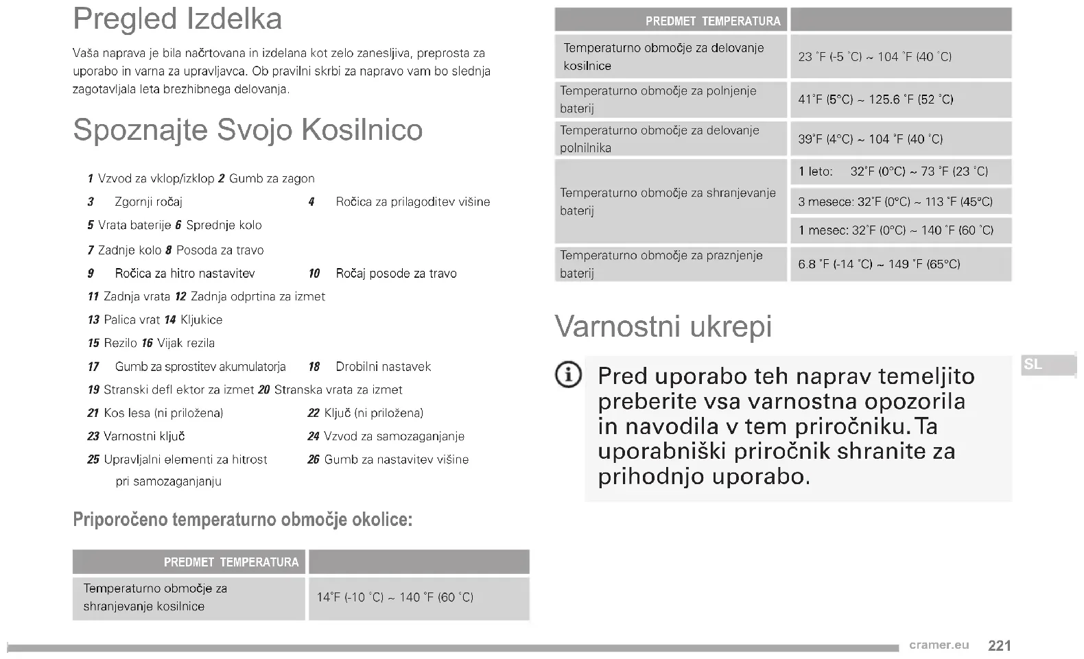 Pregled Izdelka Vaša naprava je bila načrtovana in izdelana kot zelo zanesljiva, preprosta za uporabo in varna za upravljavca. Ob pravilni skrbi za napravo vam bo slednja zagotavljala leta brezhibnega delovanja. Spoznajte Svojo Kosilnico 1 Vzvod za vklop/izklop 2 Gumb za zagon 3 Zgornji ročaj 4 Ročica za prilagoditev višine 5 Vrata baterije 6 Sprednje kolo7 Zadnje kolo 8 Posoda za travo 9 Ročica za hitro nastavitev 10 Ročaj posode za travo 11 Zadnja vrata 12 Zadnja odprtina za izmet13 Palica vrat 14 Kljukice15 Rezilo 16 Vijak rezila 17 Gumb za sprostitev akumulatorja 18 Drobilni nastavek 19 Stranski defl ektor za izmet 20 Stranska vrata za izmet21 Kos lesa (ni priložena)22 Ključ (ni priložena)23 Varnostni ključ24 Vzvod za samozaganjanje25 Upravljalni elementi za hitrost pri samozaganjanju26 Gumb za nastavitev višine Priporočeno temperaturno območje okolice: PREDMET TEMPERATURA Temperaturno območje za shranjevanje kosilnice14˚F (-10 ˚C) ~ 140 ˚F (60 ˚C)PREDMET TEMPERATURA Temperaturno območje za delovanje kosilnice23 ˚F (-5 ˚C) ~ 104 ˚F (40 ˚C)Temperaturno območje za polnjenje baterij 41˚F (5°C) ~ 125.6 ˚F (52 ˚C)Temperaturno območje za delovanje polnilnika 39˚F (4°C) ~ 104 ˚F (40 ˚C)Temperaturno območje za shranjevanje baterij 1 leto: 32˚F (0°C) ~ 73 ˚F (23 ˚C)3 mesece: 32˚F (0°C) ~ 113 ˚F (45°C)1 mesec: 32˚F (0°C) ~ 140 ˚F (60 ˚C)Temperaturno območje za praznjenje baterij 6.8 ˚F (-14 ˚C) ~ 149 ˚F (65°C) Varnostni ukrepi Pred uporabo teh naprav temeljito preberite vsa varnostna opozorila in navodila v tem priročniku. Ta uporabniški priročnik shranite za prihodnjo uporabo.222 cramer.eu