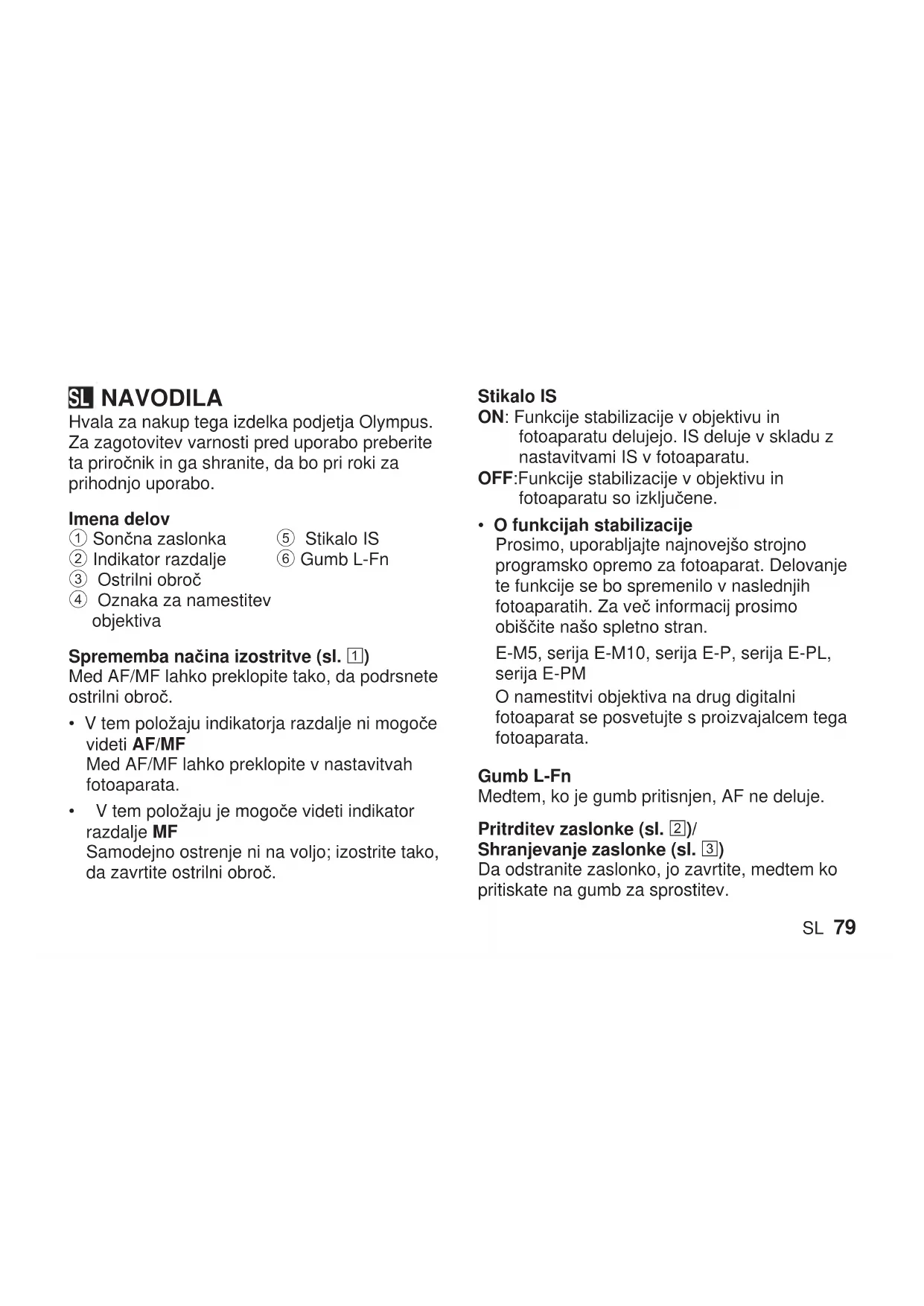 - O funkcijah stabilizacije Prosimo, uporabljajte najnovejšo strojno programsko opremo za fotoaparat. Delovanje te funkcije se bo spremenilo v naslednjih fotoaparatih. Za več informacij prosimo obiščite našo spletno stran. E-M5, serija E-M10, serija E-P, serija E-PL, serija E-PM O namestitvi objektiva na drug digitalni fotoaparat se posvetujte s proizvajalcem tega fotoaparata. Gumb L-Fn Medtem, ko je gumb pritisnjen, AF ne deluje. Pritrditev zaslonke (sl. 2)/ Shranjevanje zaslonke (sl. 3) Da odstranite zaslonko, jo zavrtite, medtem ko pritiskate na gumb za sprostitev. SL80 SL Opombe k fotografiranju