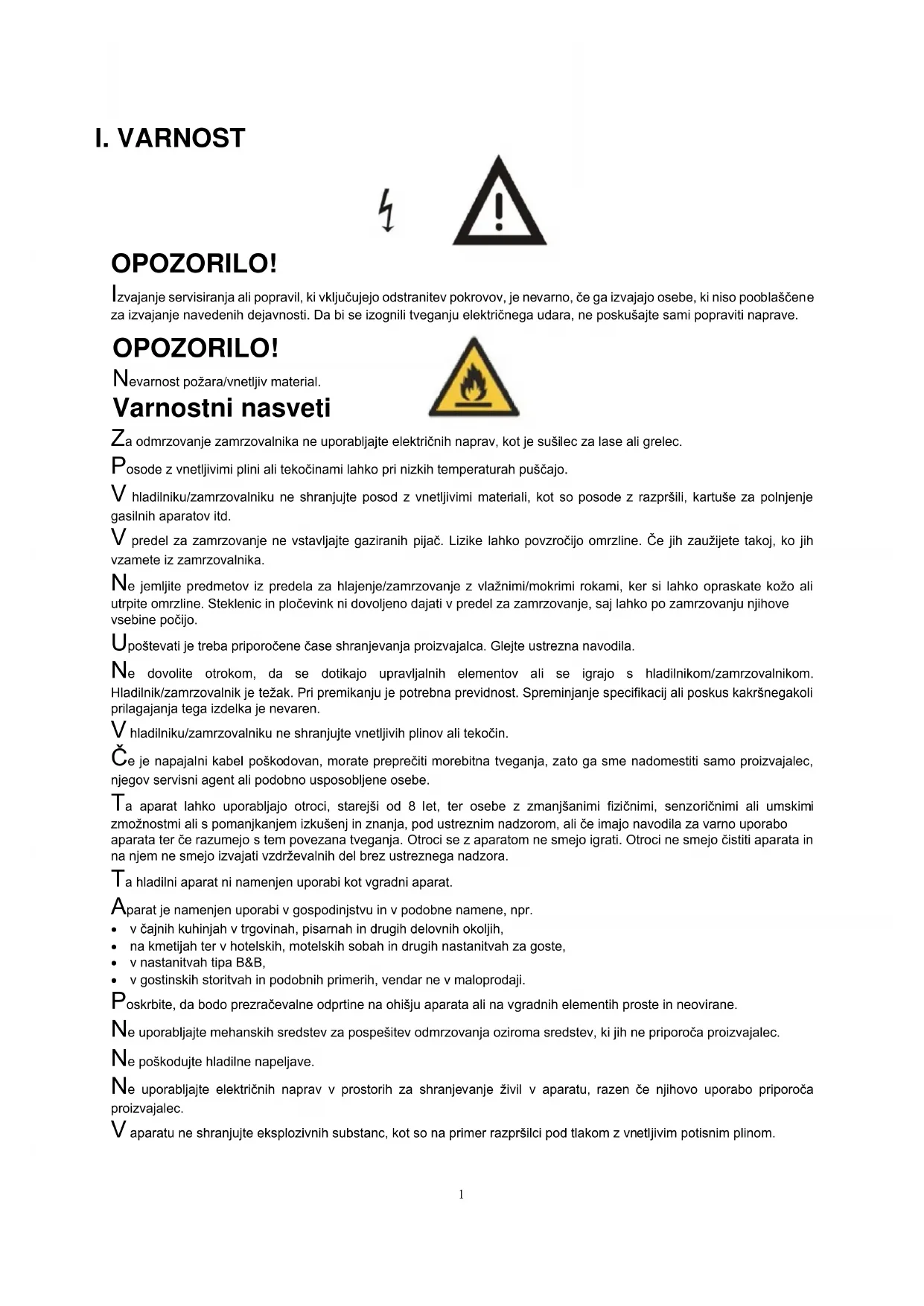 OPOZORILO! Izvajanje servisiranja ali popravil, ki vključujejo odstranitev pokrovov, je nevarno, če ga izvajajo osebe, ki niso pooblaščene za izvajanje navedenih dejavnosti. Da bi se izognili tveganju električnega udara, ne poskušajte sami popraviti naprave. OPOZORILO! Nevarnost požara/vnetljiv material. Varnostni nasveti Za odmrzovanje zamrzovalnika ne uporabljajte električnih naprav, kot je sušilec za lase ali grelec. Posode z vnetljivimi plini ali tekočinami lahko pri nizkih temperaturah puščajo. V hladilniku/zamrzovalniku ne shranjujte posod z vnetljivimi materiali, kot so posode z razpršili, kartuše za polnjenje gasilnih aparatov itd. V predel za zamrzovanje ne vstavljajte gaziranih pijač. Lizike lahko povzročijo omrzline. Če jih zaužijete takoj, ko jih vzamete iz zamrzovalnika. Ne jemljite predmetov iz predela za hlajenje/zamrzovanje z vlažnimi/mokrimi rokami, ker si lahko opraskate kožo ali utrpite omrzline. Steklenic in pločevink ni dovoljeno dajati v predel za zamrzovanje, saj lahko po zamrzovanju njihove vsebine počijo. Upoštevati je treba priporočene čase shranjevanja proizvajalca. Glejte ustrezna navodila. Ne dovolite otrokom, da se dotikajo upravljalnih elementov ali se igrajo s hladilnikom/zamrzovalnikom. Hladilnik/zamrzovalnik je težak. Pri premikanju je potrebna previdnost. Spreminjanje specifikacij ali poskus kakršnegakoli prilagajanja tega izdelka je nevaren. V hladilniku/zamrzovalniku ne shranjujte vnetljivih plinov ali tekočin. Če je napajalni kabel poškodovan, morate preprečiti morebitna tveganja, zato ga sme nadomestiti samo proizvajalec, njegov servisni agent ali podobno usposobljene osebe. Ta aparat lahko uporabljajo otroci, starejši od 8 let, ter osebe z zmanjšanimi fizičnimi, senzoričnimi ali umskimi zmožnostmi ali s pomanjkanjem izkušenj in znanja, pod ustreznim nadzorom, ali če imajo navodila za varno uporabo aparata ter če razumejo s tem povezana tveganja. Otroci se z aparatom ne smejo igrati. Otroci ne smejo čistiti aparata in na njem ne smejo izvajati vzdrževalnih del brez ustreznega nadzora. Ta hladilni aparat ni namenjen uporabi kot vgradni aparat. Aparat je namenjen uporabi v gospodinjstvu in v podobne namene, npr.