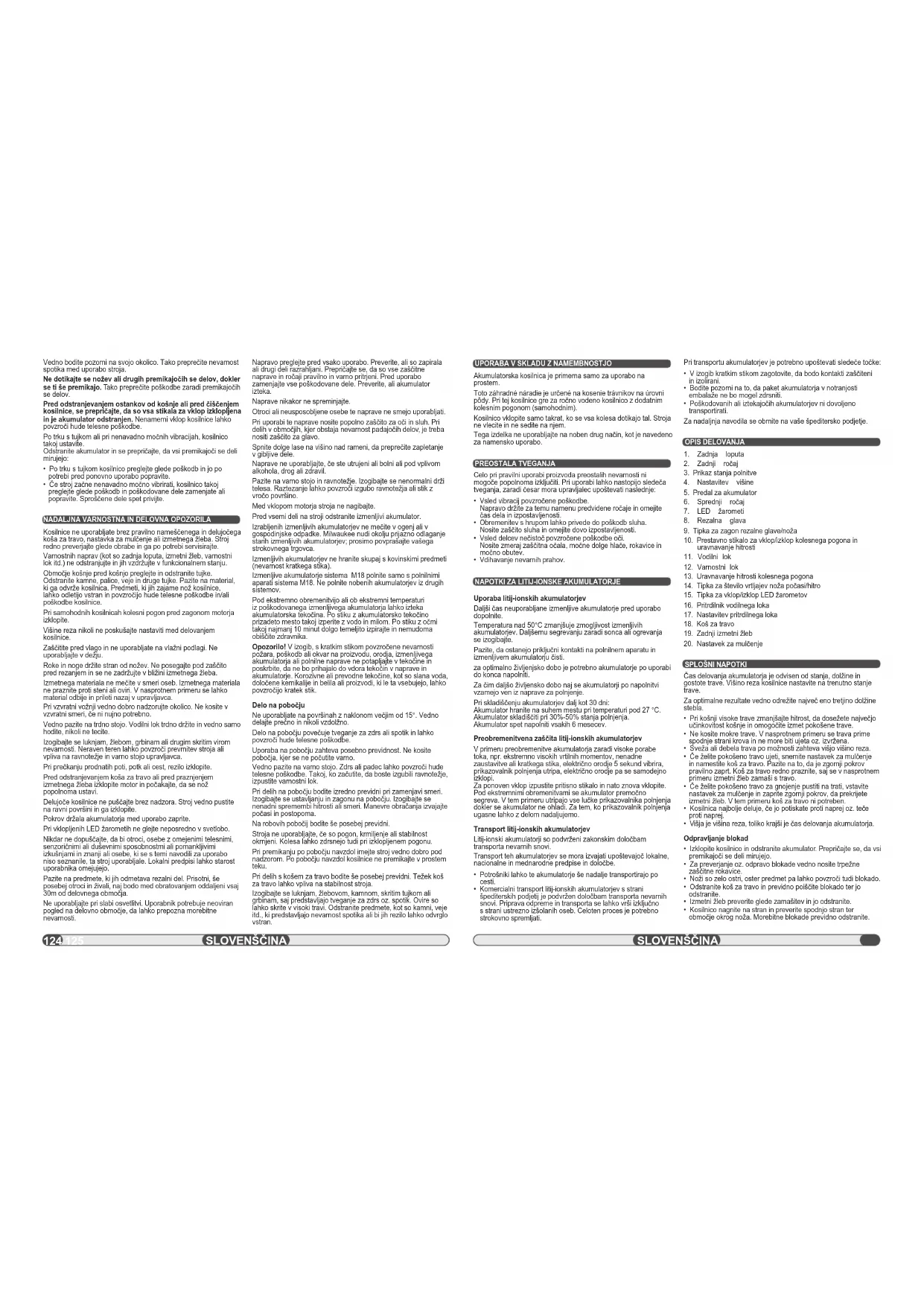 Uporaba litij-ionskih akumulatorjev Daljši čas neuporabljane izmenljive akumulatorje pred uporabo dopolnite. Temperatura nad 50°C zmanjšuje zmogljivost izmenljivih akumulatorjev. Daljšemu segrevanju zaradi sonca ali ogrevanja se izogibajte. Pazite, da ostanejo priključni kontakti na polnilnem aparatu in izmenljivem akumulatorju čisti. za optimalno življenjsko dobo je potrebno akumulatorje po uporabi do konca napolniti. Za čim daljšo življensko dobo naj se akumulatorji po napolnitvi vzamejo ven iz naprave za polnjenje. Pri skladiščenju akumulatorjev dalj kot 30 dni: Akumulator hranite na suhem mestu pri temperaturi pod 27 °C. Akumulator skladiščiti pri 30%-50% stanja polnjenja. Akumulator spet napolniti vsakih 6 mesecev. Preobremenitvena zaščita litij-ionskih akumulatorjev V primeru preobremenitve akumulatorja zaradi visoke porabe toka, npr. ekstremno visokih vrtilnih momentov, nenadne zaustavitve ali kratkega stika, električno orodje 5 sekund vibrira, prikazovalnik polnjenja utripa, električno orodje pa se samodejno izklopi. Za ponoven vklop izpustite pritisno stikalo in nato znova vklopite. Pod ekstremnimi obremenitvami se akumulator premočno segreva. V tem primeru utripajo vse lučke prikazovalnika polnjenja dokler se akumulator ne ohladi. Za tem, ko prikazovalnik polnjenja ugasne lahko z delom nadaljujemo. Transport litij-ionskih akumulatorjev Litij-ionski akumulatorji so podvrženi zakonskim določbam transporta nevarnih snovi. Transport teh akumulatorjev se mora izvajati upoštevajoč lokalne, nacionalne in mednarodne predpise in določbe.
